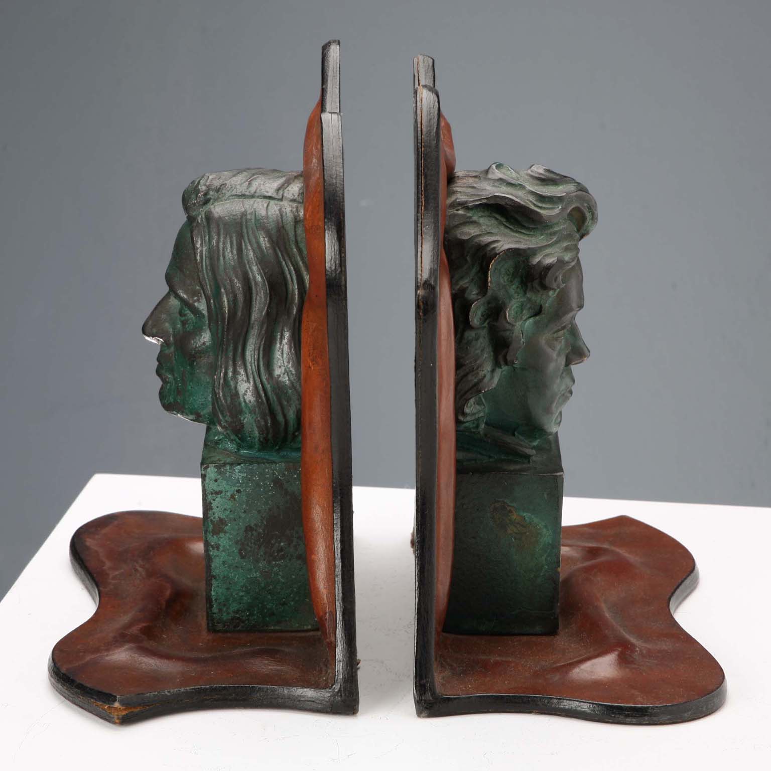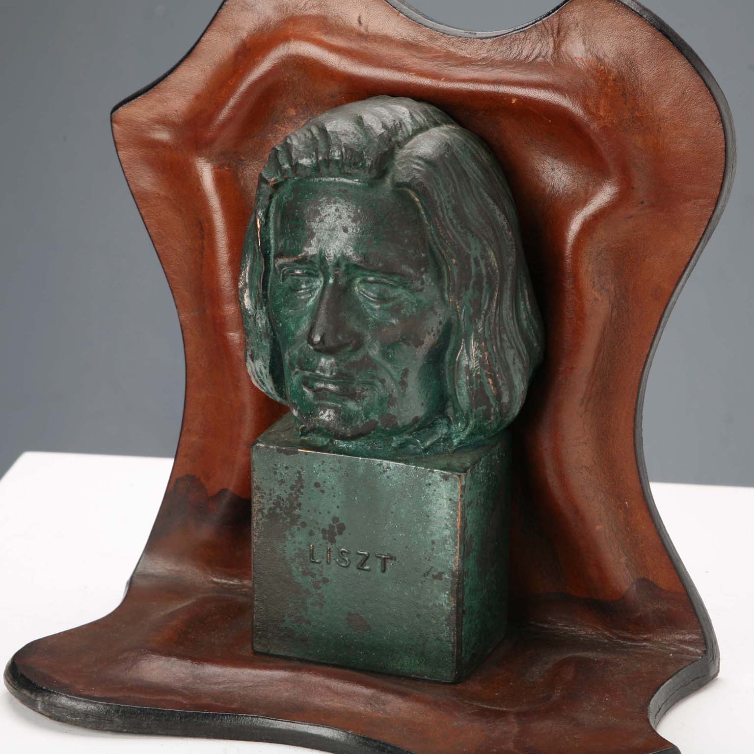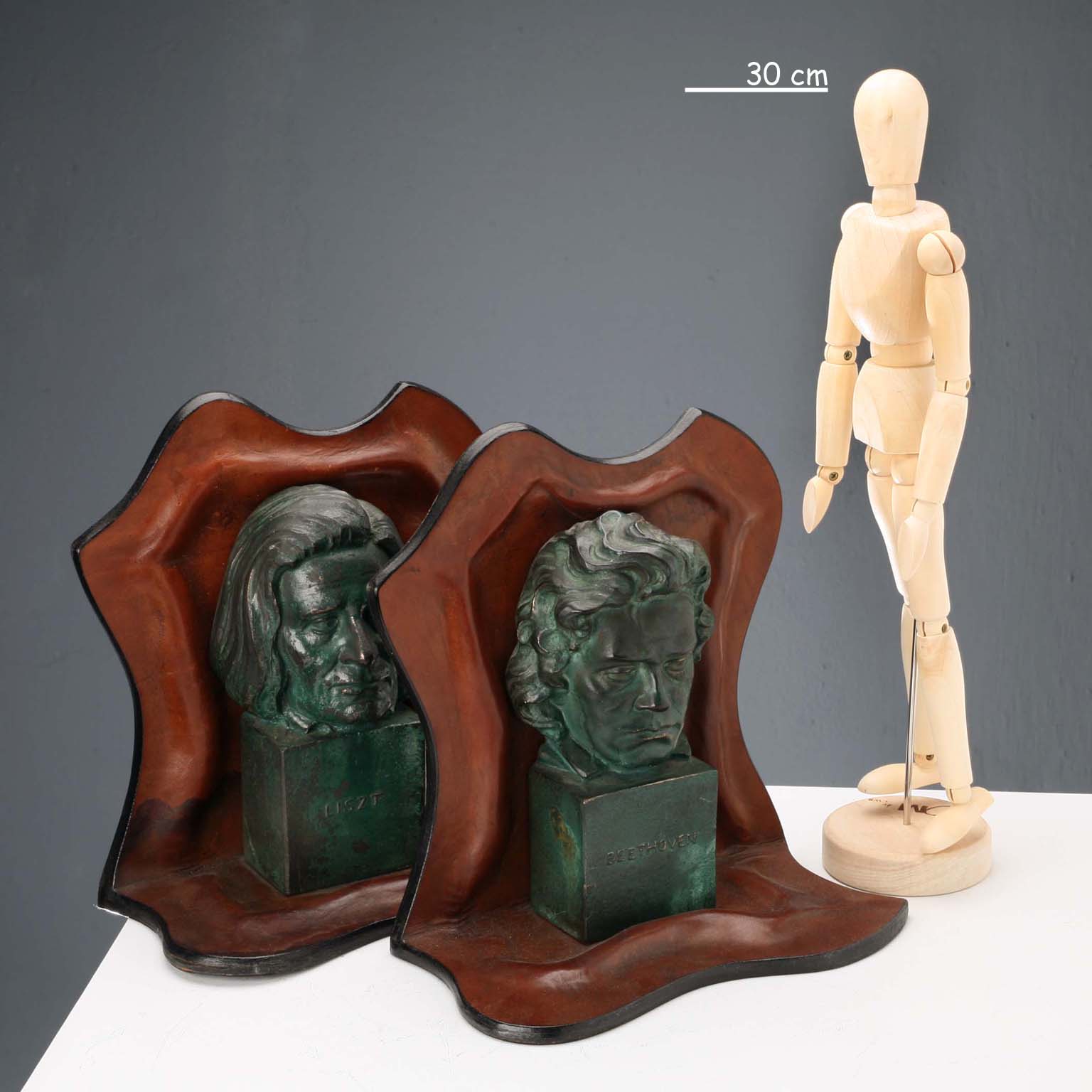 Ein Paar lederne Buchstützen mit Bronzeskulpturen, die die Gesichter der Komponisten Liszt und Beethoven darstellen.