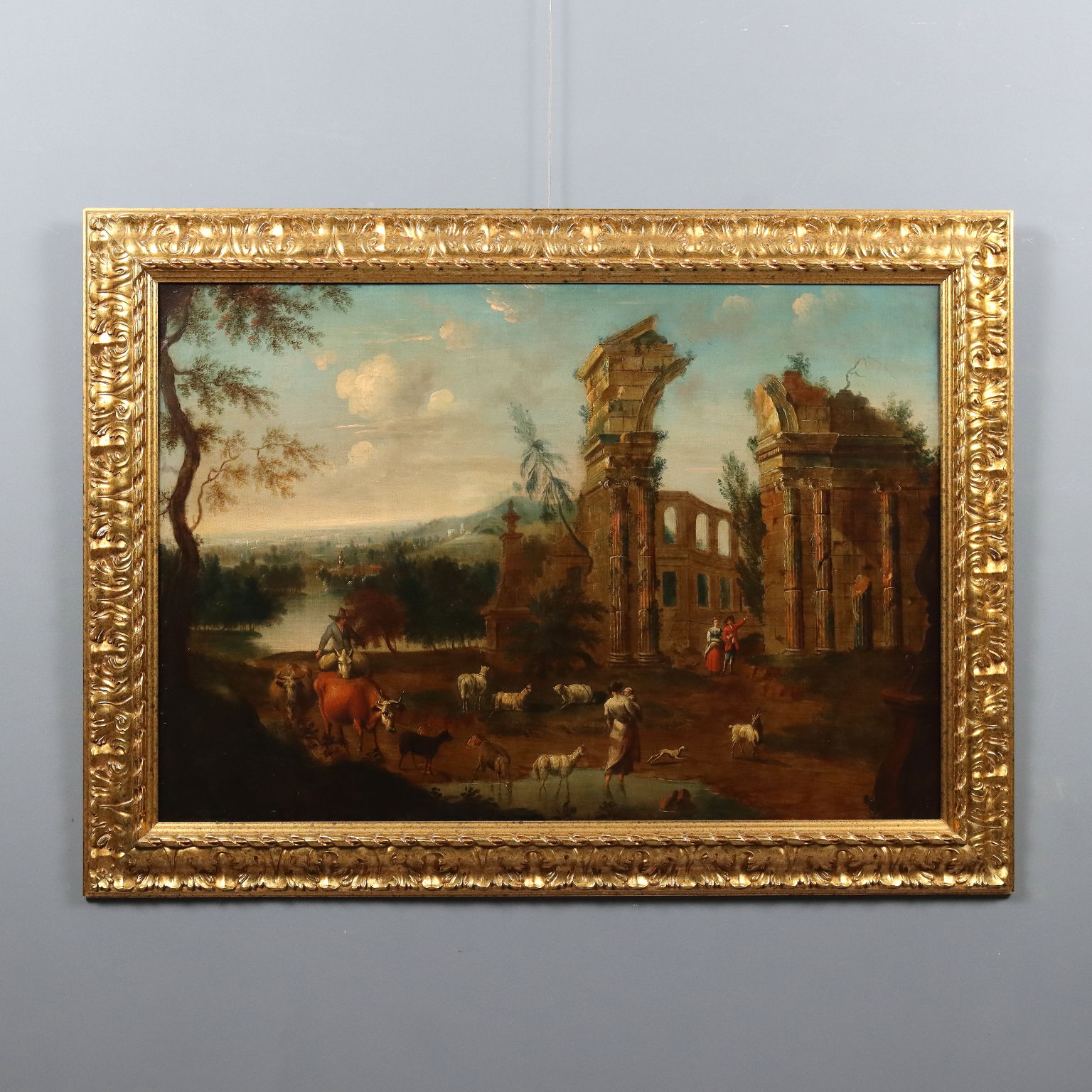 Öl auf Leinwand. Flämische Schule, 18. Jahrhundert. Das Werk wurde 1991 bei einer Christie’s-Auktion dem Umkreis von Hendrick Mommers (1623–1693) zugeschrieben. Es zeigt ein klassisches Architektur-Capriccio, eine weite Landschaft mit den Ruinen eines majestätischen klassizistischen Gebäudes. Zahlreiche Figuren schreiten auf dem Weg vor den Ruinen entlang: ein Hirte mit seiner Herde, eine Frau mit einem Kind und ein Paar bei einem romantischen Spaziergang. Das Gemälde befindet sich noch auf der Originalleinwand und ist in exzellentem Zustand. Es ist in einem vergoldeten Rahmen aus der damaligen Zeit gefasst.