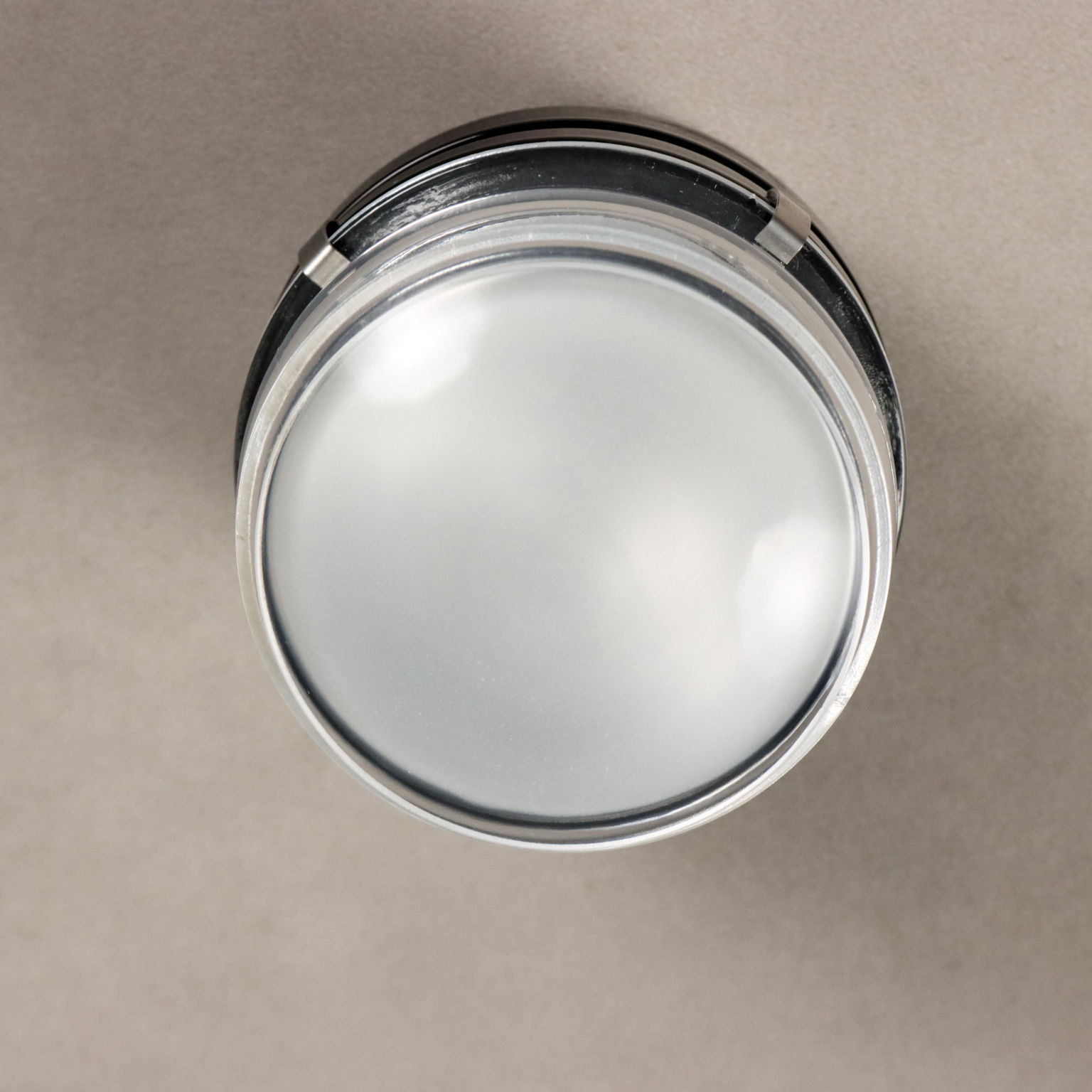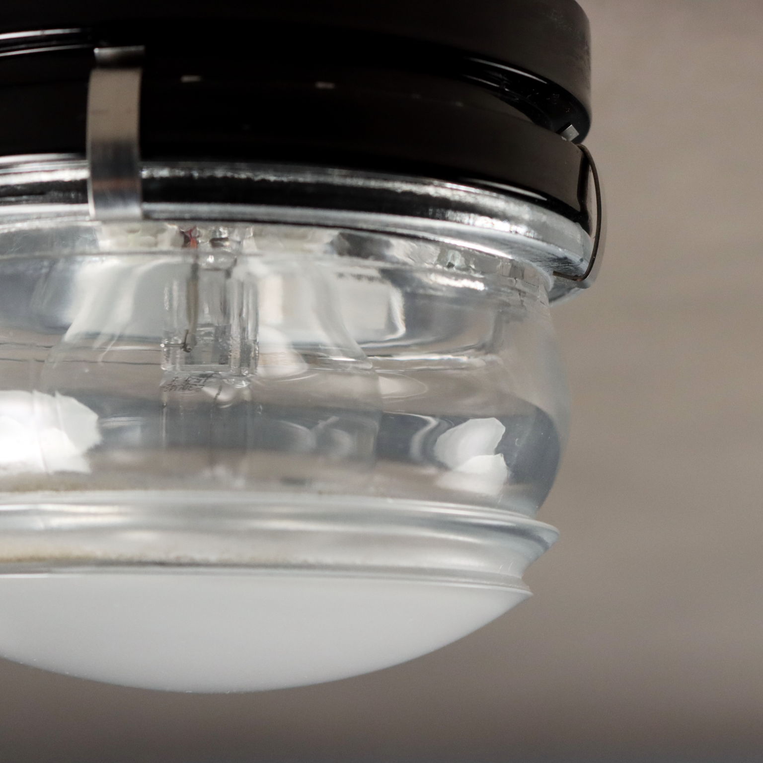 Dieses Set aus Decken- oder Wandleuchten für den Innen- und Außenbereich wurde in den 1960er-Jahren von Joe Colombo entworfen. Die Leuchten zeichnen sich durch ein schwarz emailliertes Metallgehäuse und einen Fresnel-Linsen-Glasdiffusor aus. Eine E14-Fassung ist im Lieferumfang enthalten.