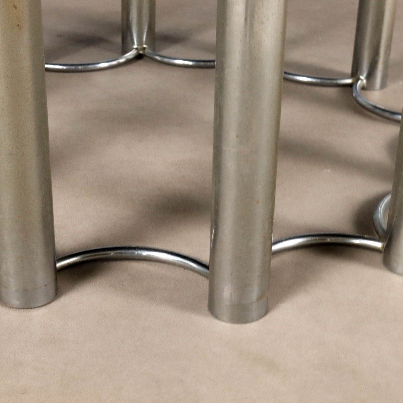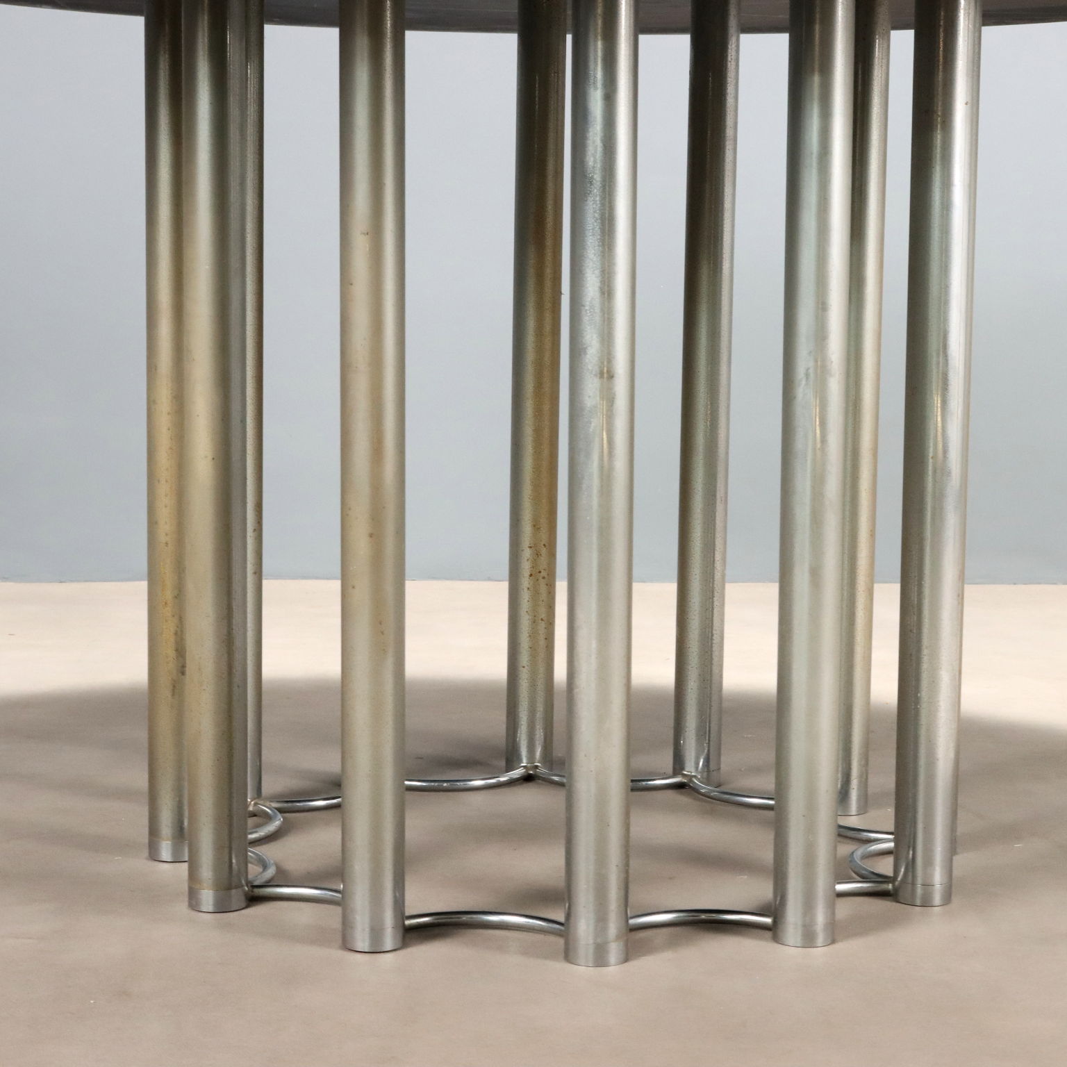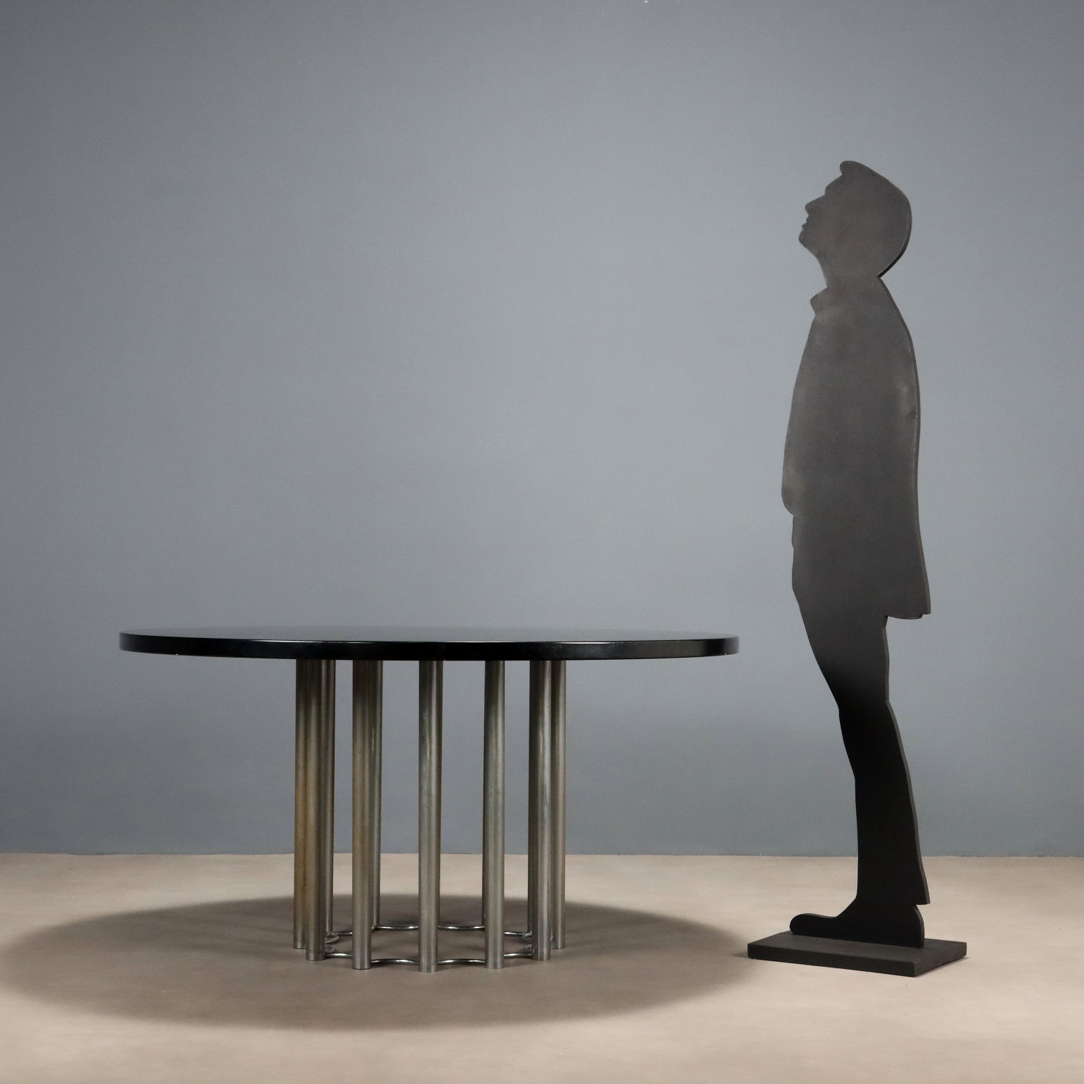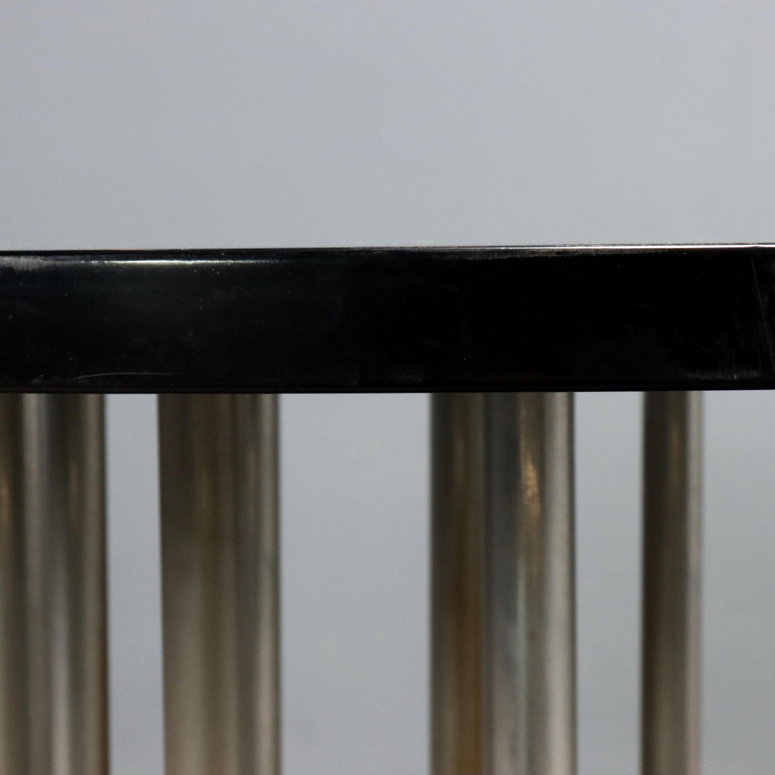Vintage-Esstisch mit runder Tischplatte aus schwarz lackiertem Holz und verchromtem Metallbein.