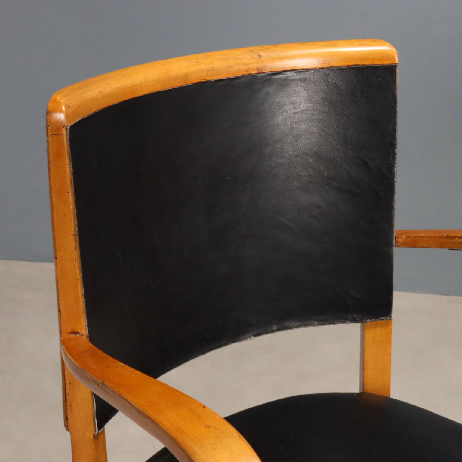 Drehstuhl mit Holzrahmen, Sitzfläche und Rückenlehne aus schwarzem Skai.