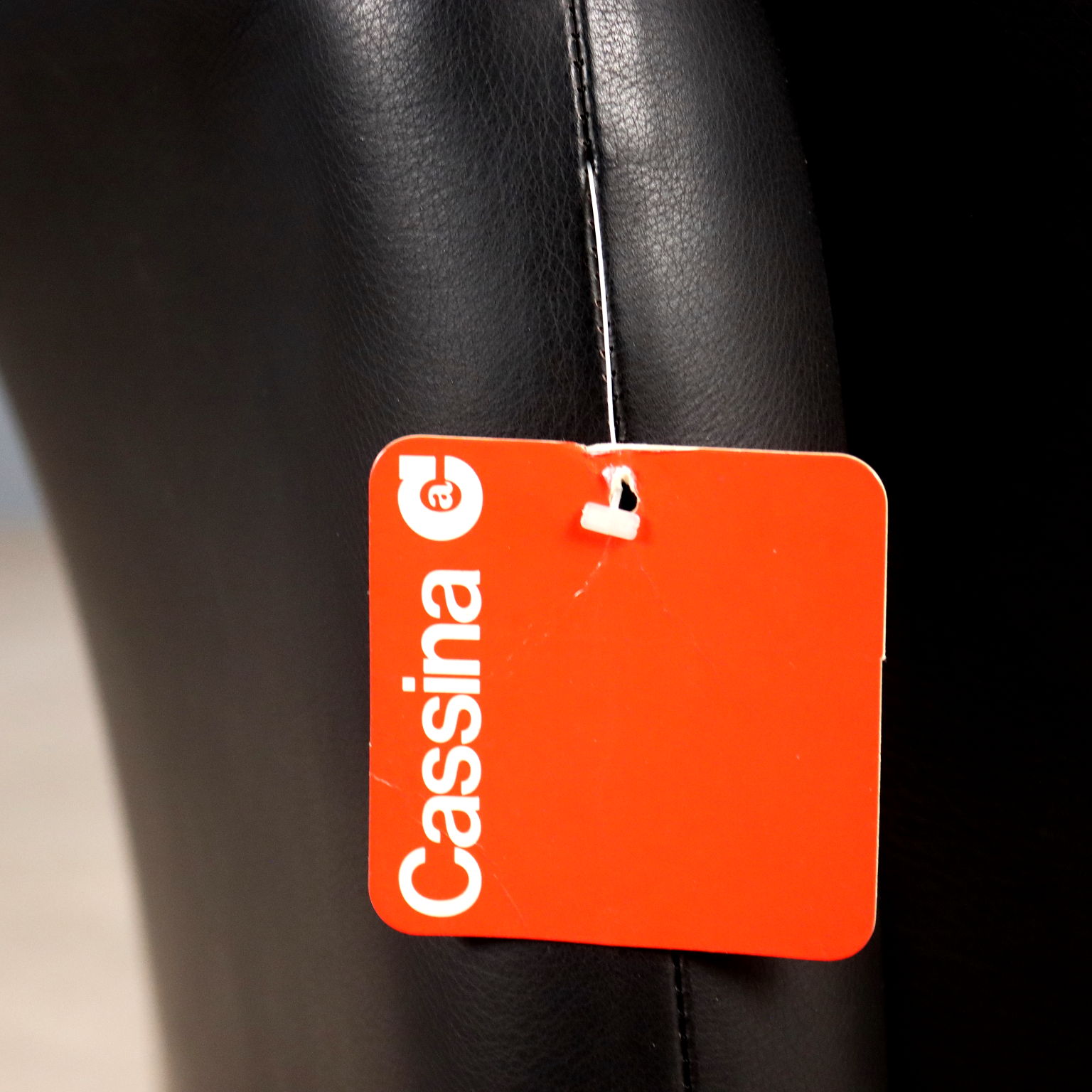 Zwei Sessel mit Schaumstoffpolsterung und schwarzem Lederbezug. Die Rückenlehne verfügt über eine umklappbare Kopfstütze, „die eine Nutzung in niedriger oder hoher Position ermöglicht und sich im Handumdrehen verstellen lässt“ (aus dem Buch Cassina – Portraits, 1994).