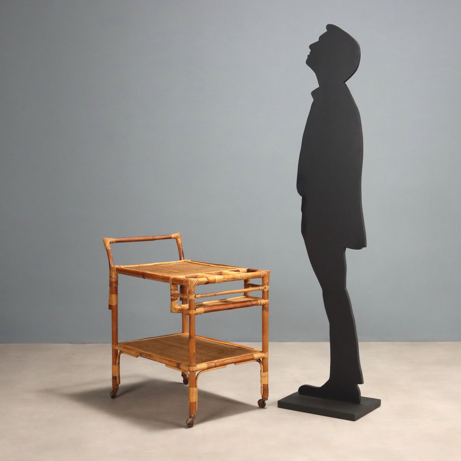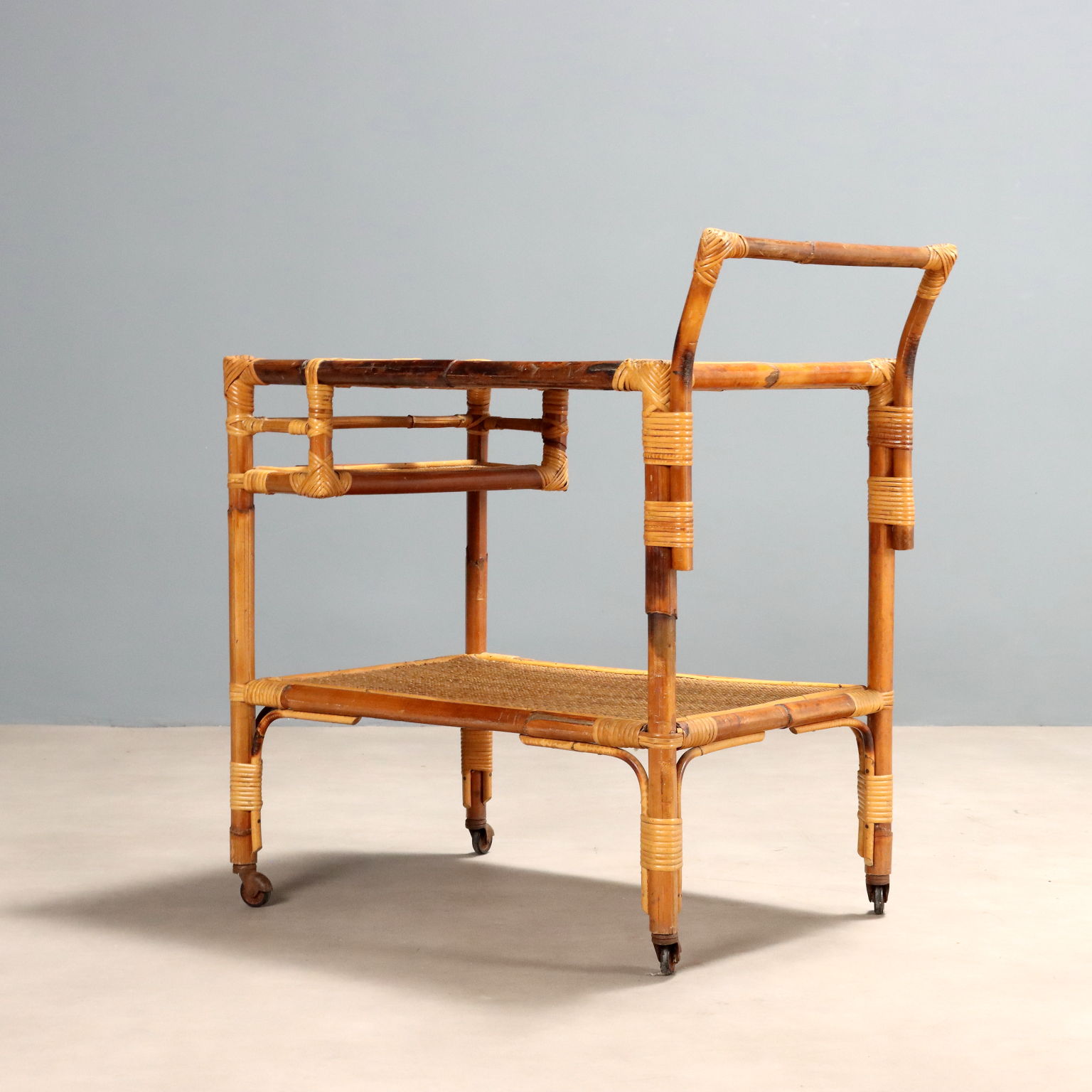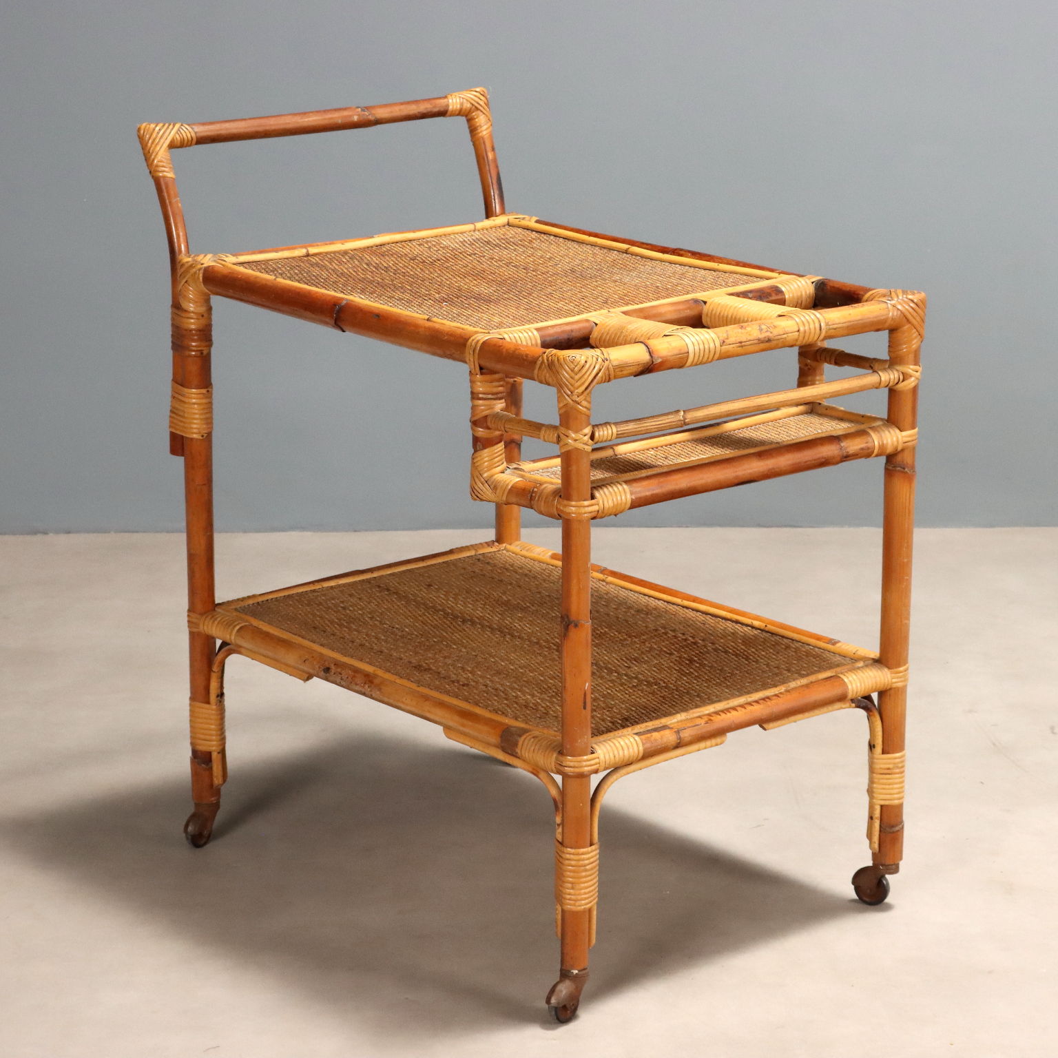 Vintage-Barwagen mit Bambusgestell und Weidenregalen.