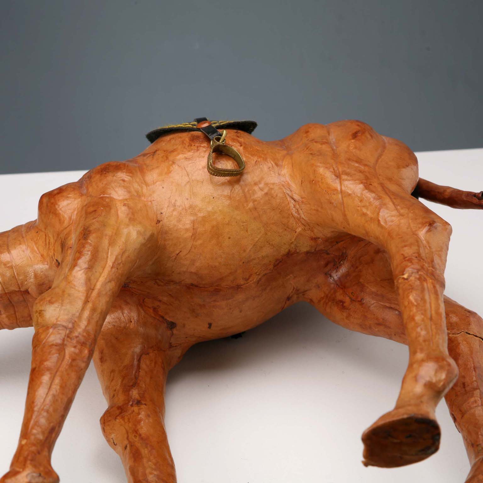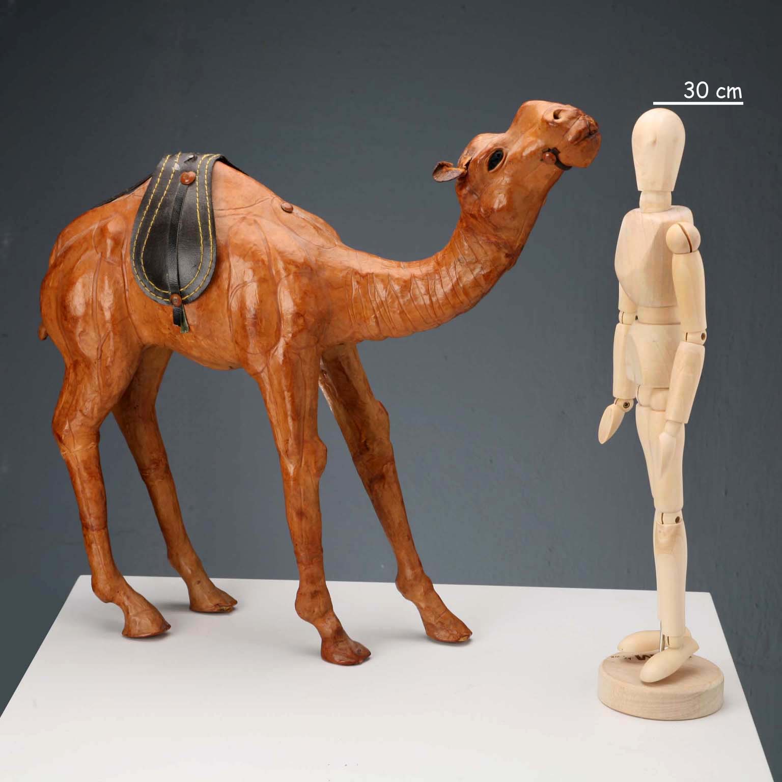 Skulptur, die ein mit Leder bedecktes Dromedar darstellt.