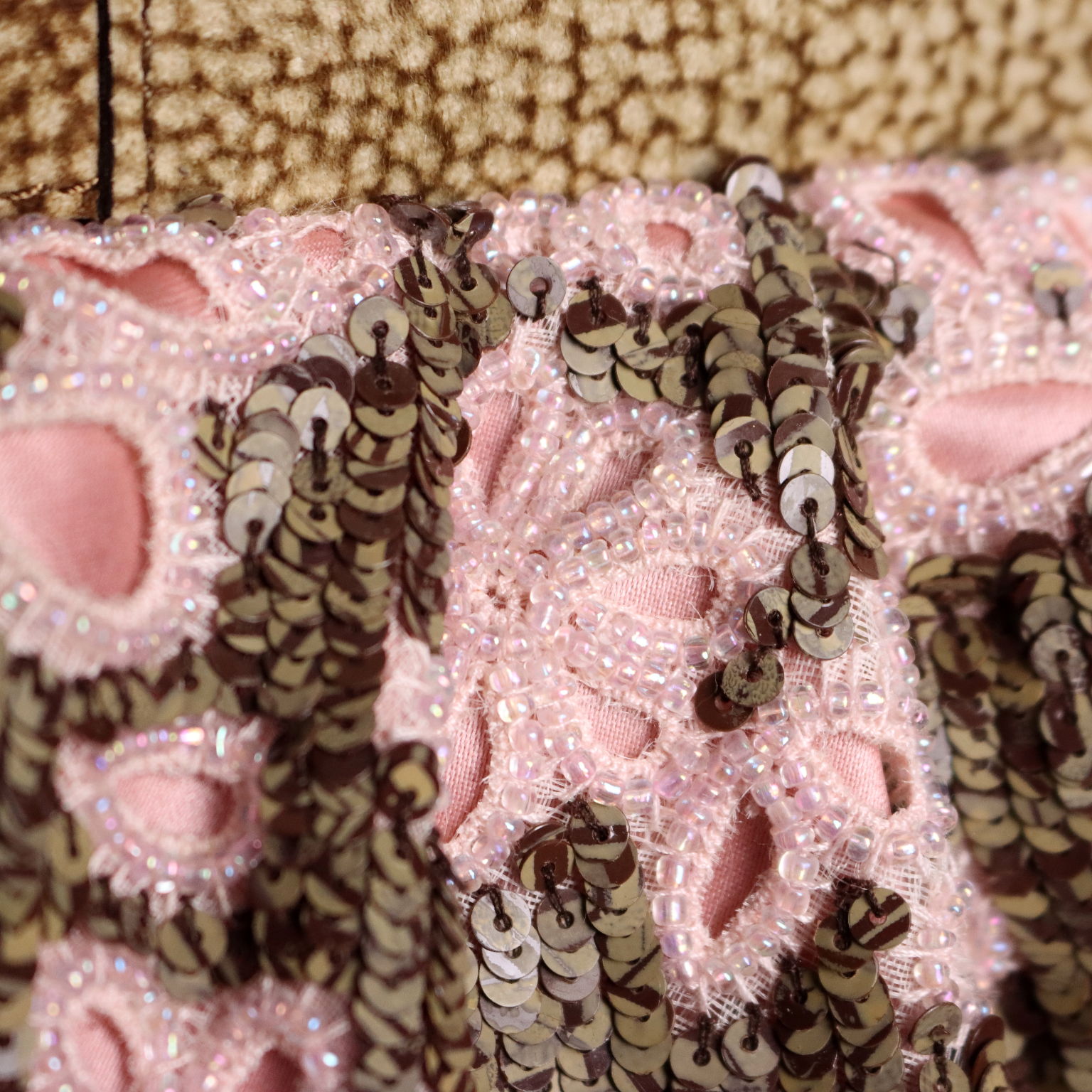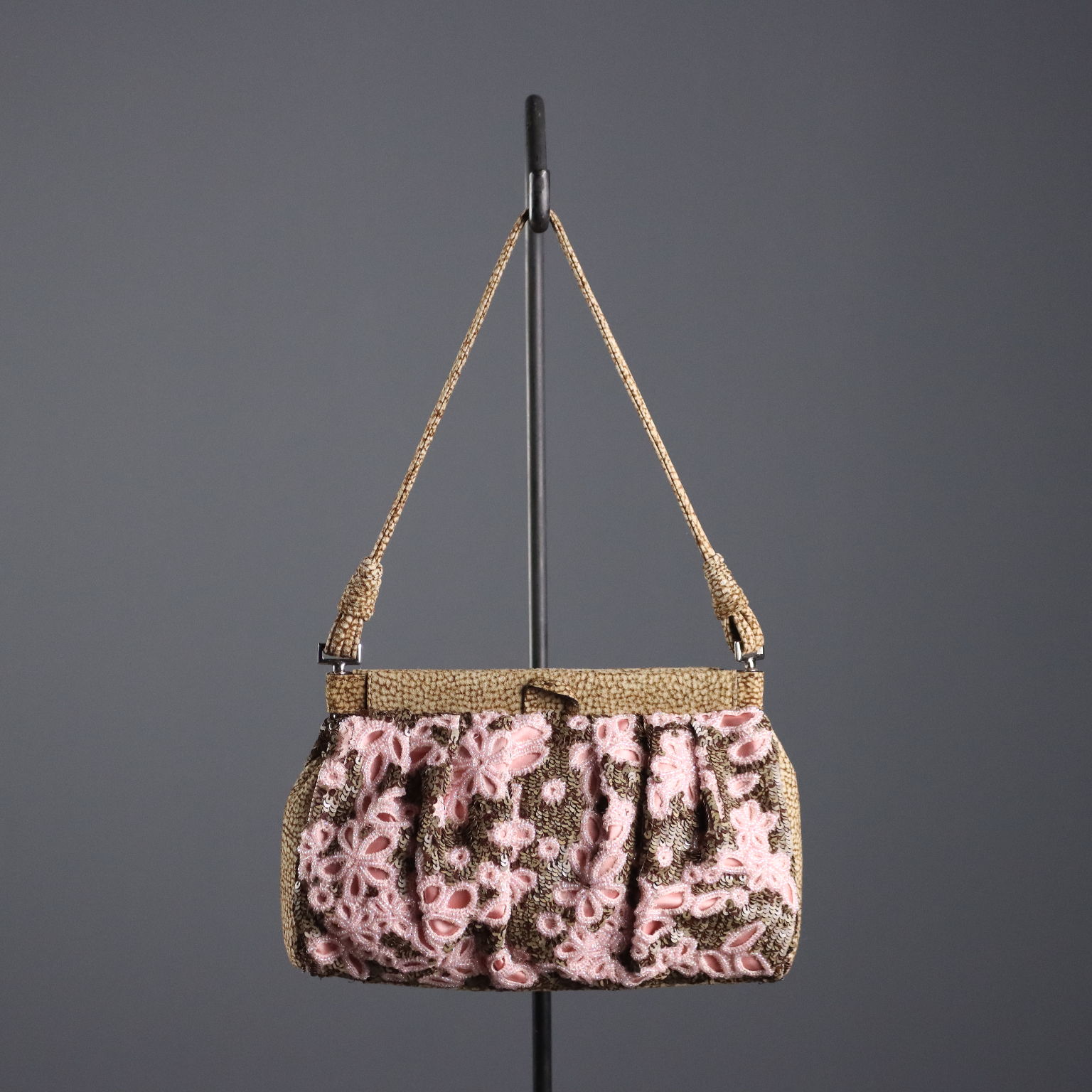 Mini-Tasche des traditionsreichen Turiner Modehauses, bekannt für seine ikonische Vogelaugenstruktur, die sich an Details wie dem Henkel und dem Lammlederbesatz wiederfindet. Die florale Pailletten- und Perlenstickerei auf rosa Satin verleiht der Tasche eine besonders elegante Note. Gefüttertes Innenfach mit Innentasche. Inklusive Staubbeutel. Die Pailletten weisen minimale, kaum sichtbare Abnutzungsspuren auf.