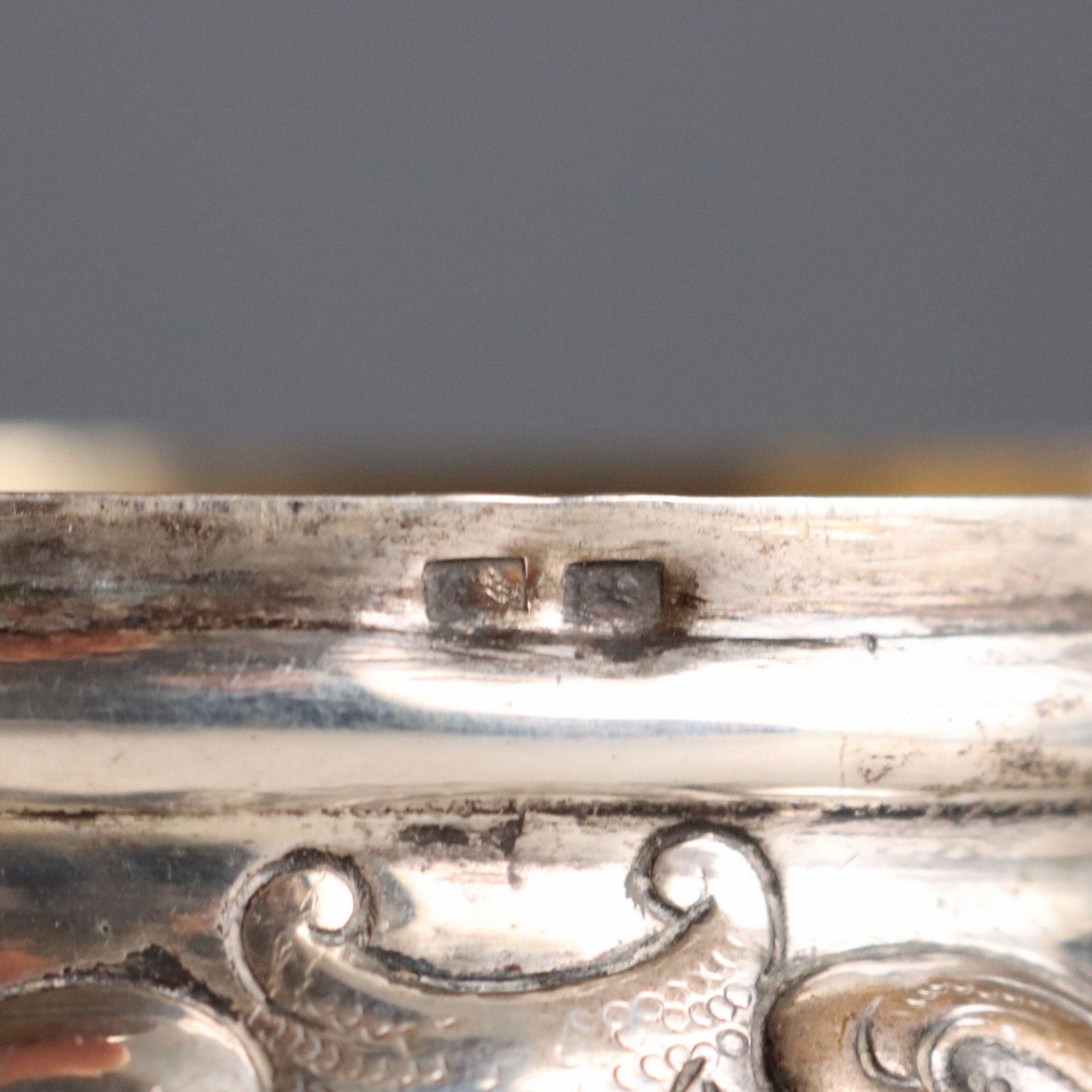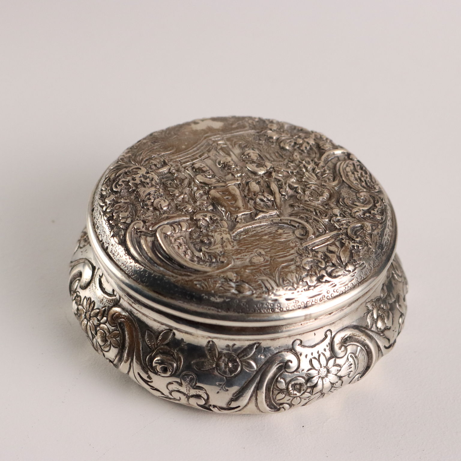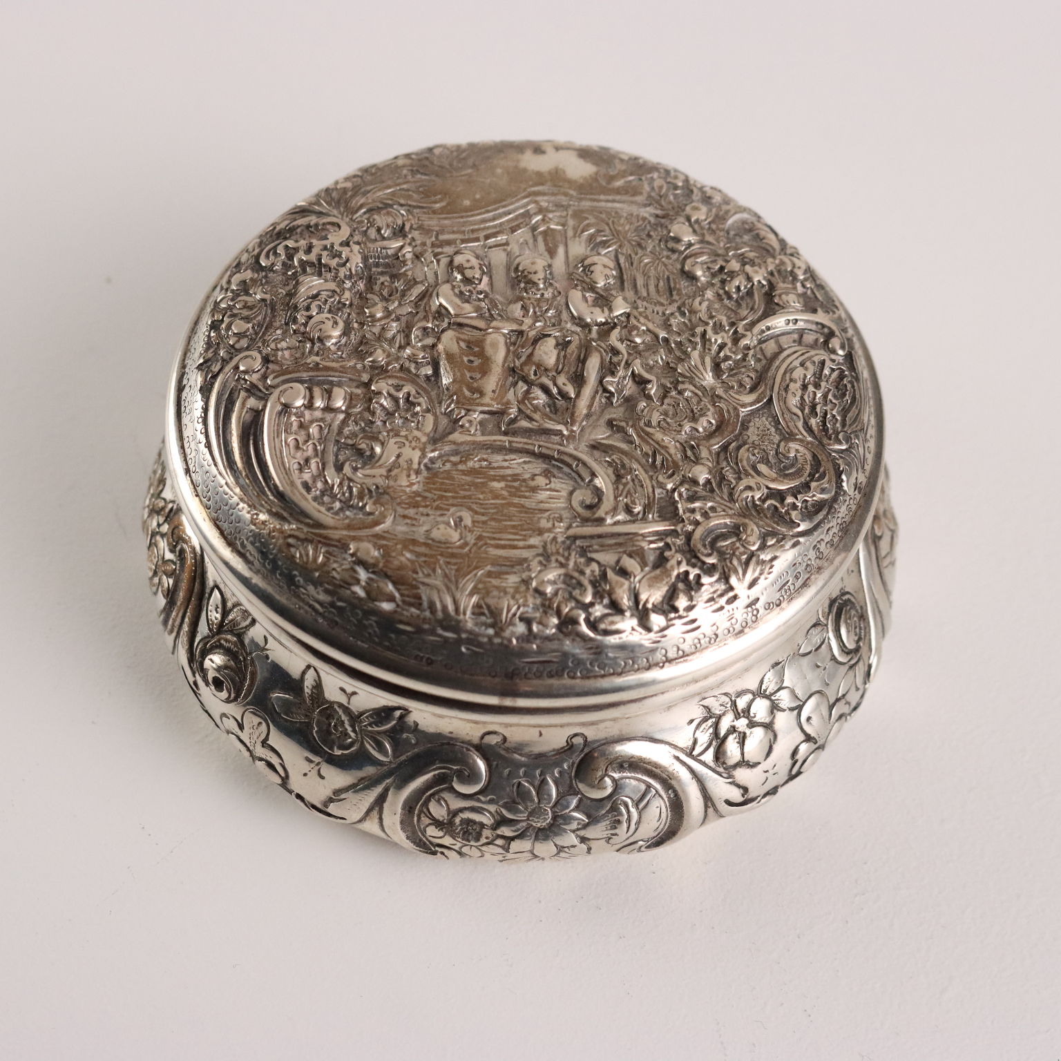Eine kleine Dose aus geprägtem und ziseliertem Silber mit einem vollflächigen Dekor, das eine Gartenszene mit Blattornamenten und Blumen darstellt. Das Innere ist vergoldet. Silberpunzen sind unter dem Boden eingraviert. Gewicht: 150 Gramm.