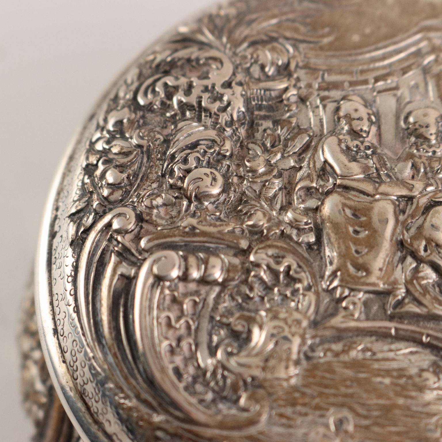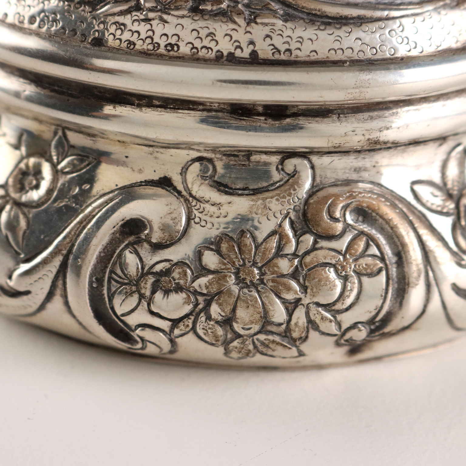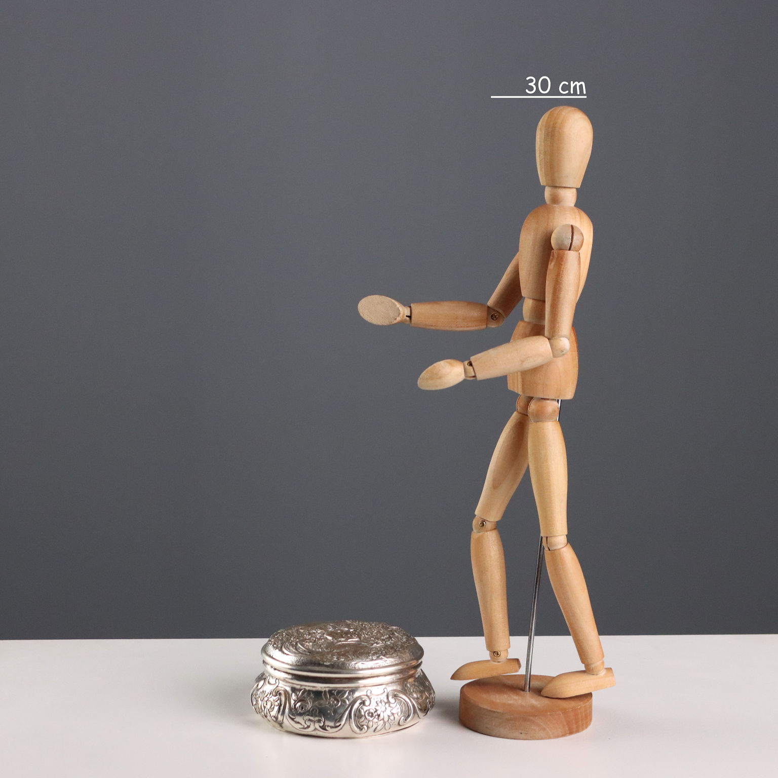 Eine kleine Dose aus geprägtem und ziseliertem Silber mit einem vollflächigen Dekor, das eine Gartenszene mit Blattornamenten und Blumen darstellt. Das Innere ist vergoldet. Silberpunzen sind unter dem Boden eingraviert. Gewicht: 150 Gramm.