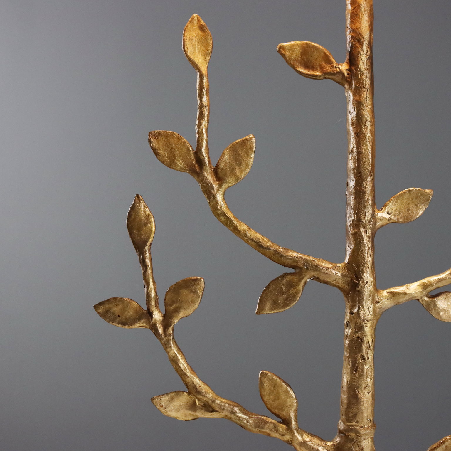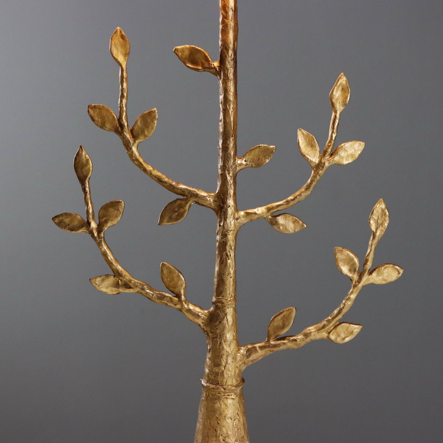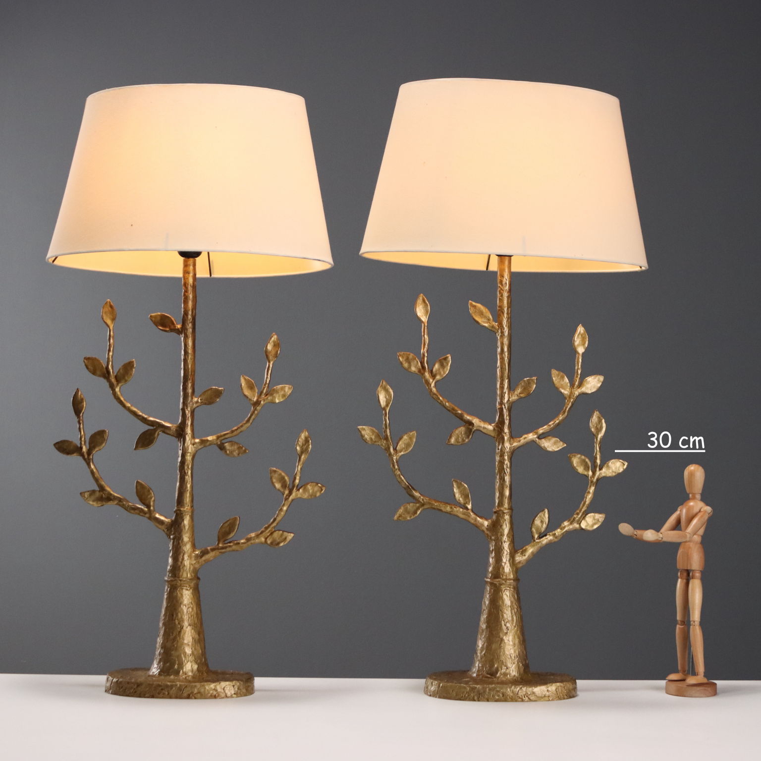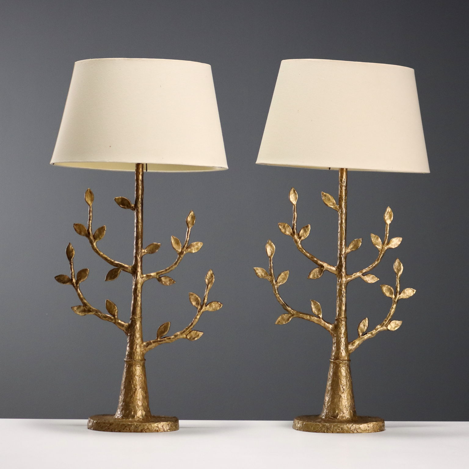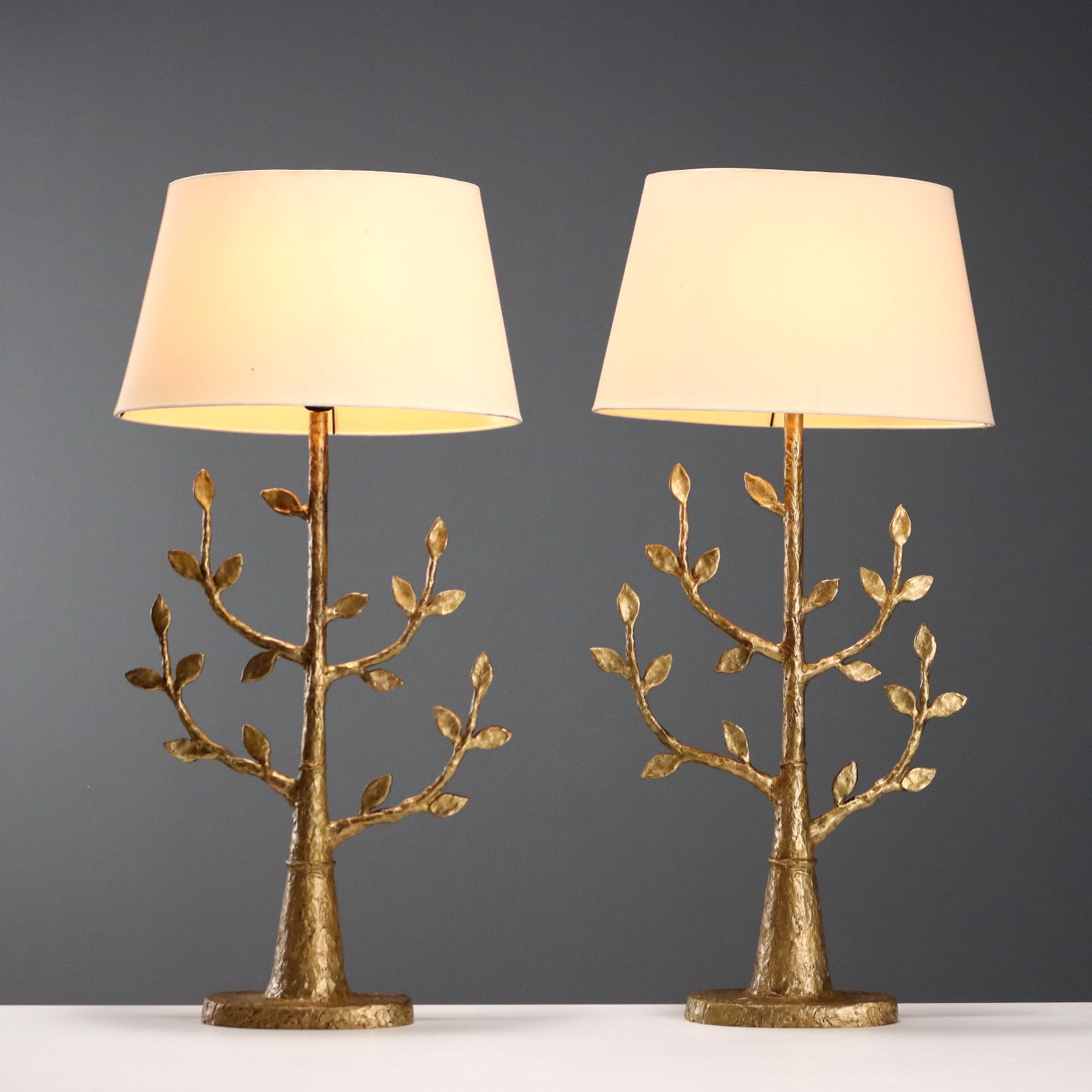 Ein Paar „Millana“-Tischlampen von William Yeoward. Eine Lampe ruht auf einer vergoldeten Bronzeskulptur eines Baumes mit Blättern. Stofflampenschirme. London, Ende des 20. Jahrhunderts.