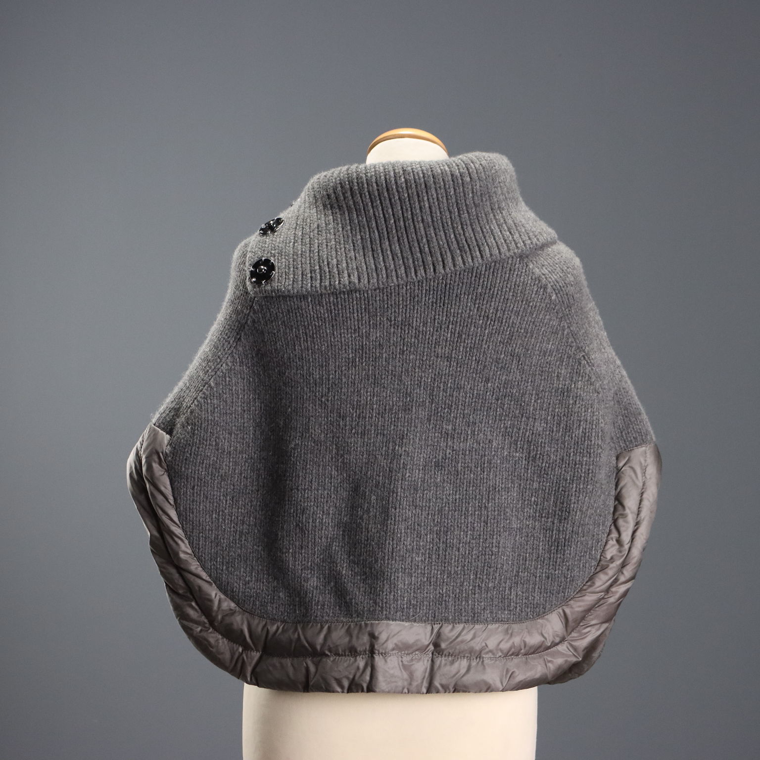 Strickcape aus Wolle mit hohem, per Druckknopf verstellbarem Kragen und Daunenbesatz. Breite: 66 cm. Länge: 47,5 cm.