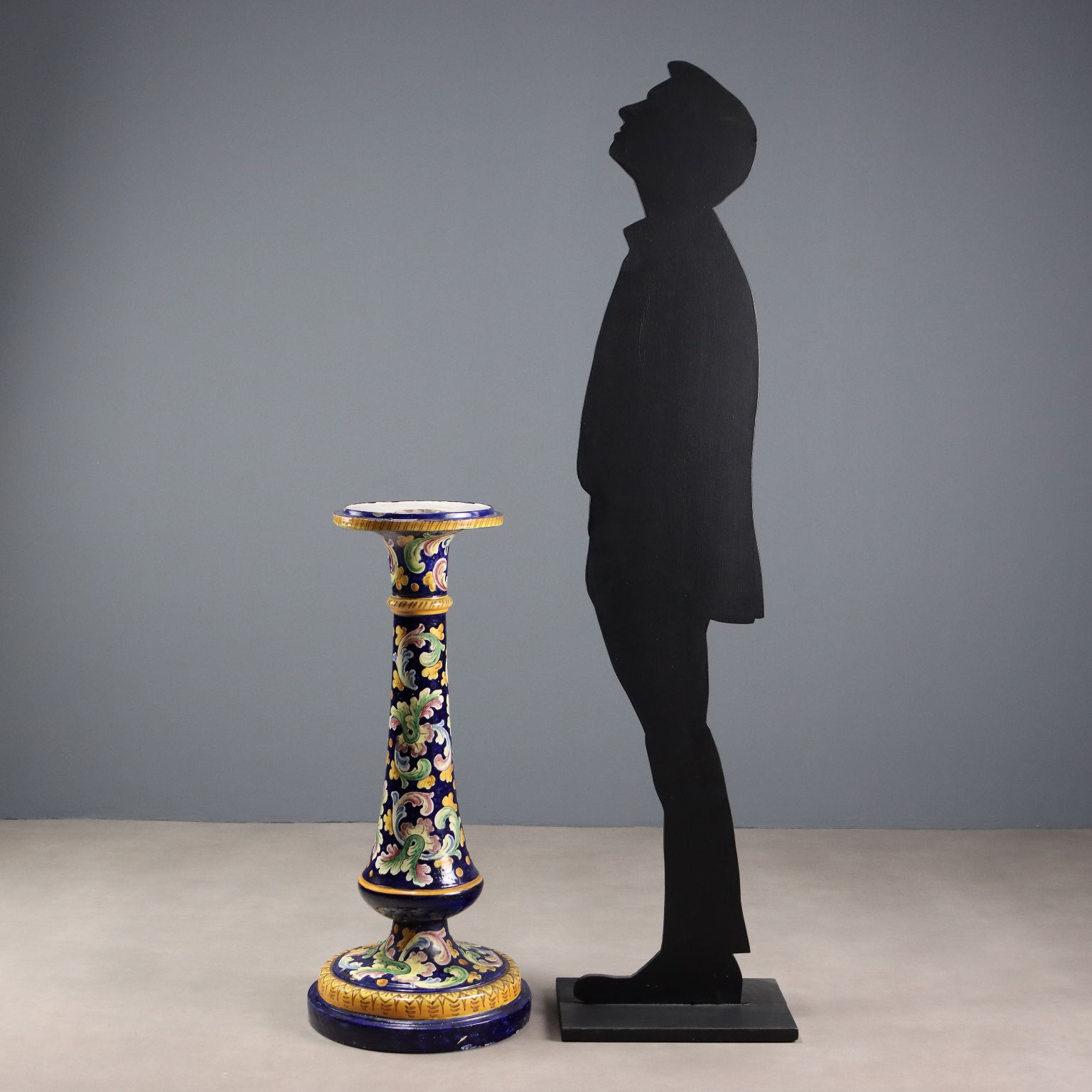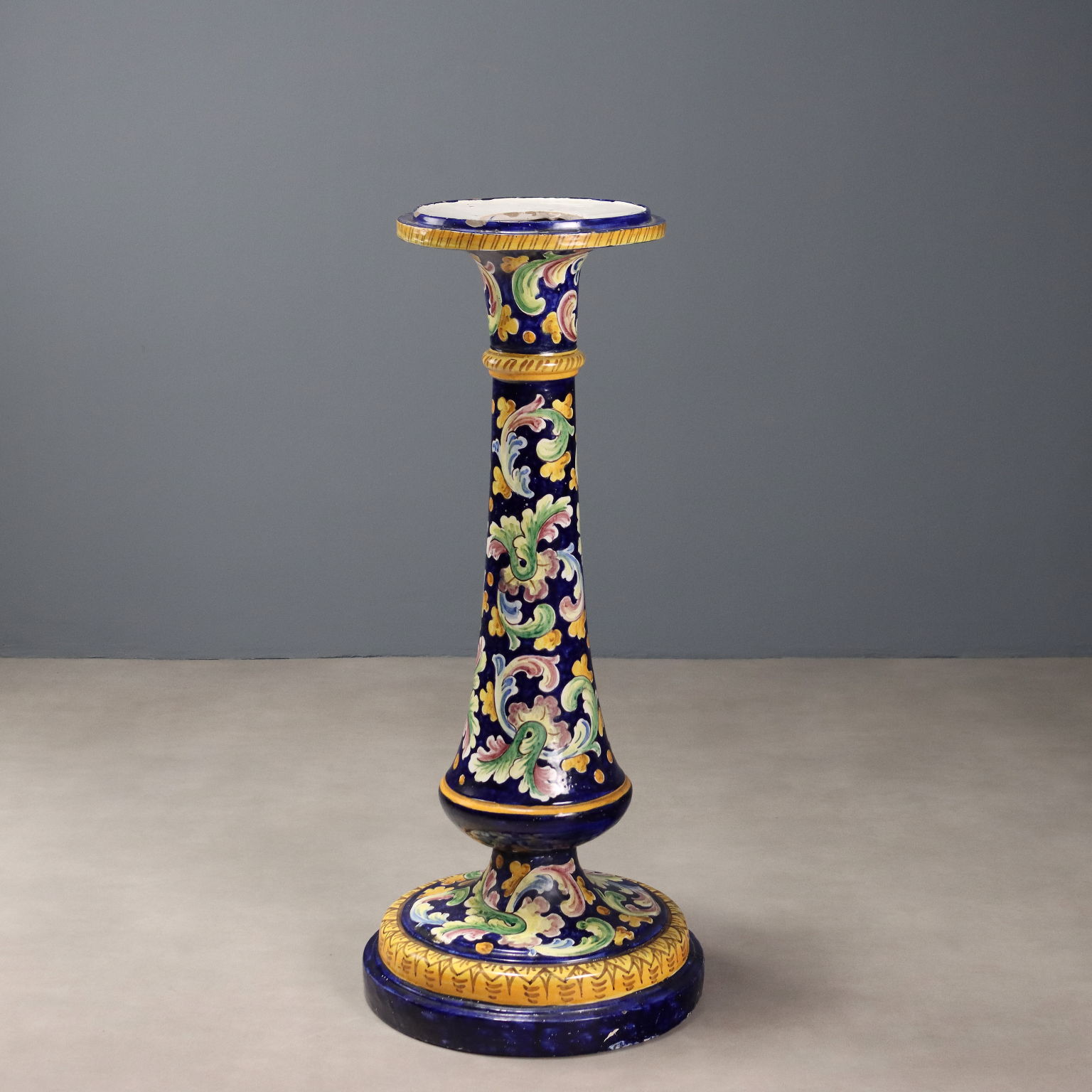 Majolikasäule mit blattförmigen Rankenornamenten in Gelb-, Ocker-, Grün-, Rot- und Hellblautönen auf kobaltblauem Grund.