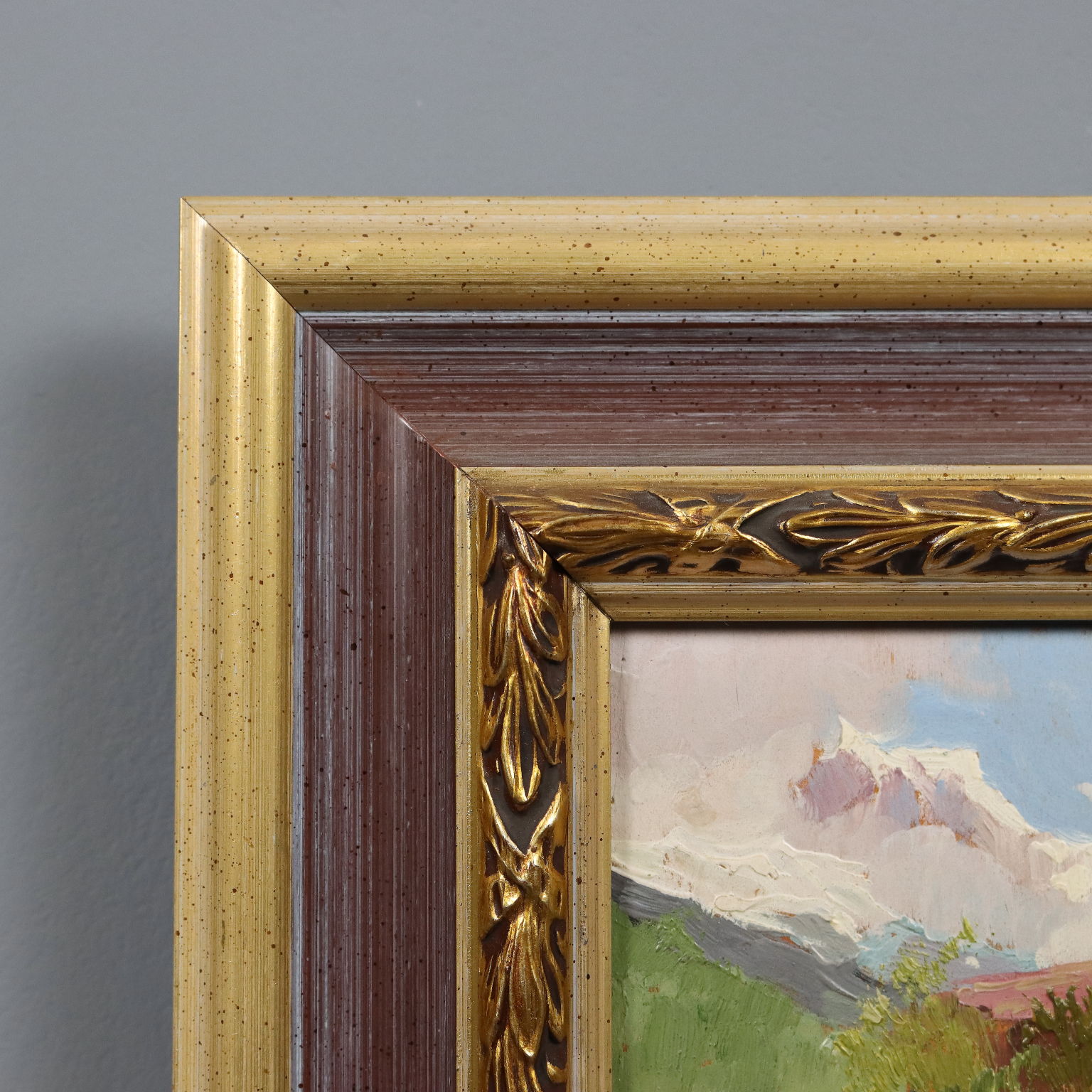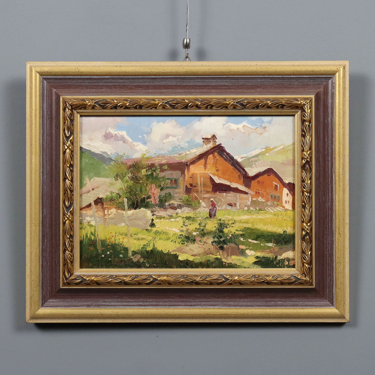 Öl auf Holz. Signatur, Widmung, Datierung und Ortsangabe unten links. Giuseppe Gheduzzi, der aus einer Künstlerfamilie stammte, tat sich als Landschaftsmaler ebenso hervor wie durch seine Interieurs mit Figuren, Ställen und Antiquitätenläden, ergänzt durch orientalistische Motive und eindrucksvolle Seestücke. Wiederkehrende Themen in seinem Werk, wie auch in dem seines Bruders Cesare, sind Ansichten von Macugnaga, einem Ort in den piemontesischen Alpen. Das Gemälde befindet sich in einem zeitgenössischen Rahmen.