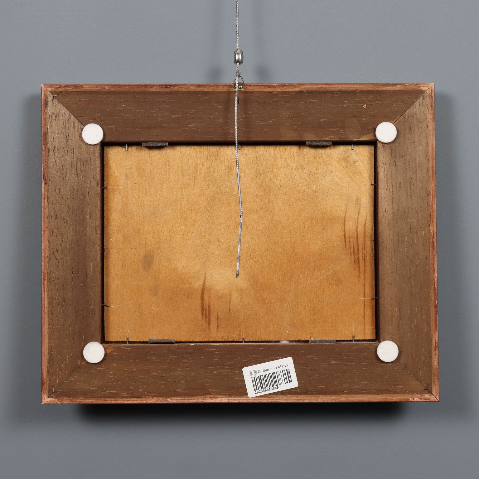 La pittura è l'arte che consiste nell'applicare dei pigmenti a un supporto come la carta, la tela, la seta, la ceramica, il legno, il vetro o un muro. Essendo i pigmenti essenzialmente solidi, è necessario utilizzare un legante, che li porti a uno stadio liquido, più fluido o più denso, e un collante, che permetta l'adesione duratura al supporto. Chi dipinge è detto pittore o pittrice. Il risultato è un'immagine che, a seconda delle intenzioni dell'autore, esprime la sua percezione del mondo o una libera associazione di forme o un qualsiasi altro significato, a seconda della sua creatività, del suo gusto estetico e di quello della società di cui fa parte.Technische spezifikation: Öl auf Holzbrett