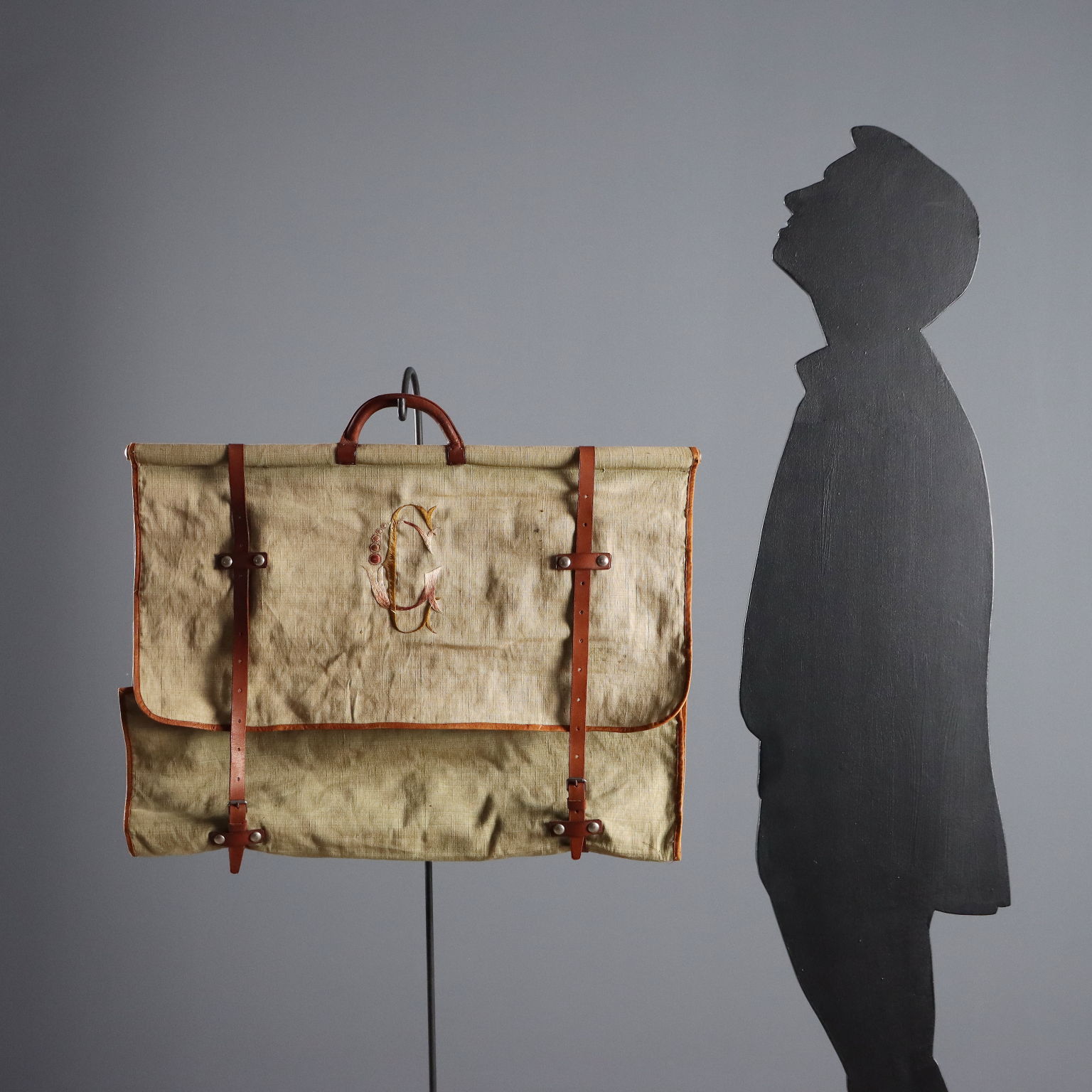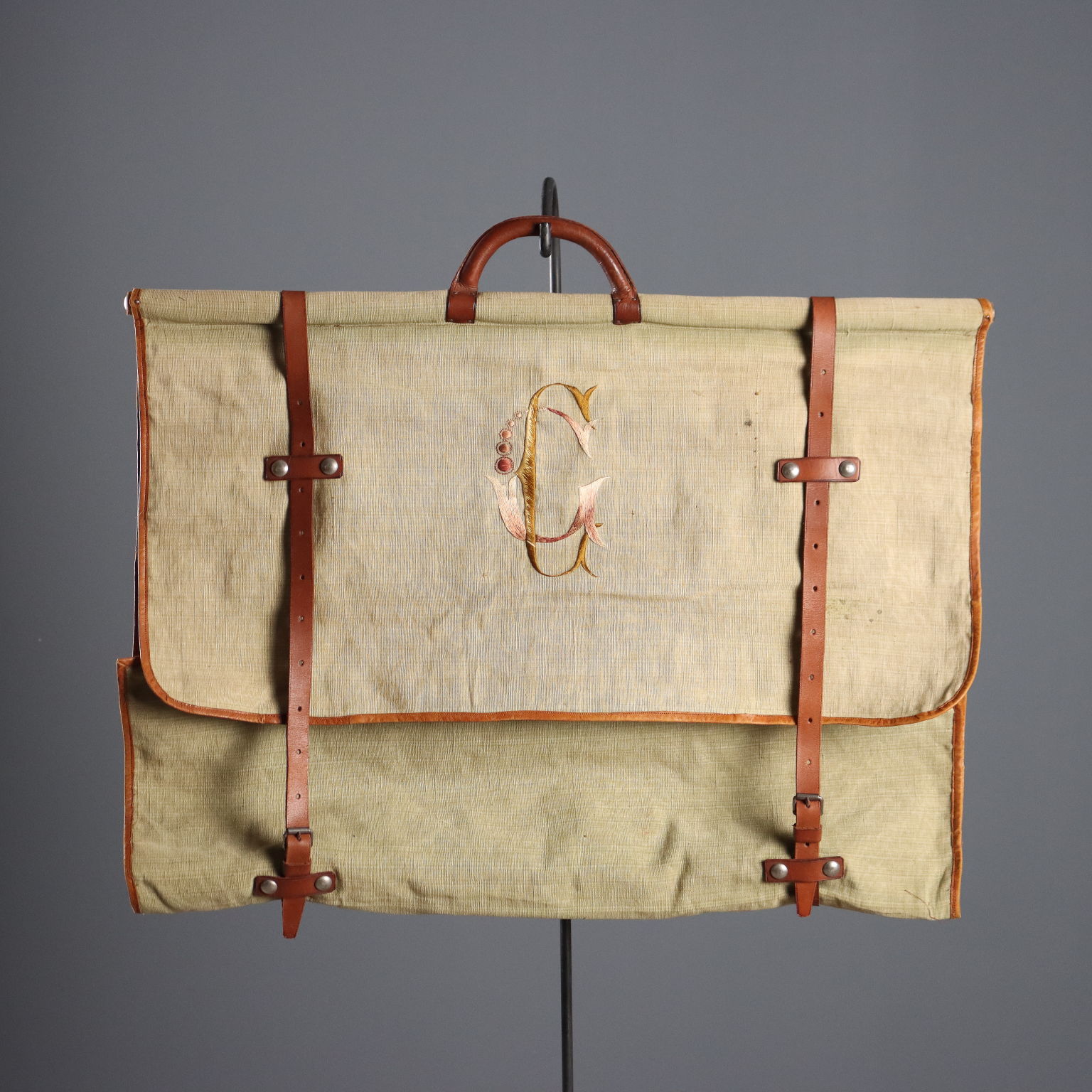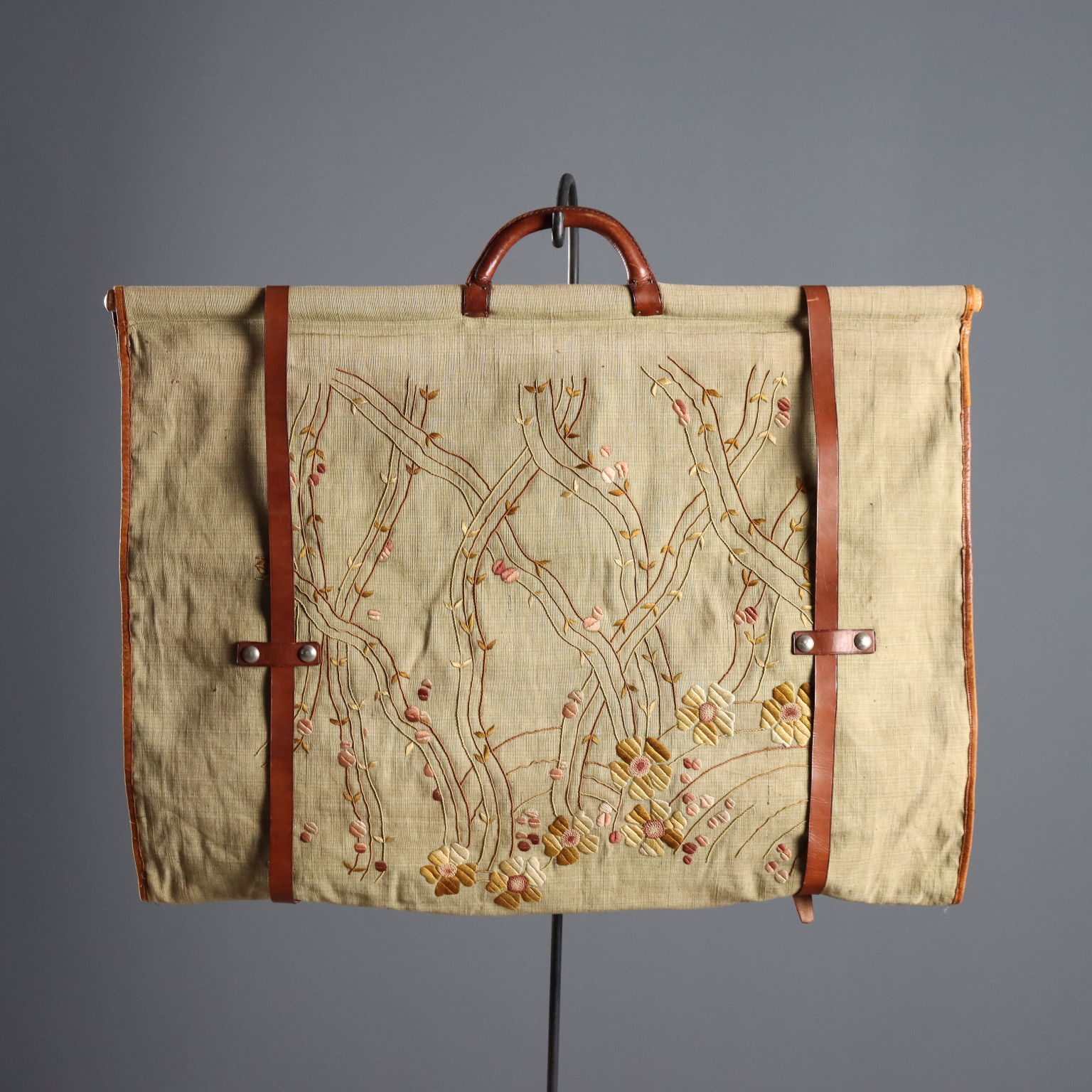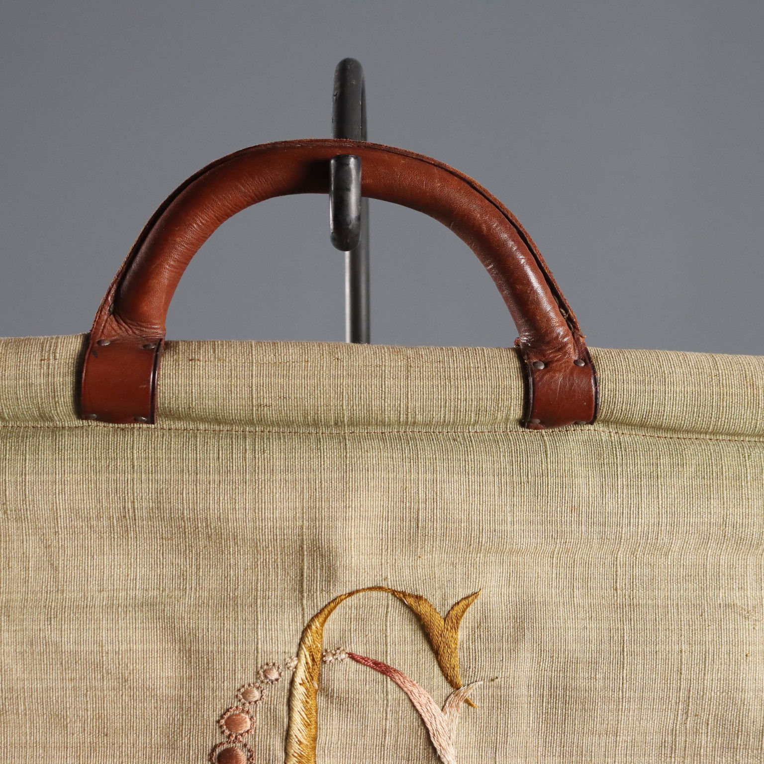 Prächtiger Stoffkoffer mit Zahlen- und Satinstichstickerei, geeignet als Kleidersack, mit Ledergriff und -kante.