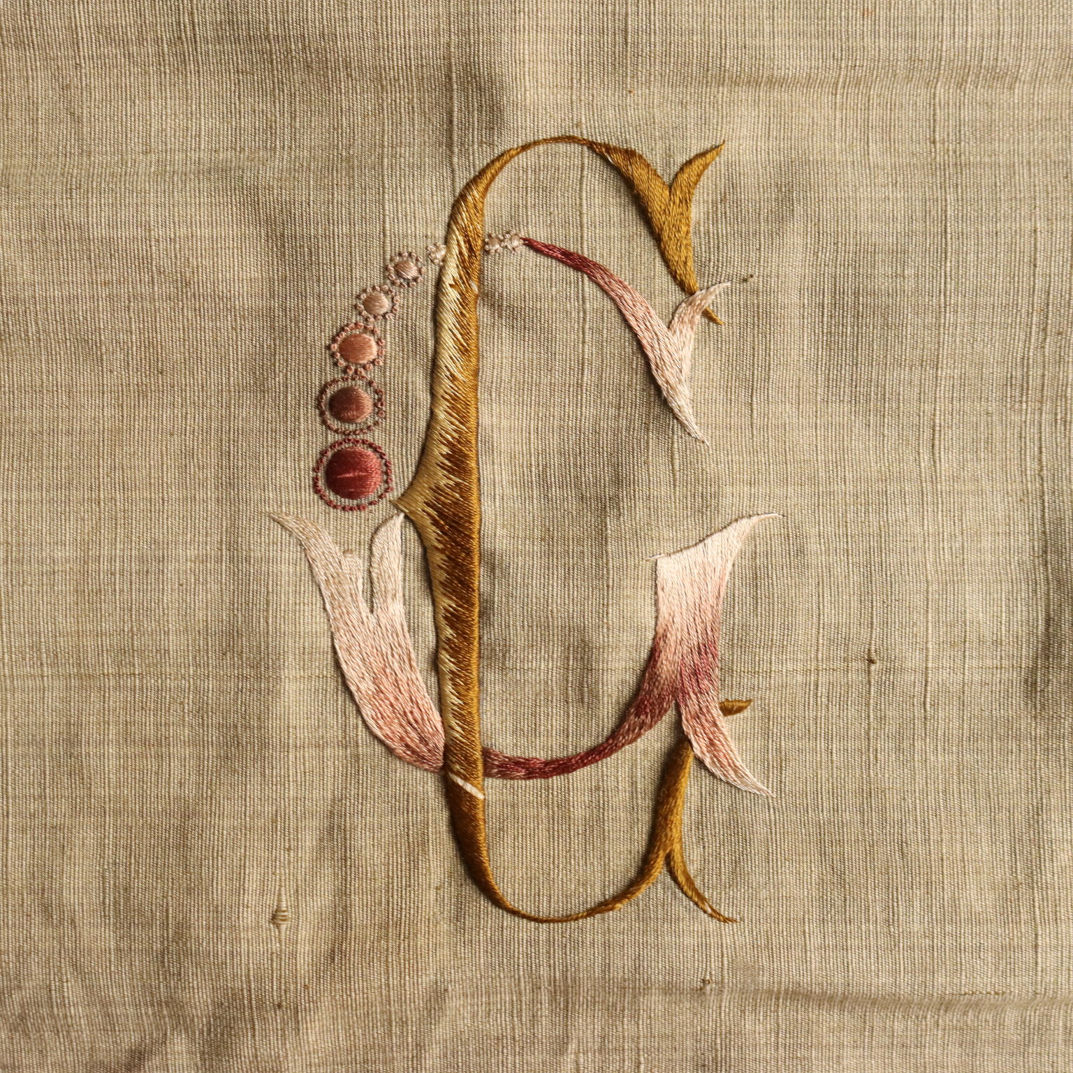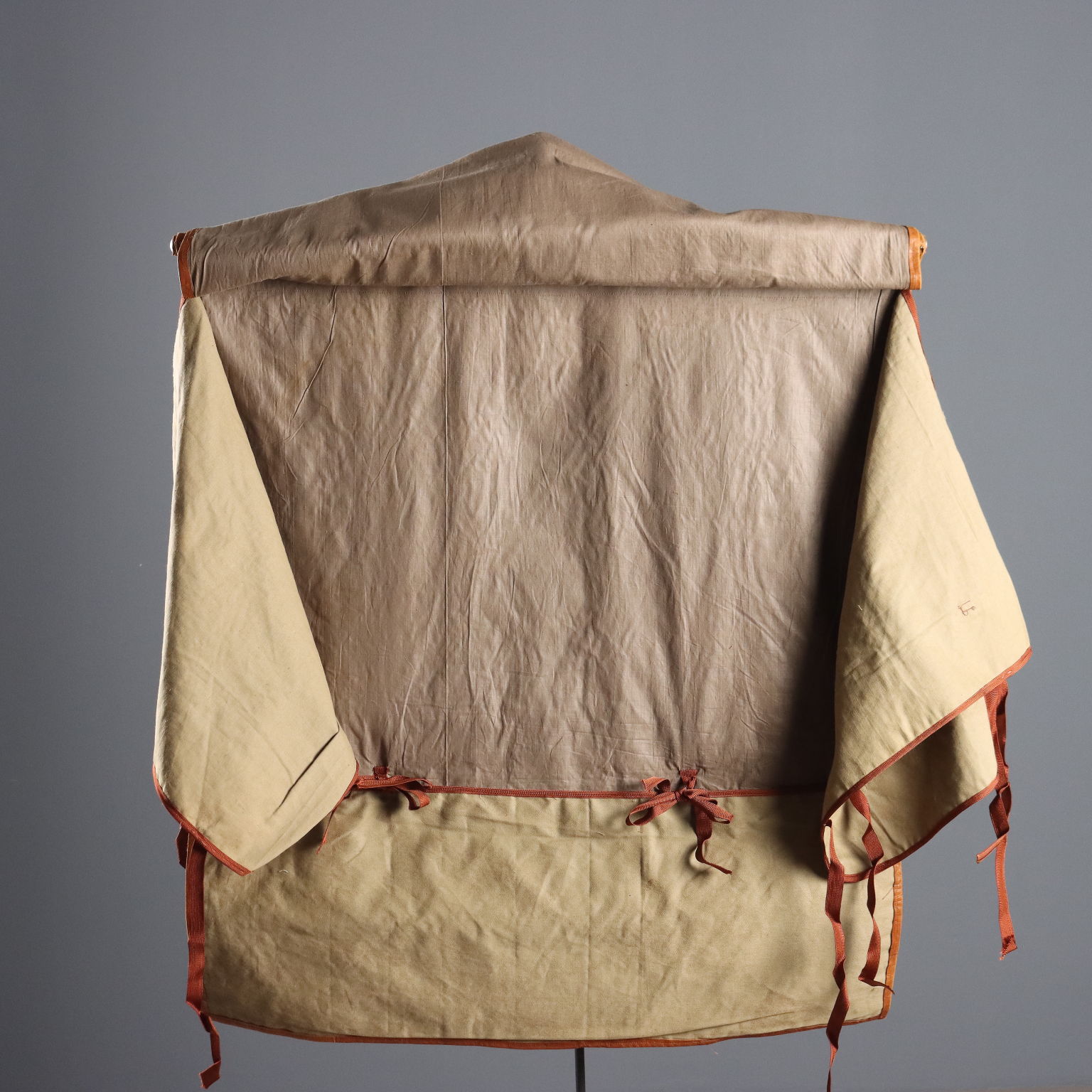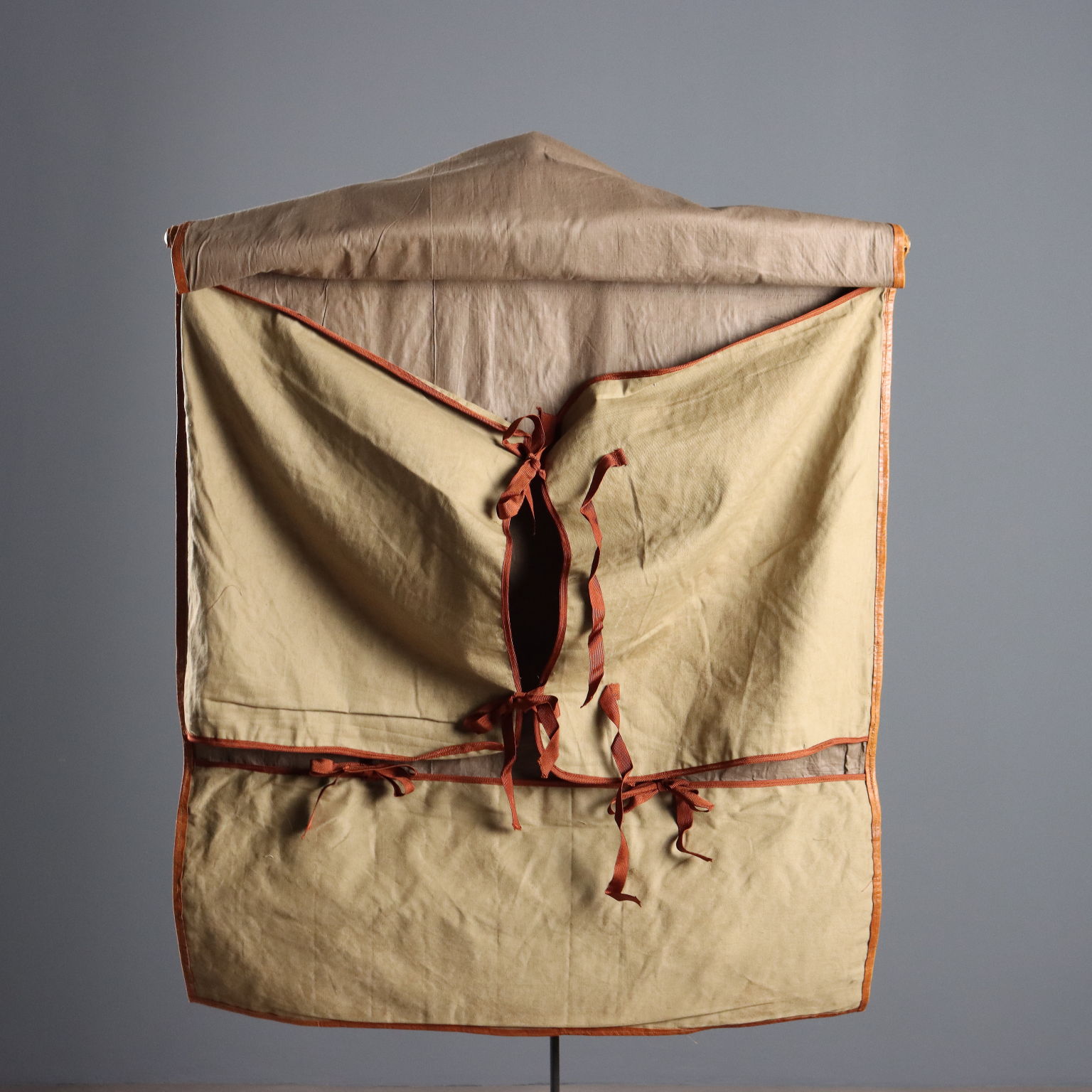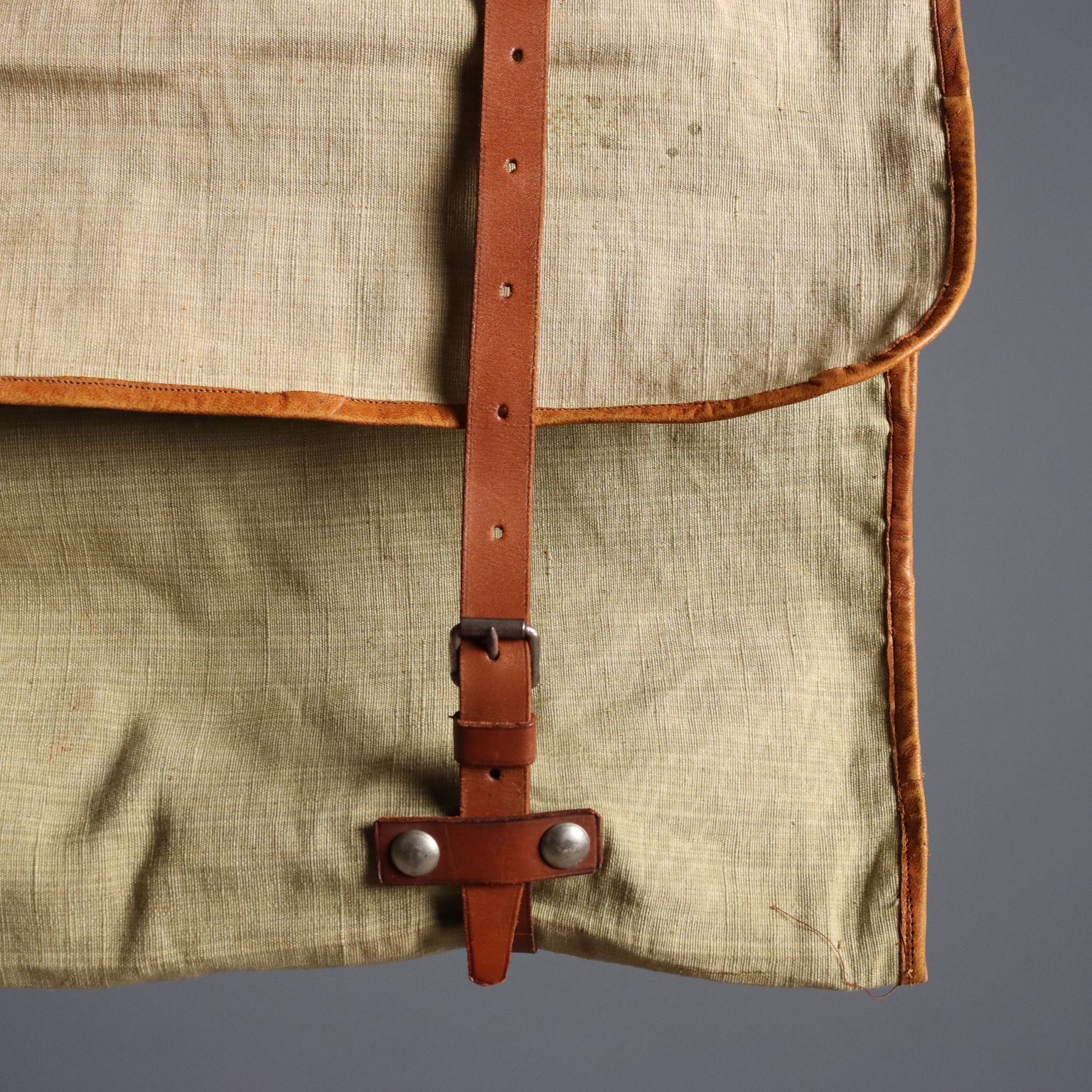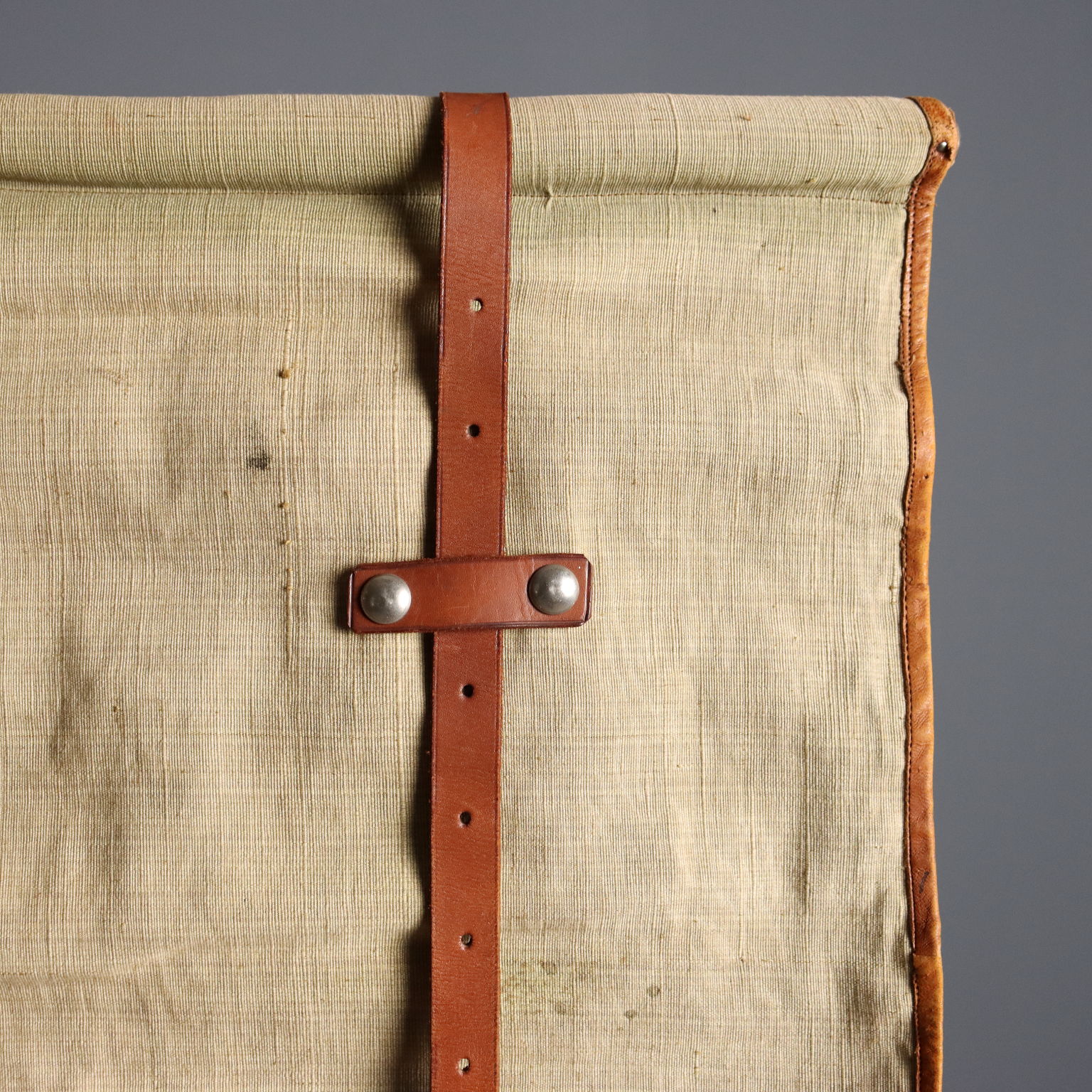 Prächtiger Stoffkoffer mit Zahlen- und Satinstichstickerei, geeignet als Kleidersack, mit Ledergriff und -kante.