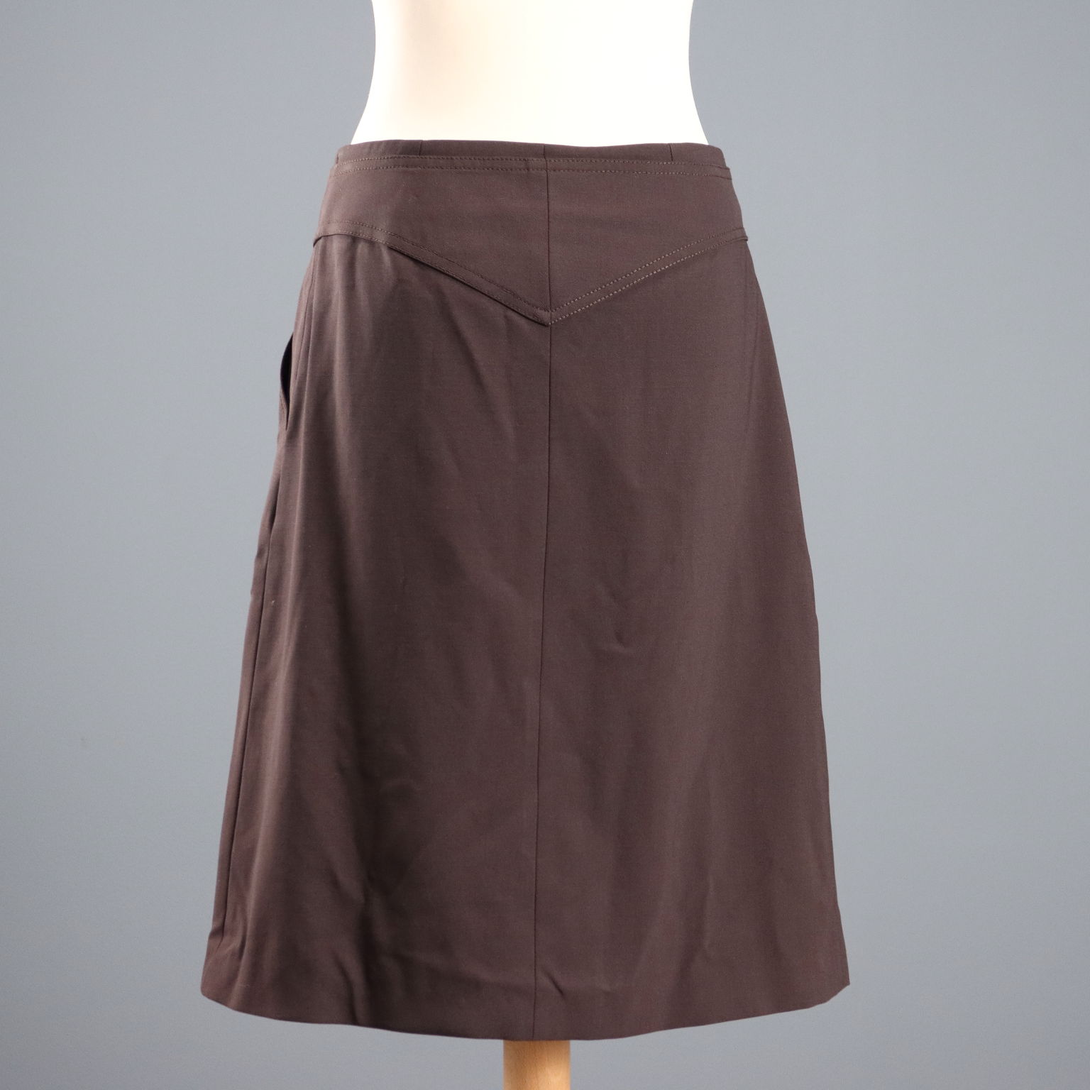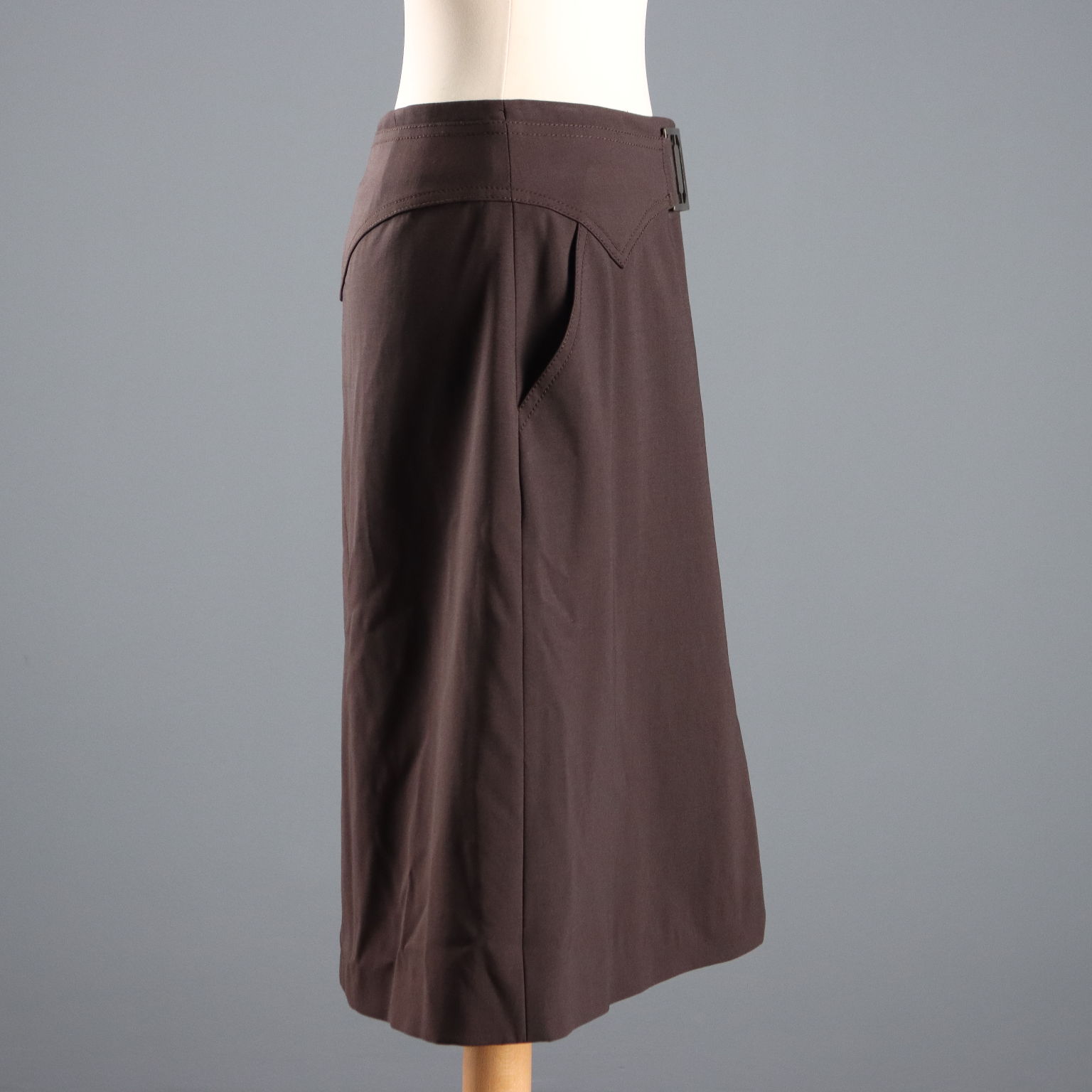 Brauner Midirock aus Wollmischung mit Schnalle. Reißverschluss und Knopfverschluss. Länge: 65 cm. Bundweite: 76 cm.