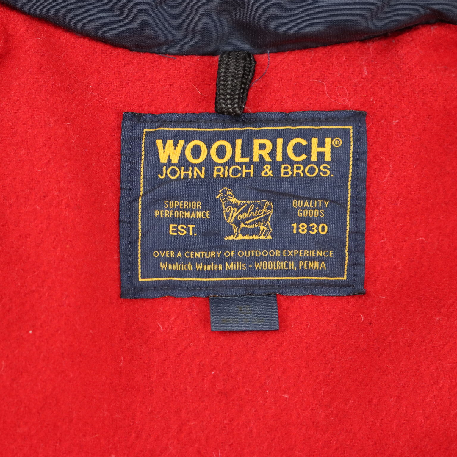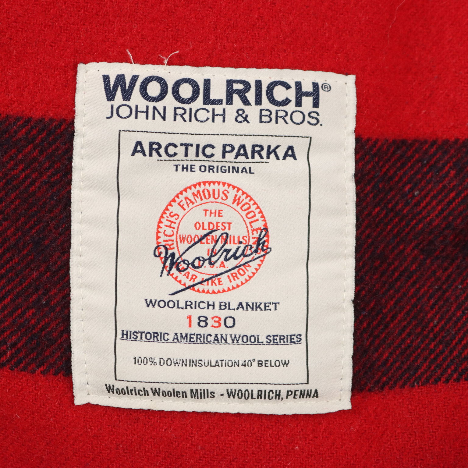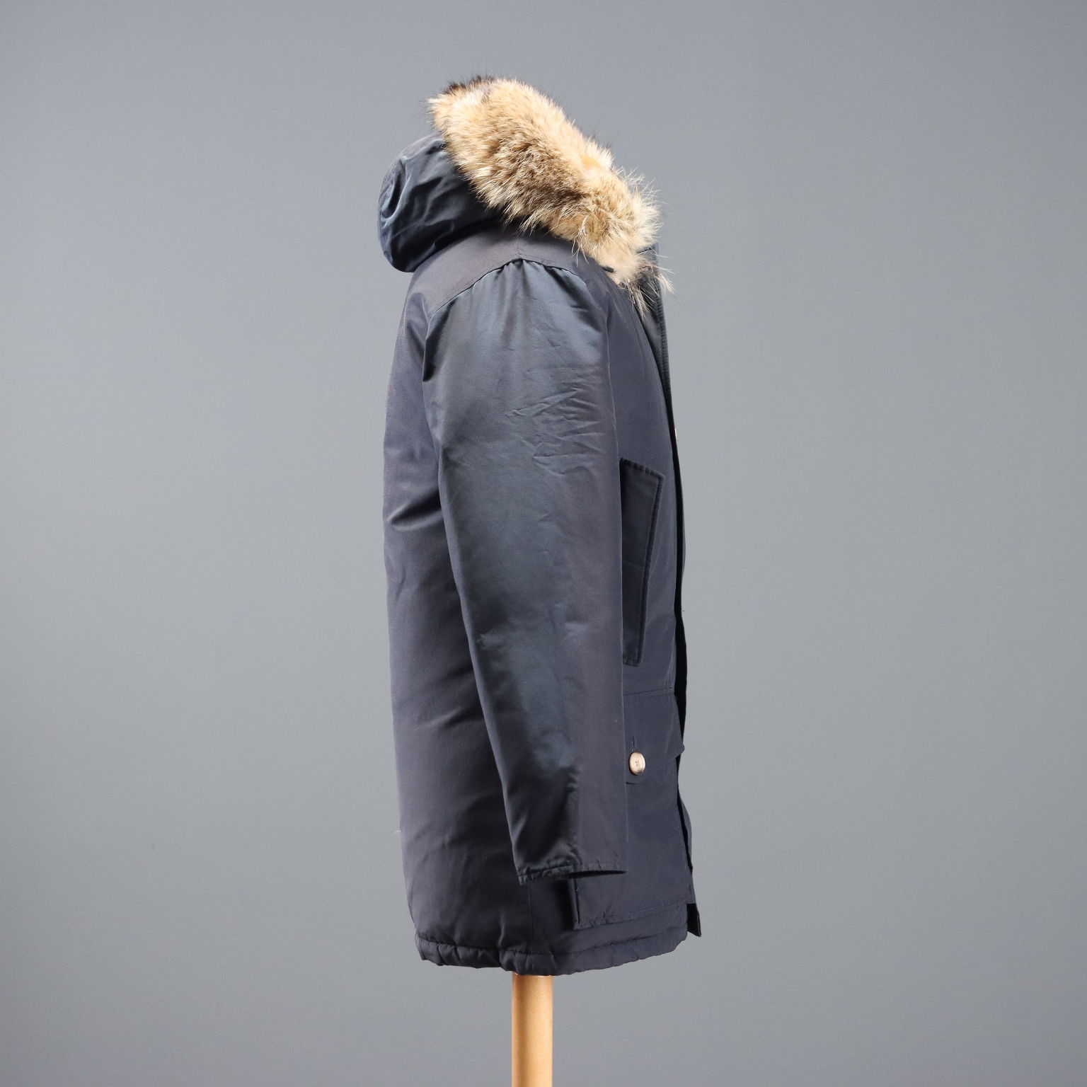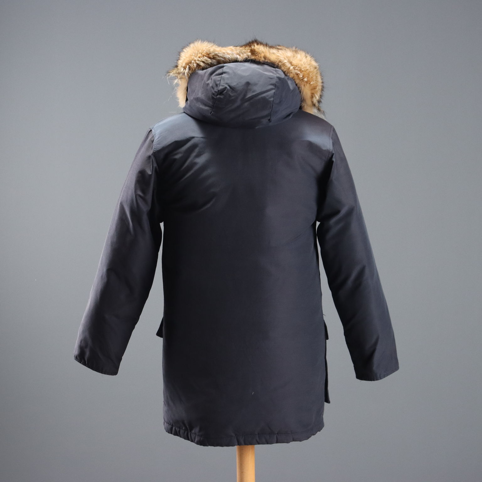 Woolrich Arctic Parka, wattiert mit Daunen. Mit Zwei-Wege-Reißverschluss und Knopfleiste, vier Außentaschen und einer Innentasche. Kapuze mit Pelzbesatz. Rotes Wollmischfutter. Schulterbreite: 46 cm. Brustweite: 53 cm. Ärmellänge: 60 cm. Armloch: 52 cm. Länge: 82 cm.