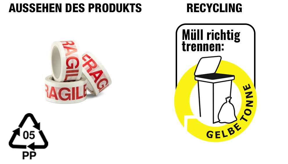 ![]() Nastro adesivoPuoi lasciare il nastro adesivo attaccato al materiale principale dell'imballaggio (scatola, caronte, pellicola) e seguire le istruzioni per il riciclaggio in base al materiale principale. |