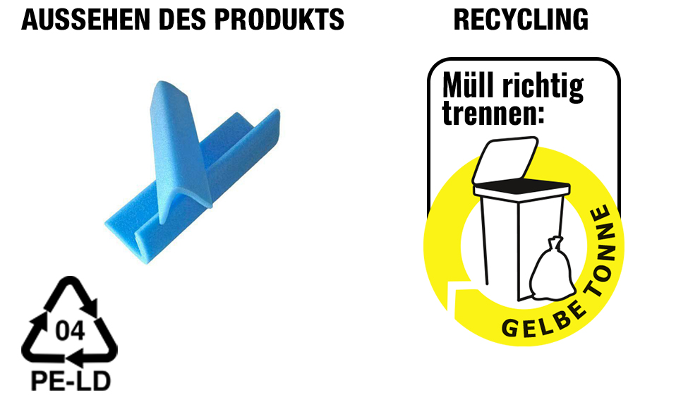 ![]() Angolari protettivi in polietileneIl riciclaggio degli angolari protettivi si effettua con la raccolta della plastica tramite programmi di riciclaggio a domicilio e in Aree Ecologiche appositamente designate dal tuo Comune. |