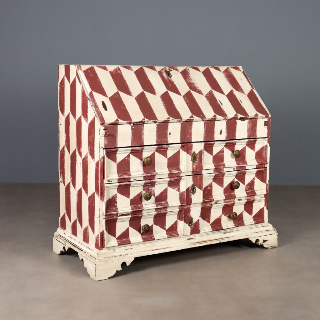 Gli interni sono realizzati in pioppo, un legno chiaro e leggero, mentre l’esterno, originariamente in noce, è stato laccato nei toni caldi dell’avorio e del mattone. La decorazione, caratterizzata da motivi geometrici regolari, è stata realizzata presso i nostri laboratori di restauro, con l’utilizzo esclusivo di prodotti naturali e tecniche rispettose della tradizione. L’intervento, studiato per valorizzare l’estetica senza compromettere l’autenticità, ha mantenuto la completa reversibilità, consentendo all’arredo di essere eventualmente riportato allo stato originario.