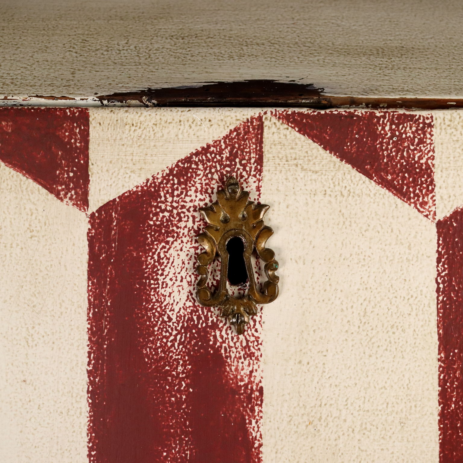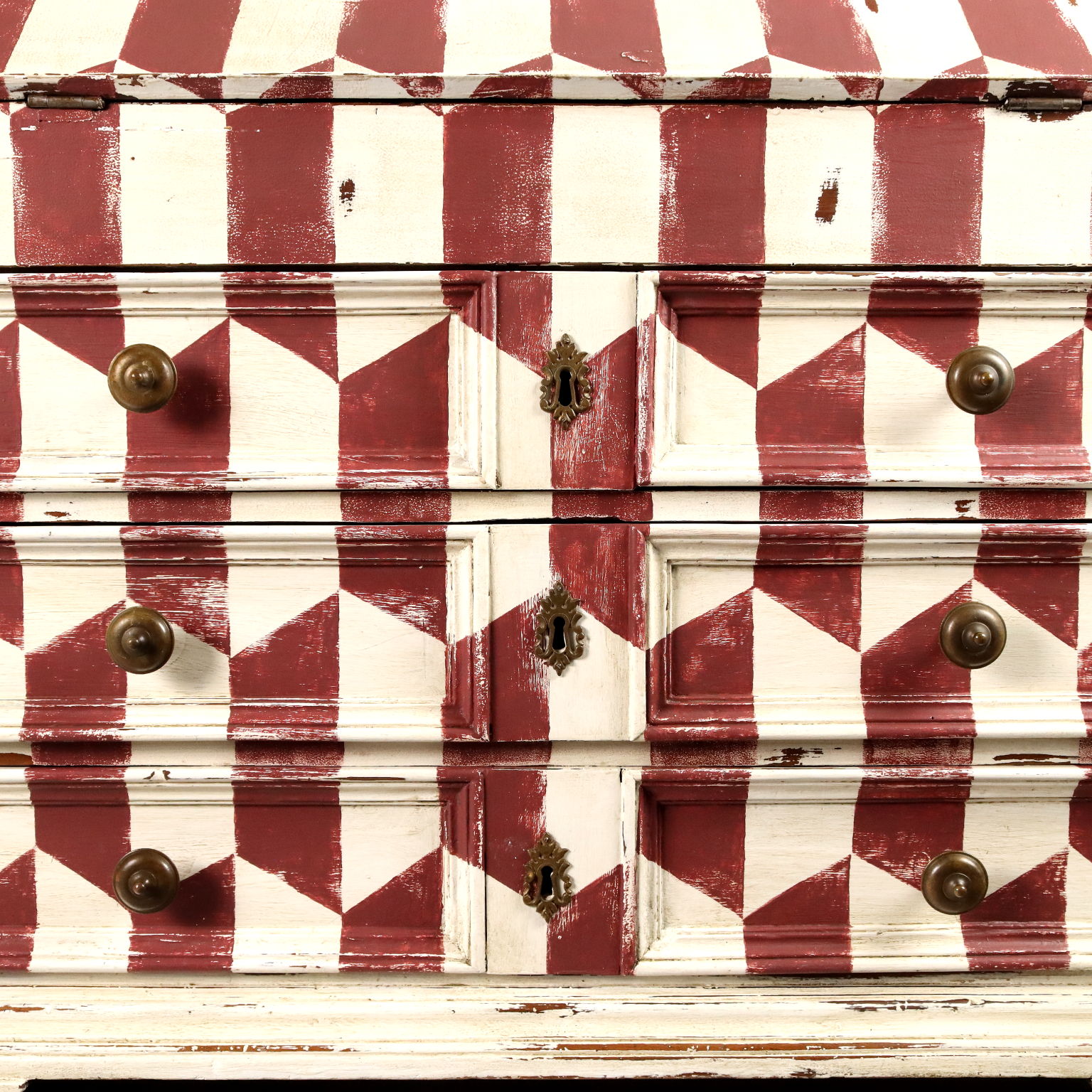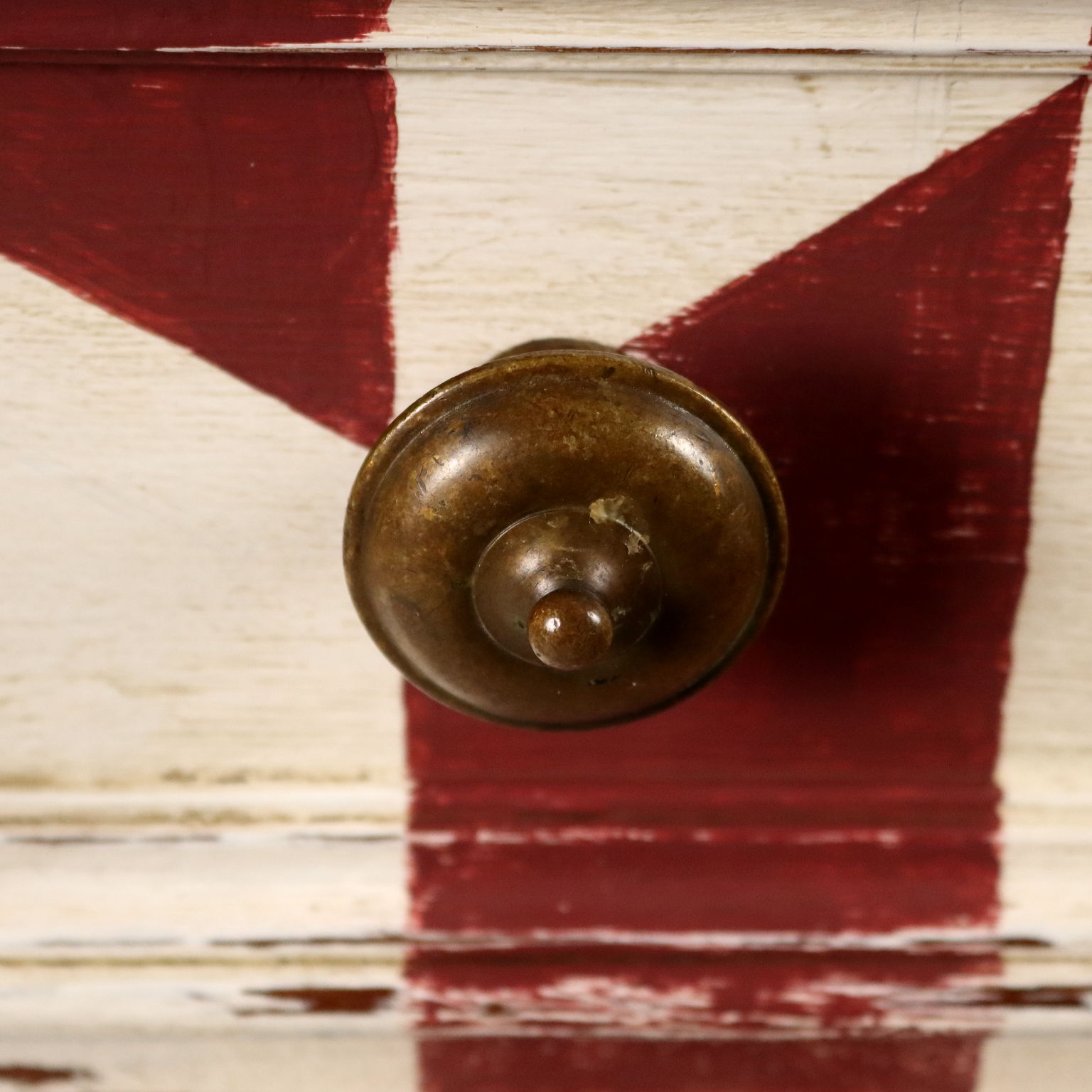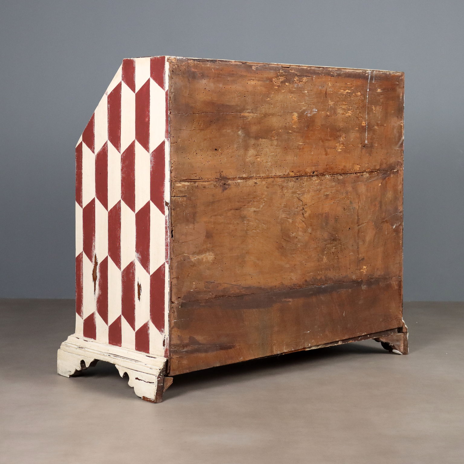 Gli interni sono realizzati in pioppo, un legno chiaro e leggero, mentre l’esterno, originariamente in noce, è stato laccato nei toni caldi dell’avorio e del mattone. La decorazione, caratterizzata da motivi geometrici regolari, è stata realizzata presso i nostri laboratori di restauro, con l’utilizzo esclusivo di prodotti naturali e tecniche rispettose della tradizione. L’intervento, studiato per valorizzare l’estetica senza compromettere l’autenticità, ha mantenuto la completa reversibilità, consentendo all’arredo di essere eventualmente riportato allo stato originario.