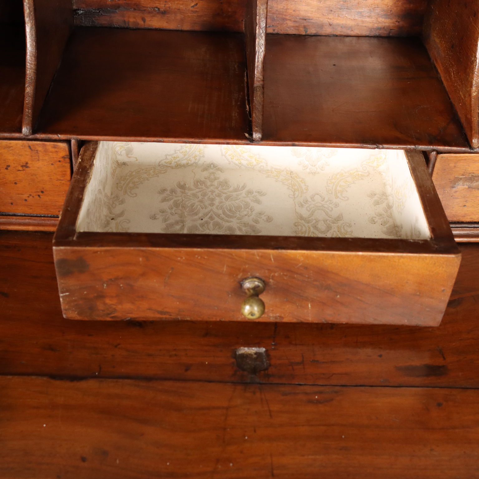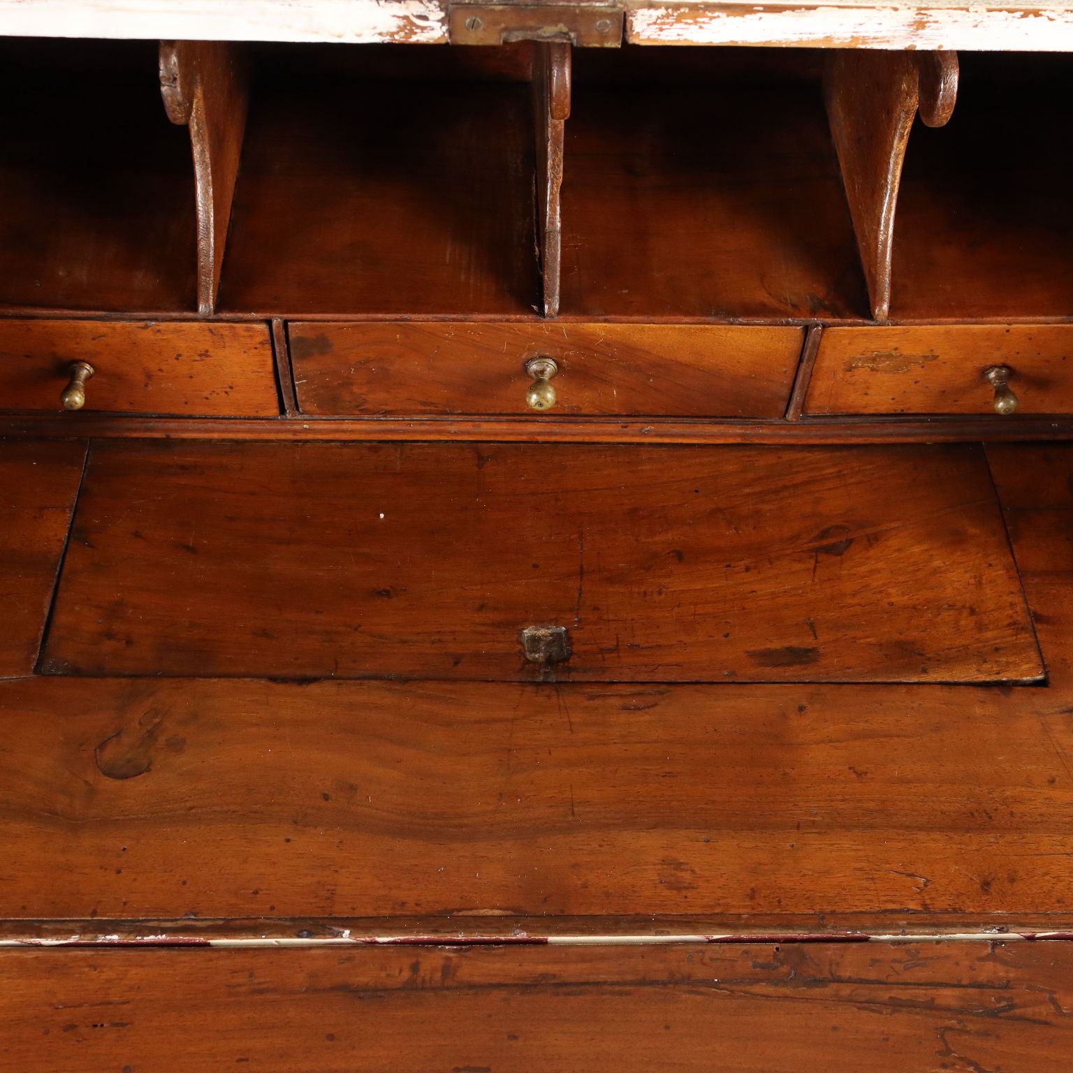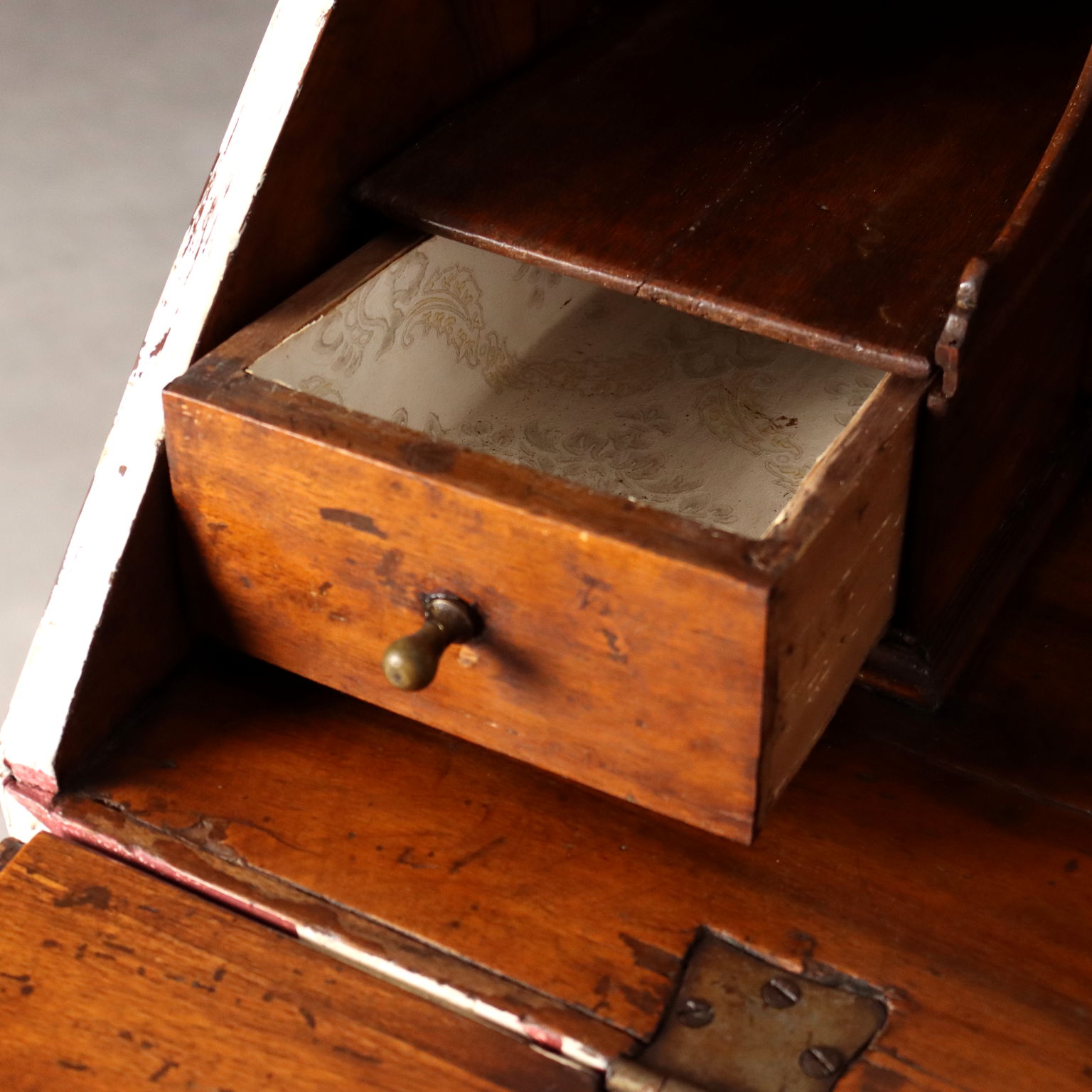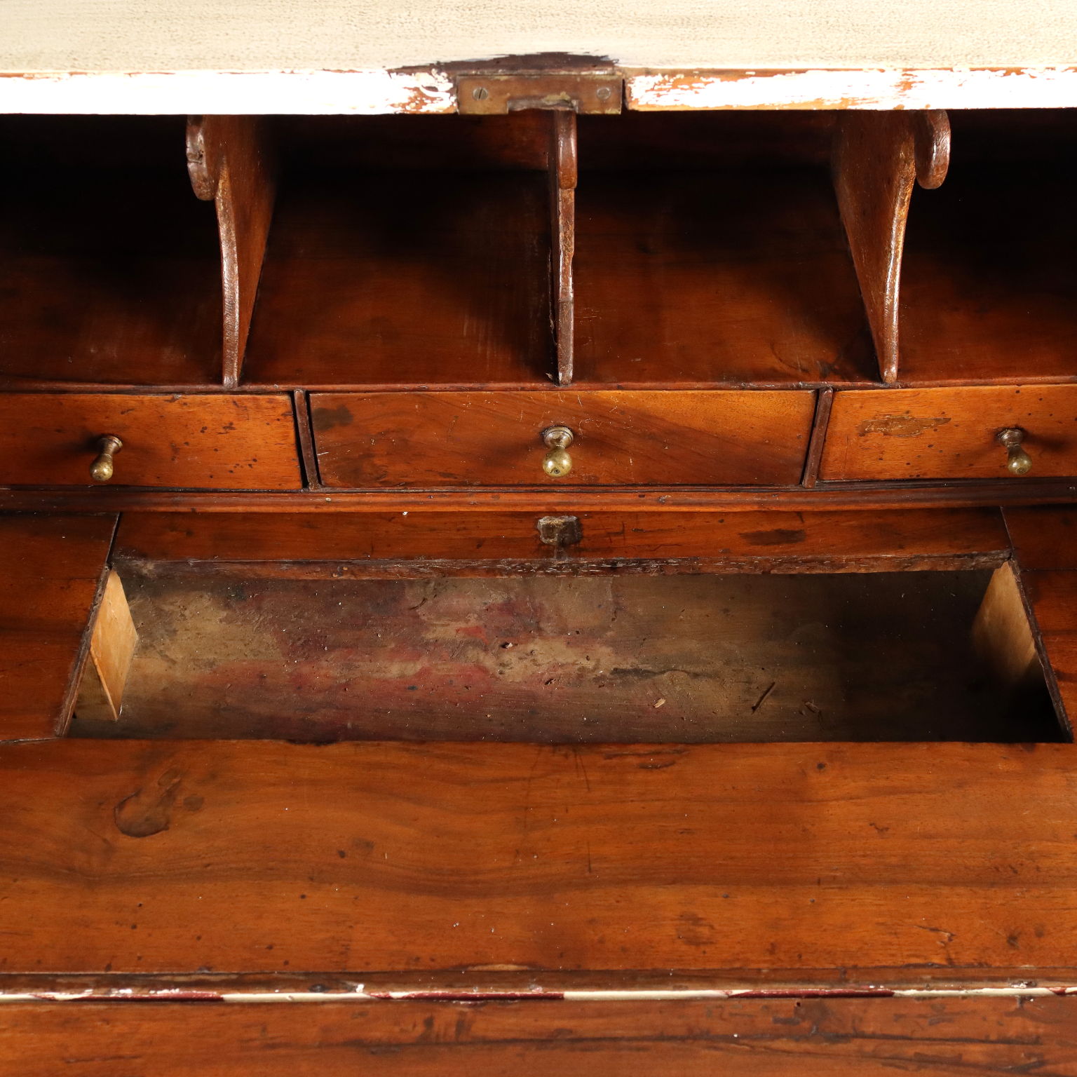 Ribalta barocca in noce laccato, realizzata nell’Italia meridionale agli inizi del XVIII secolo. L’arredo si distingue per la sua elegante struttura e per la funzionalità degli spazi interni. Il fronte presenta un’anta a ribalta che cela uno scarabattolo finemente articolato, composto da vani e piccoli cassetti, oltre a un segreto ricavato sul piano, pensato per custodire documenti o oggetti preziosi. L’anta, una volta aperta, è sorretta da una coppia di tiretti estraibili, mentre la parte inferiore è scandita da tre ampi cassetti con pomoli in bronzo, poggianti su piedi a mensola di gusto barocco.
