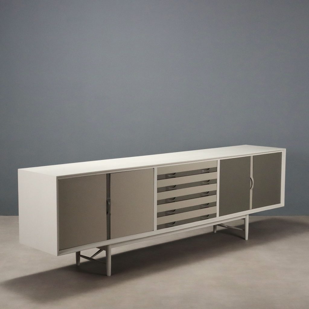 Sideboard restaurato e dipinto nei nostri laboratori interni, dove i nostri artigiani hanno riportato alla luce tutta la sua bellezza originale, arricchendolo con una nuova finitura dal carattere contemporaneo. Realizzato in teak dipinto, questo mobile si distingue per le linee essenziali e pulite che lo rendono elegante e facilmente abbinabile a diversi stili di arredamento, dal moderno al vintage.