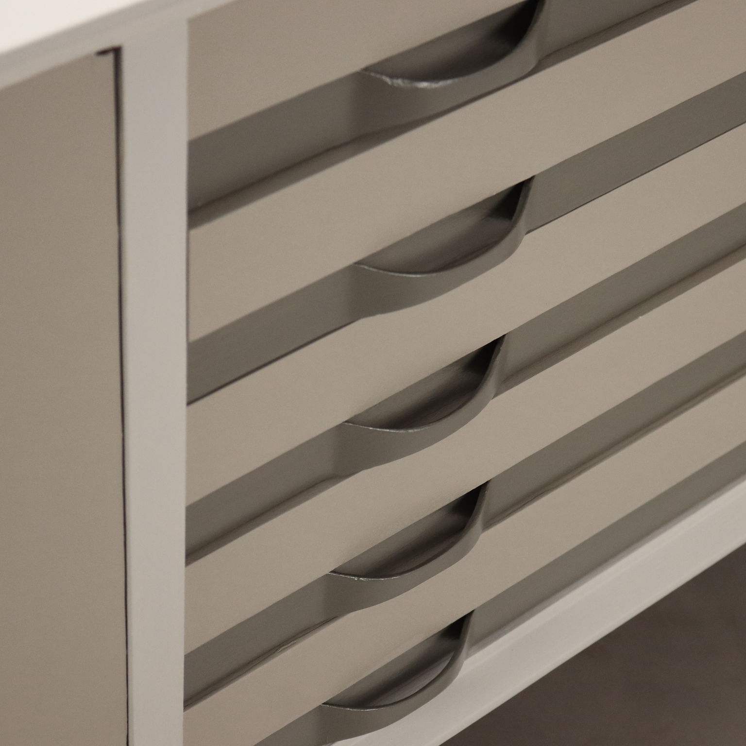 Le dimensioni generose lo rendono un elemento di grande impatto visivo e allo stesso tempo estremamente pratico: il piano superiore offre un’ampia superficie di appoggio, perfetta per accogliere lampade, libri, vasi o oggetti decorativi, trasformandosi così in un punto focale per il living o la sala da pranzo. La struttura è composta da ante a battente che celano spazi capienti per riporre stoviglie, tessili o accessori, affiancate da cinque cassetti centrali con interni in legno che garantiscono ordine e funzionalità nella quotidianità.