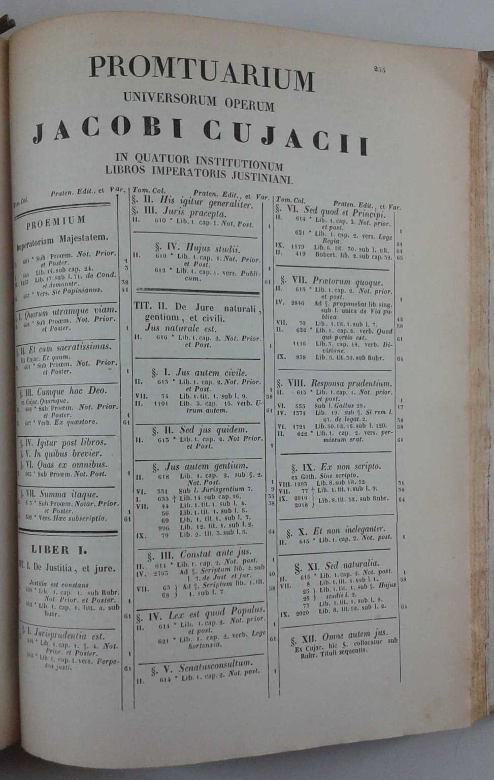 Promptuarium universorum operum Jacobi Cujacii variantibus inter se lectionibus praesertim titulorum, et legum Florentinae, vulgataeque editionis Pandectarum, sive Digestorum accomodatum cura, et industria Dominici Albanensis in supremis Regni Neapolitani tribunalibus causarum patroni. - Opus in binos tomos distributum