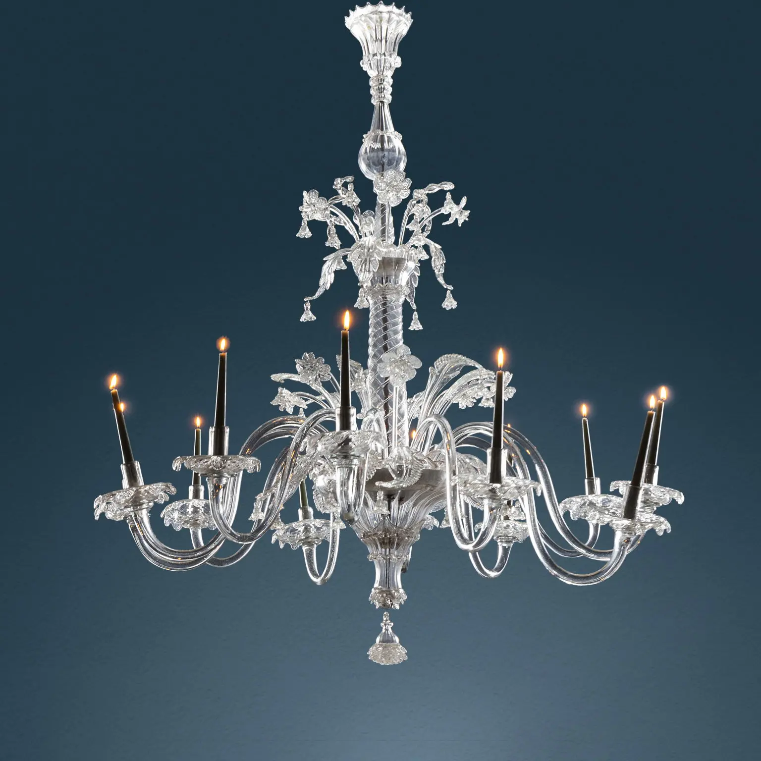 Large Murano chandelier in transparent blown glass with twelve flames, product of Venetian art of the late 18th century. The entire apparatus is centrally supported by a smooth column shaft reproducing a twisted motif, equipped with a metal core. Decorated with a double row of alternating leaves and flowers, similarly present in the upper segment of the column, and pendants. A larger pendant serves as the terminal of the lower section. Upper terminal replaced, restoration of a plate, small chips.