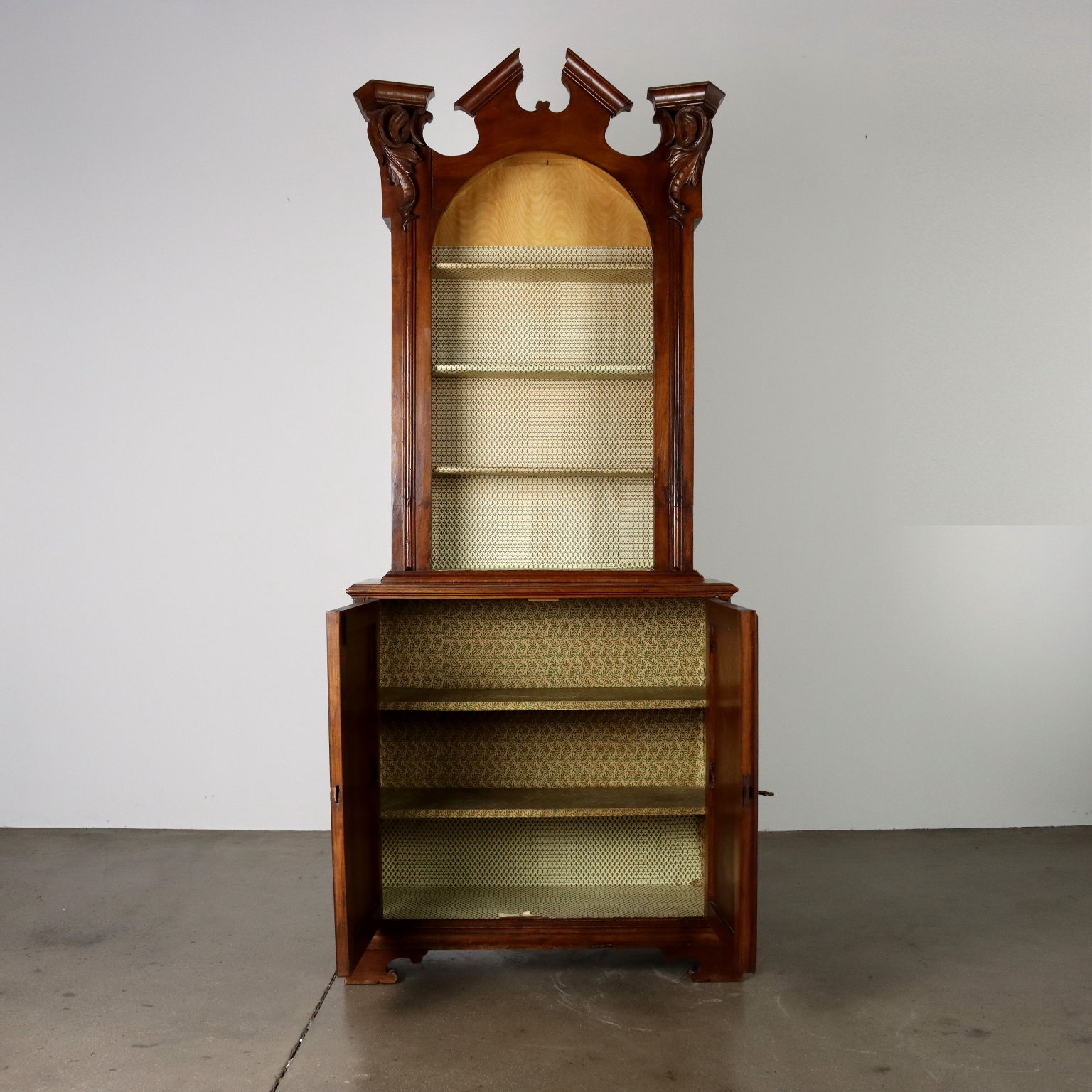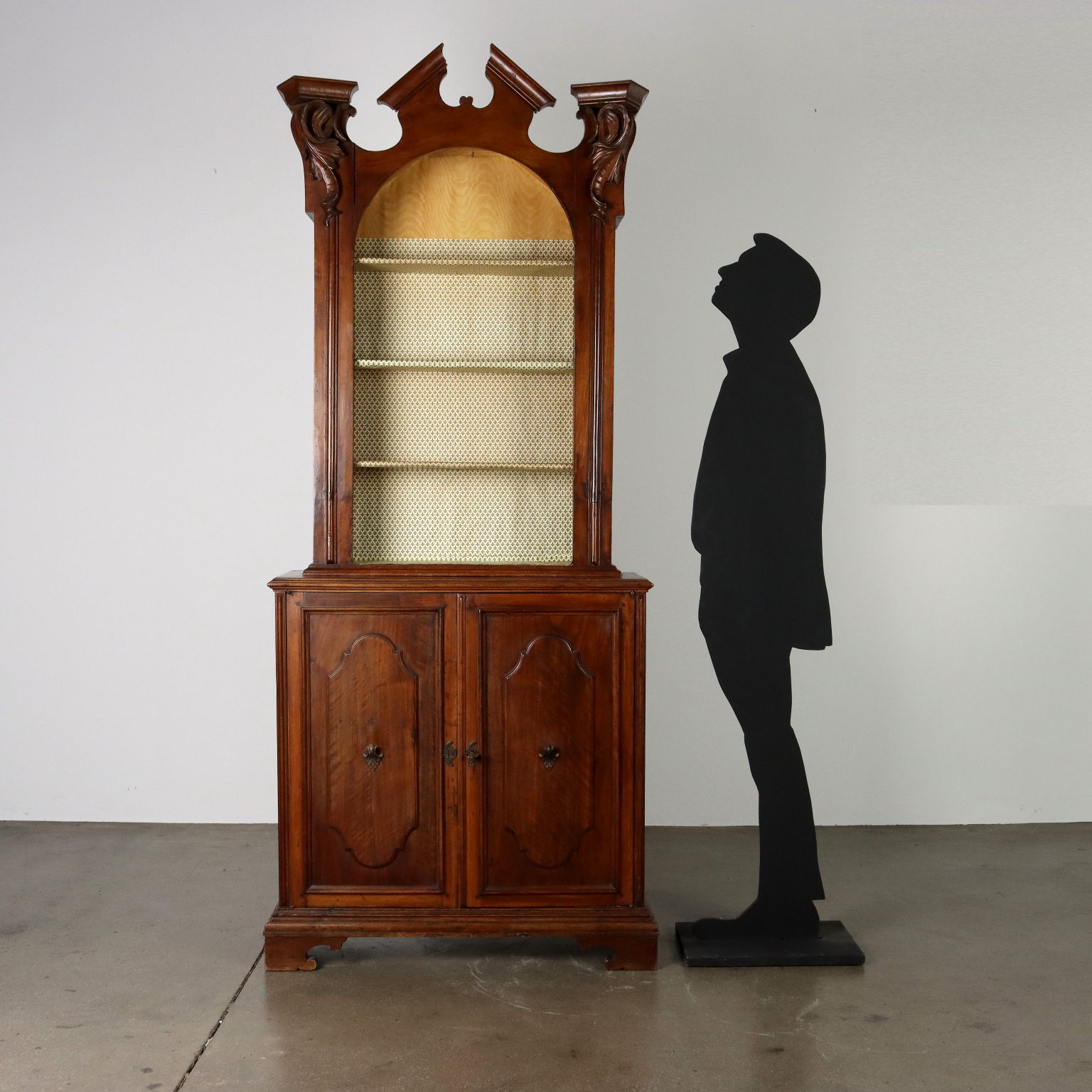 Double-body bookcase Italy style. Cabinet with open top, made of walnut with antique woods; doors with carved panels and elaborate frame.