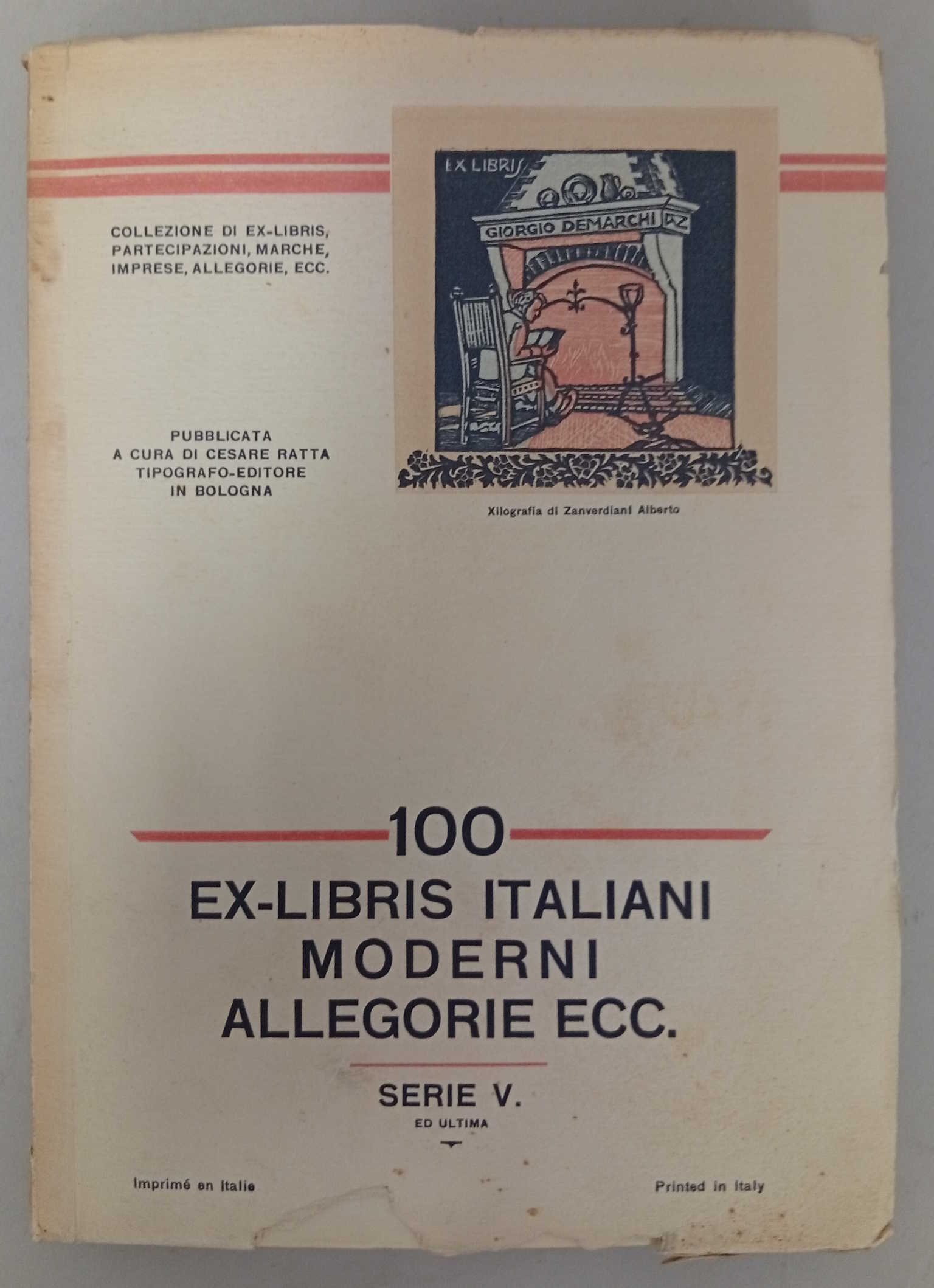 A collection of bookplates, announcements, enterprises, allegories, brands, etc. In the Colophon: Three hundred copies of this fifth and final collection were printed, all numbered consecutively by machine. Copy no. 13. Curiously, the title on the front cover reads: "100 (instead of 130) Modern Italian Bookplates, Allegories, etc."