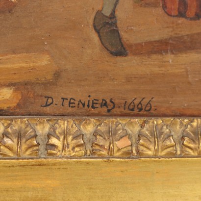Oil on panel. The painting is a revised copy of the famous work by David Teniers the Younger (1610 -1690), executed between 1634 and 1640 and currently preserved at the Prado Museum in Madrid. The title of the lively scene refers to the so-called Twelfth Night, a celebration corresponding to the Epiphany, precisely twelve days after Christmas, which was the last night of celebrations, in which one could drink beyond one's limits, dedicate oneself to love, to partner and gender swapping, a sort of carnival, during which the King of Misrule (literally the king of Misrule) was elected, a ruler in reverse who imposed his laws, subverting rules and behaviors. This work, like many others by Teniers, had such success linked to the numerous commissions from royals and aristocrats during the 18th century, as to induce a large posthumous production of copyists, many of whom even signed with the artist's name. The painting presented here has several paint losses, to be remedied. It is in a late 19th century frame, adapted for size.