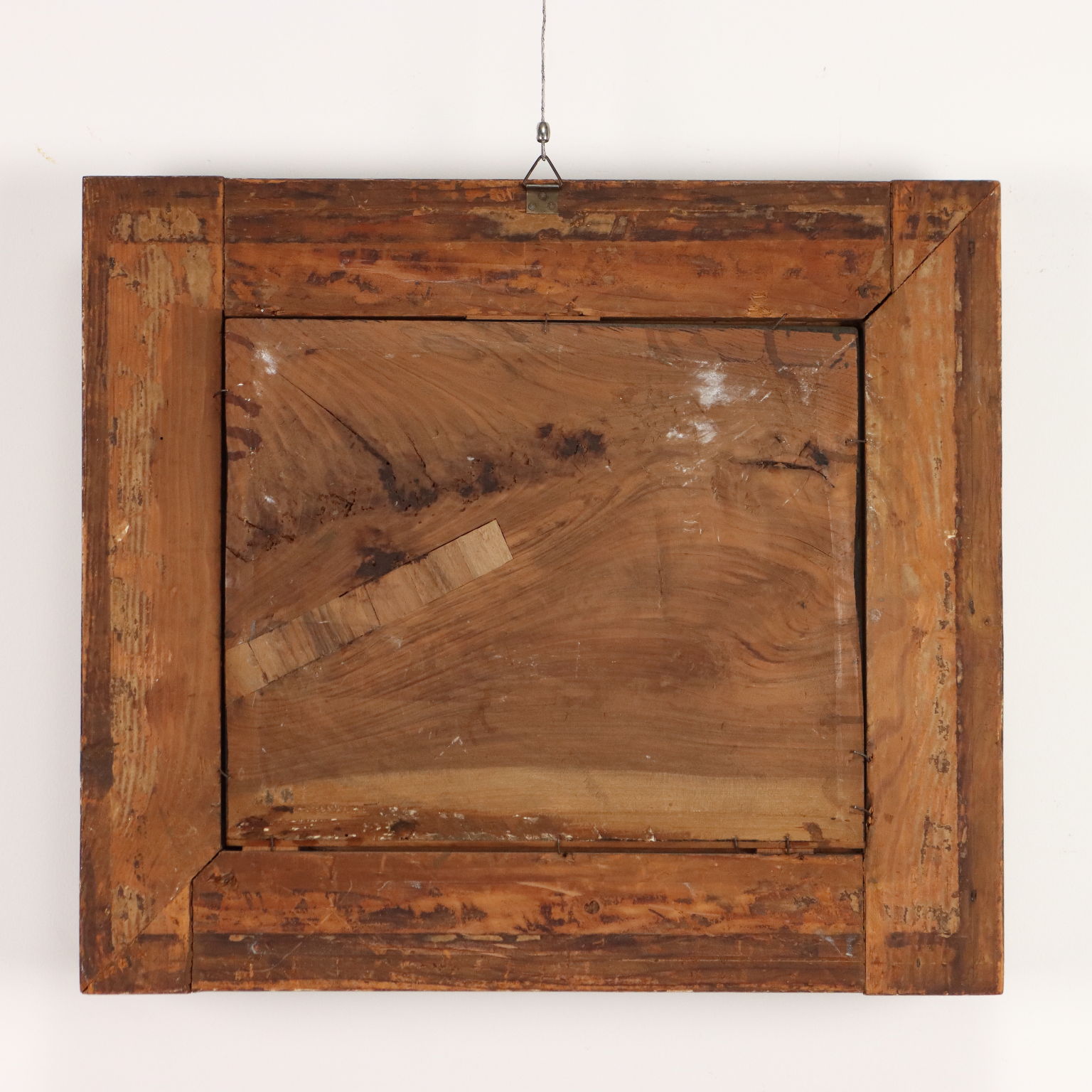 La pittura è l'arte che consiste nell'applicare dei pigmenti a un supporto come la carta, la tela, la seta, la ceramica, il legno, il vetro o un muro. Essendo i pigmenti essenzialmente solidi, è necessario utilizzare un legante, che li porti a uno stadio liquido, più fluido o più denso, e un collante, che permetta l'adesione duratura al supporto. Chi dipinge è detto pittore o pittrice. Il risultato è un'immagine che, a seconda delle intenzioni dell'autore, esprime la sua percezione del mondo o una libera associazione di forme o un qualsiasi altro significato, a seconda della sua creatività, del suo gusto estetico e di quello della società di cui fa parte.Technical specification: Oil on Board