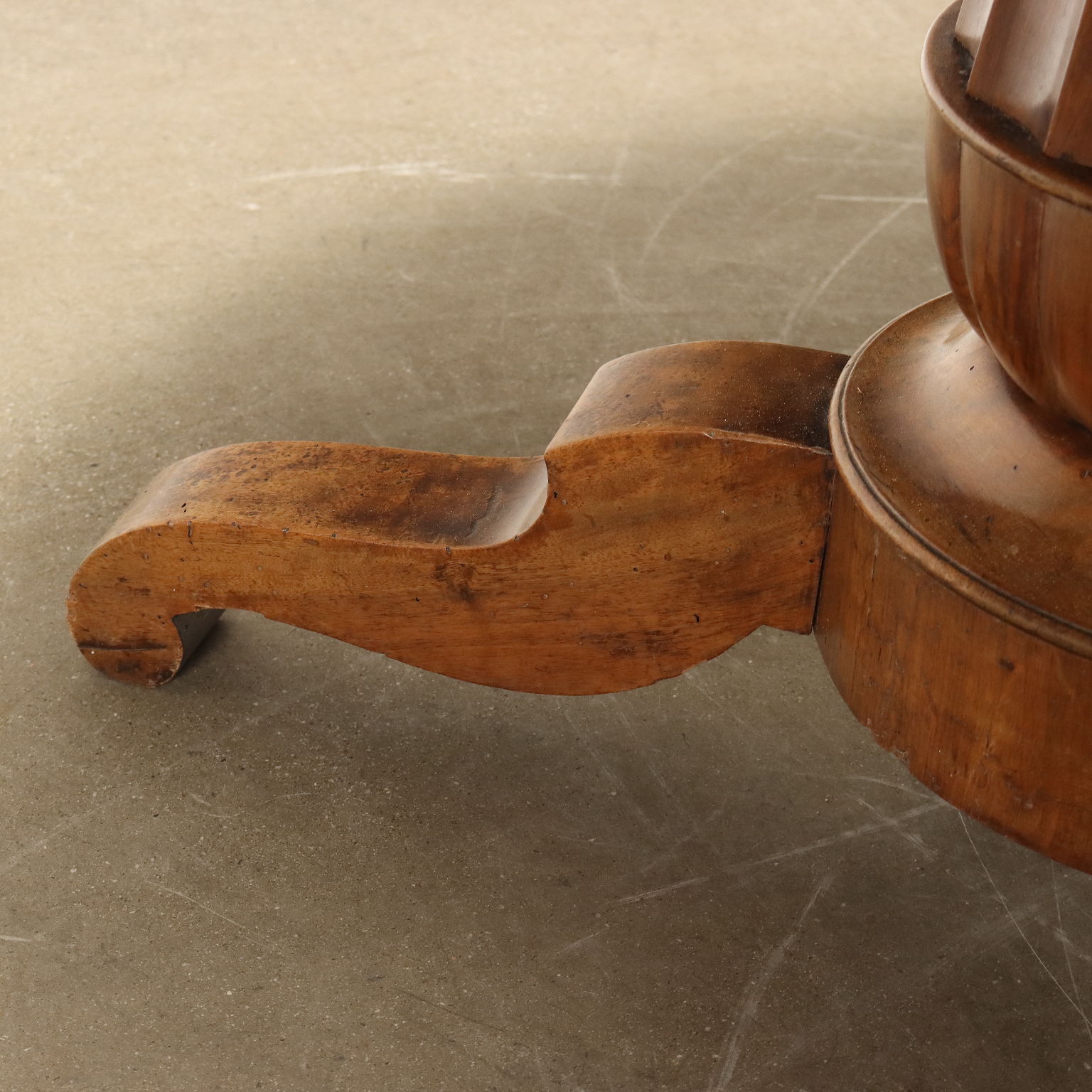 Round walnut table, drawer in the band under the top, central leg resting on three wavy feet. Missing parts Italy, 19th century.
