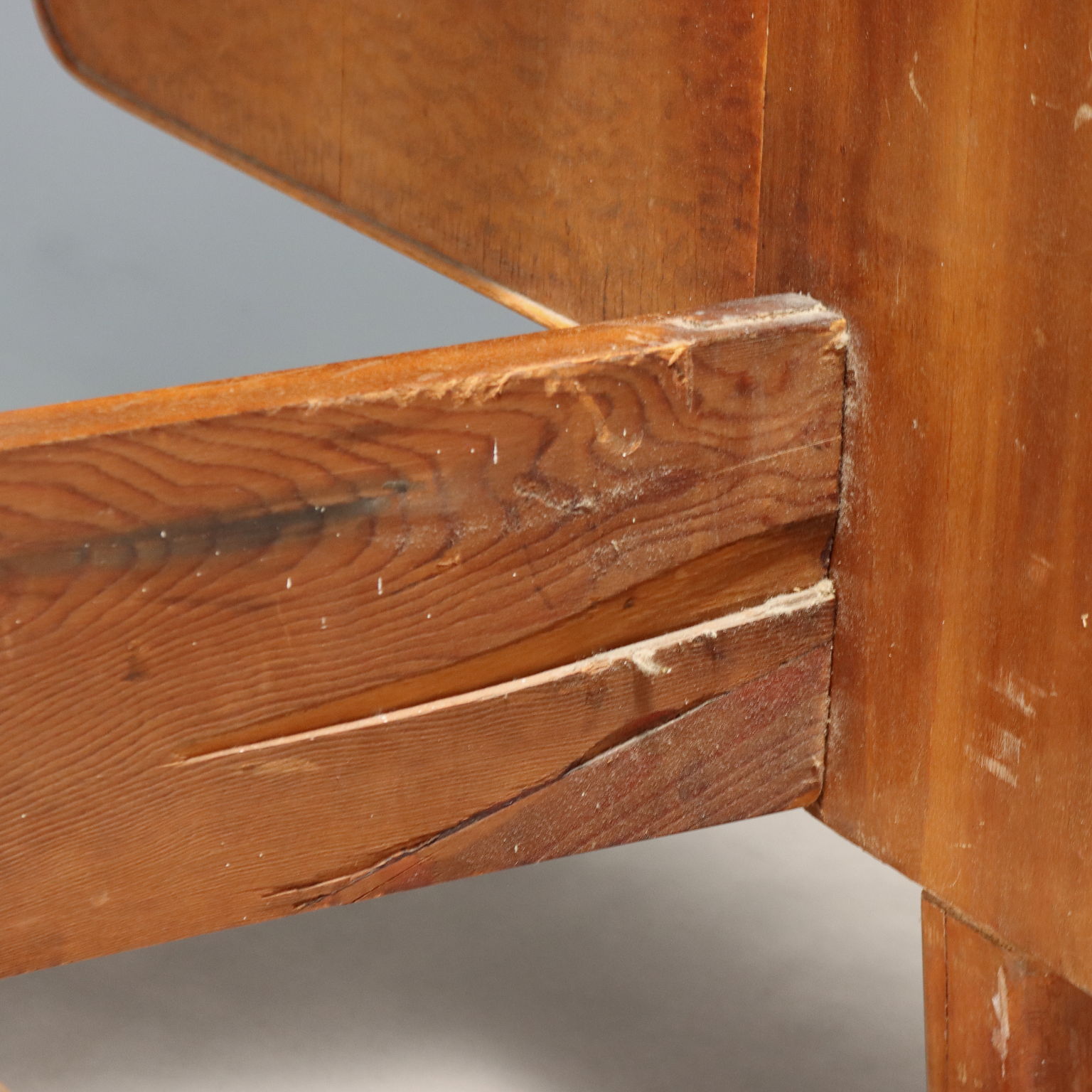 Vintage double bed with maple burl veneer, two small bedside tables built into the headboard with glass tops. Brass handles and end caps.