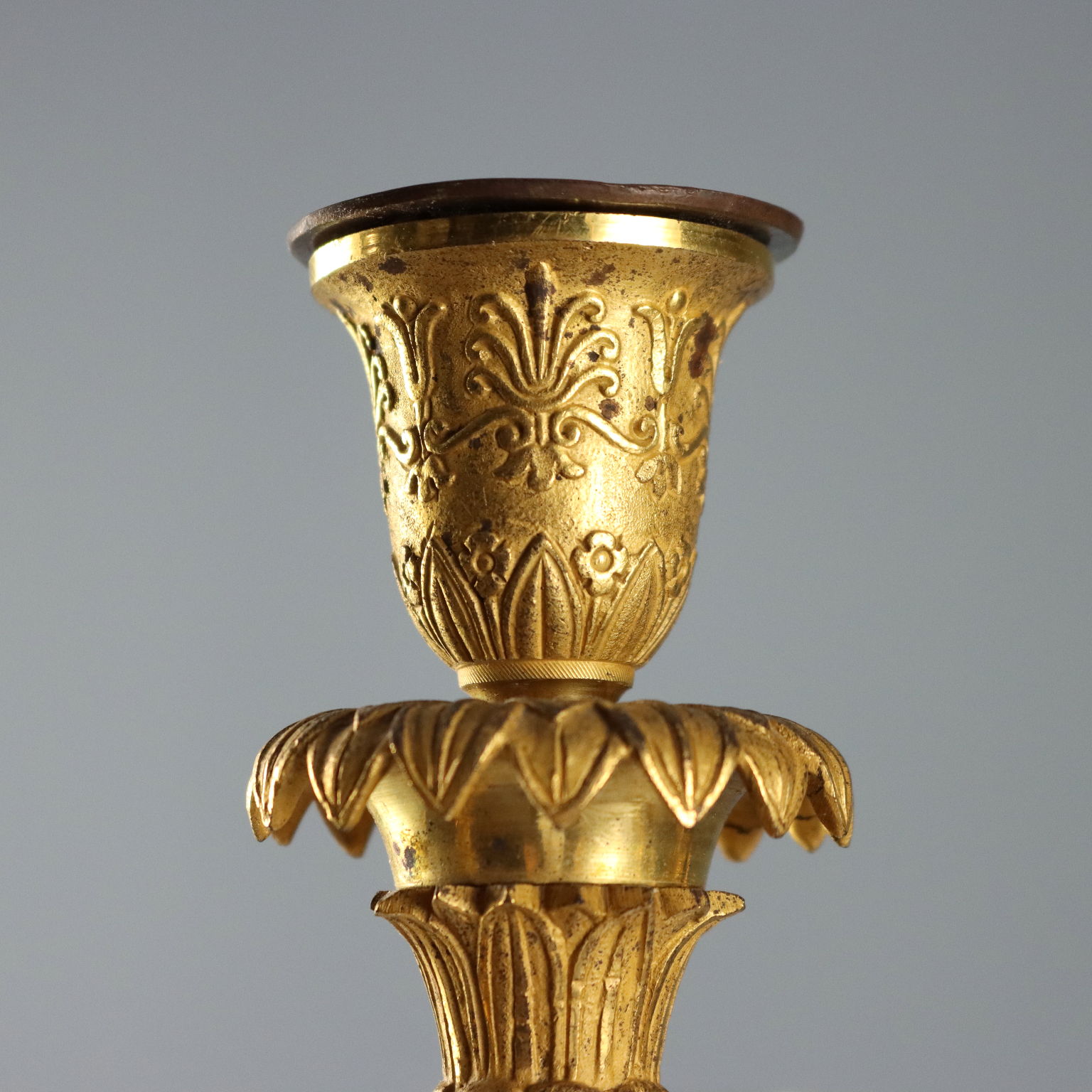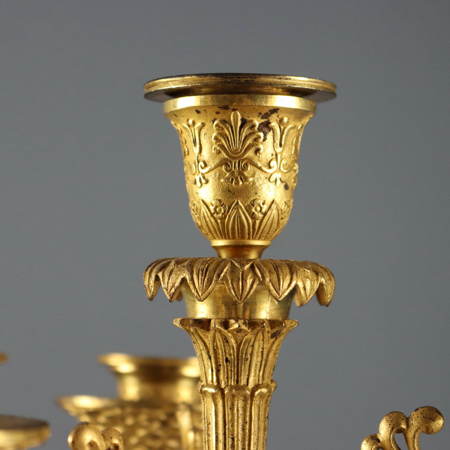 Pair of four-light candelabra in mercury-gilded bronze. Circular base decorated and chiseled with repeated vegetal motifs, from which a fluted column rises, its capital finely adorned with acanthus leaves. The column supports a stump from which the four flames emanate. Complete with drip trays, but two are slightly different.