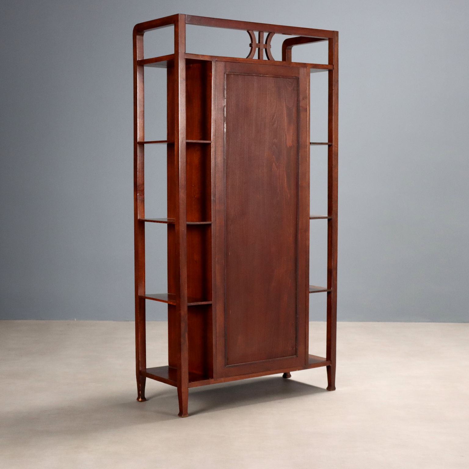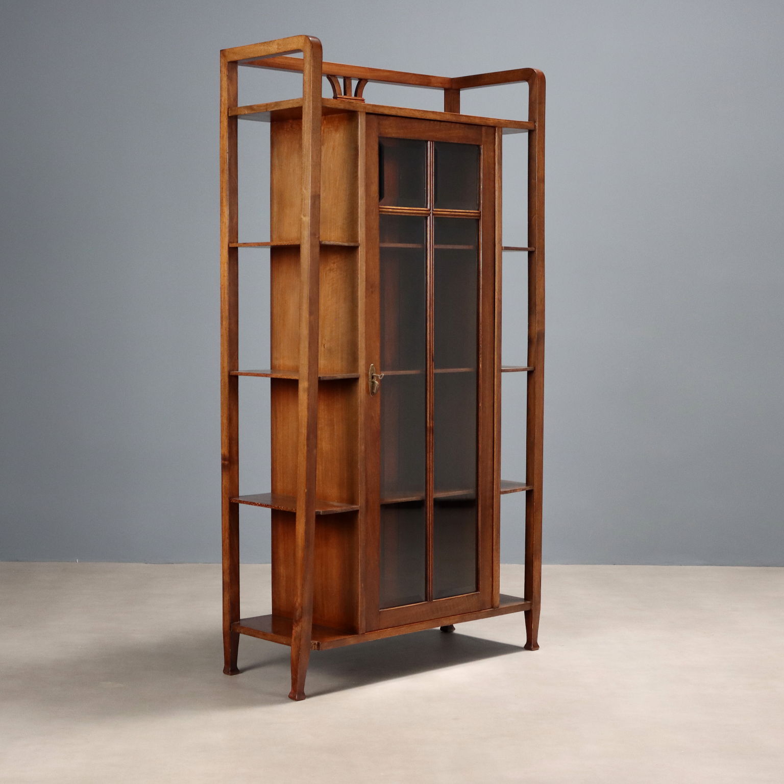 Art Nouveau display cabinet in walnut and stained beech, in the Thonet style. Central body with a quadripartite door with beveled glass, four side shelves, and an upper shelf with a balustrade. Austria, late 19th century.