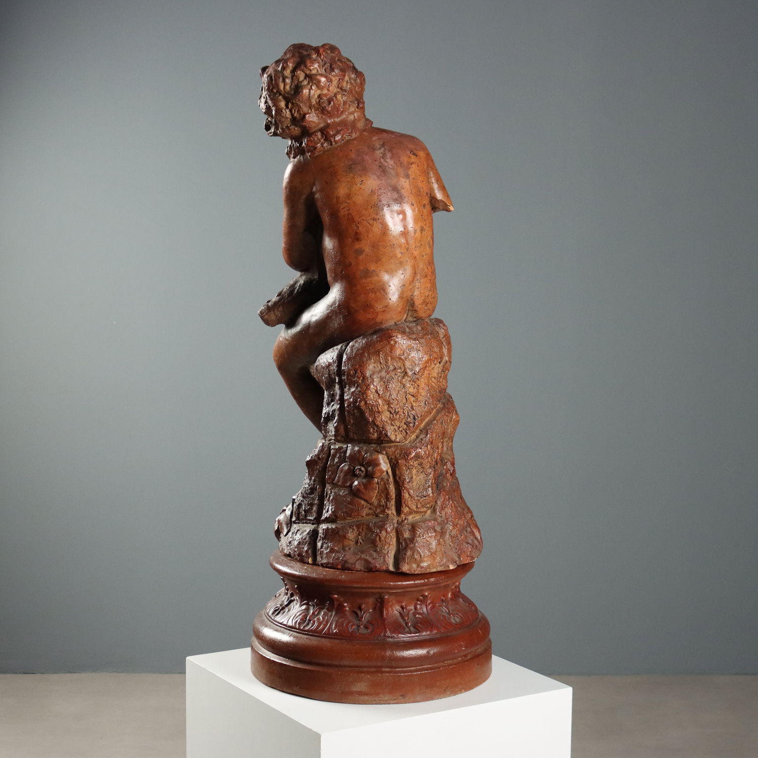 Patinated terracotta sculpture depicting a boy with a dove sitting on a stump. The statue is presented on a circular stand decorated with plant motifs.