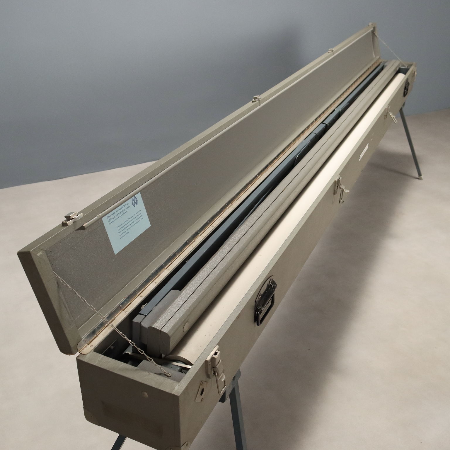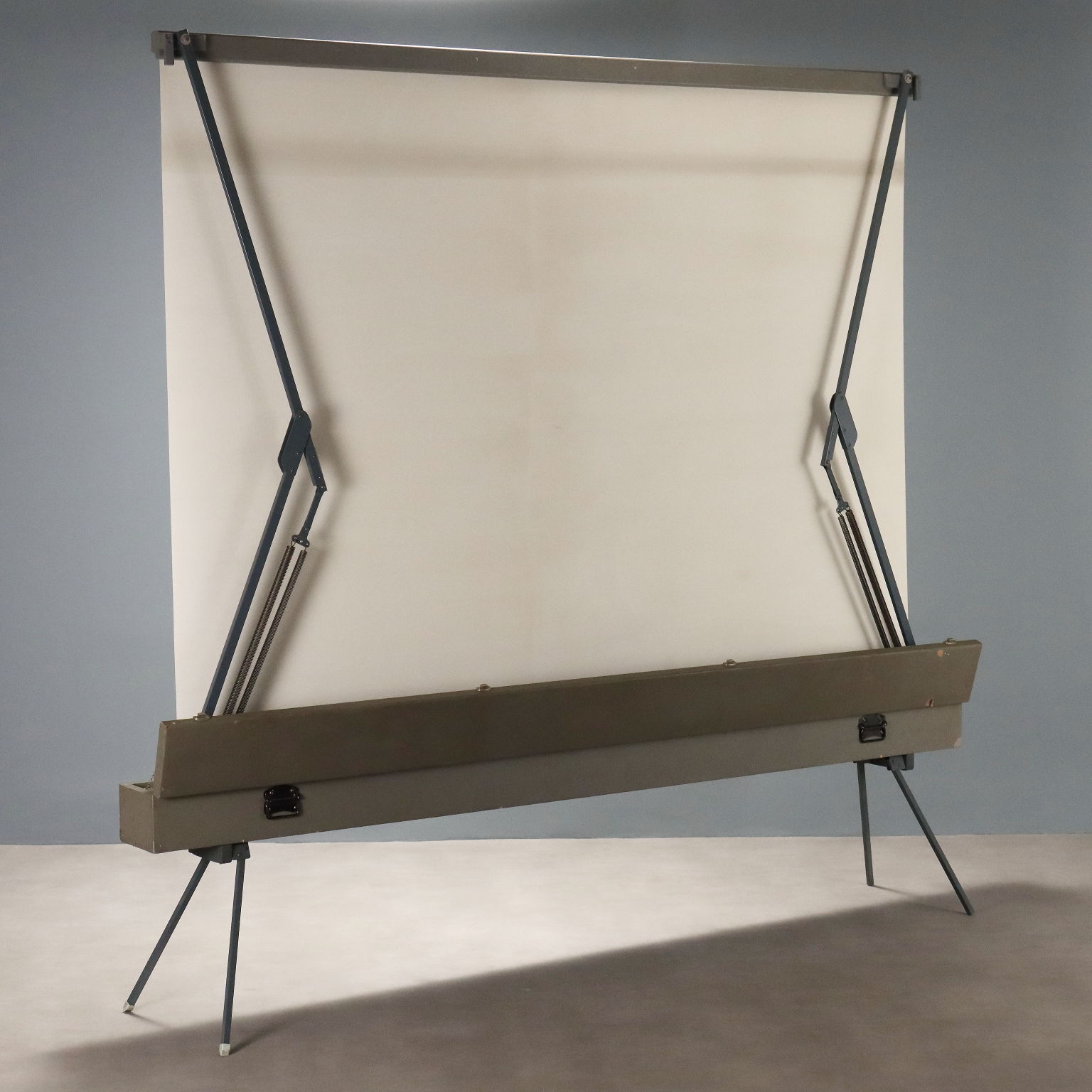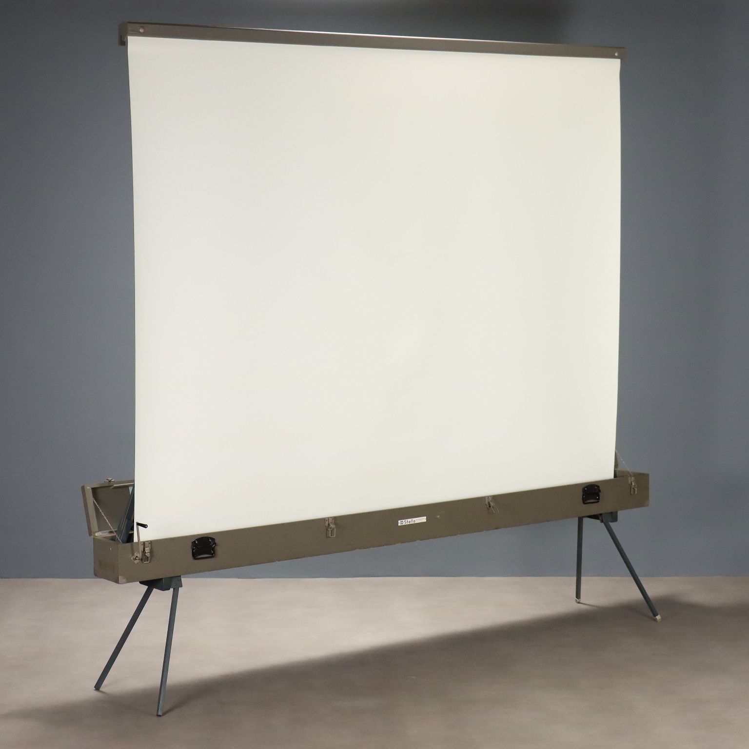 Projection screen with a metal frame and foldable arms. It comes with a coated wooden case, four locking hooks, and two metal handles. The screen measures approximately 3m x 3m. It features a metal plaque on the front indicating the manufacturer's name and a label inside.