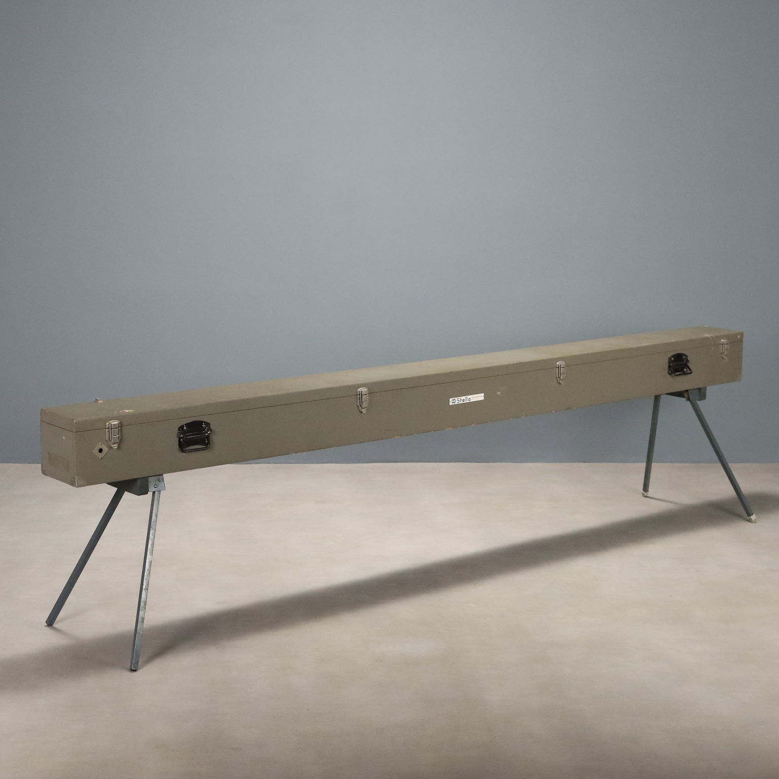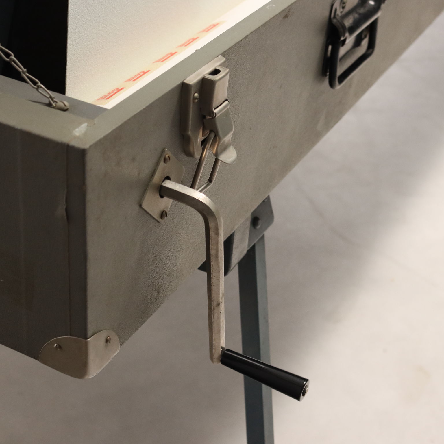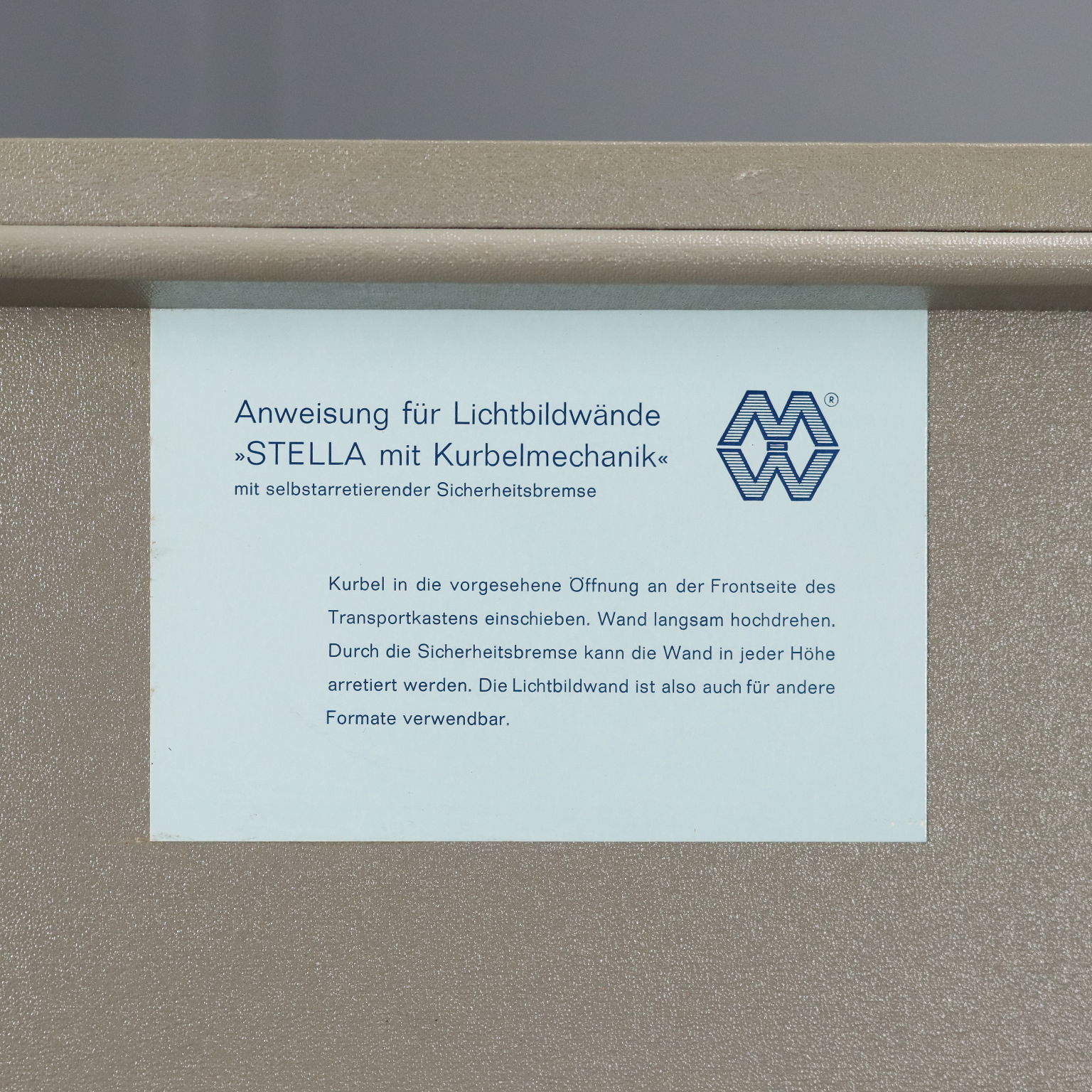 Projection screen with a metal frame and foldable arms. It comes with a coated wooden case, four locking hooks, and two metal handles. The screen measures approximately 3m x 3m. It features a metal plaque on the front indicating the manufacturer's name and a label inside.