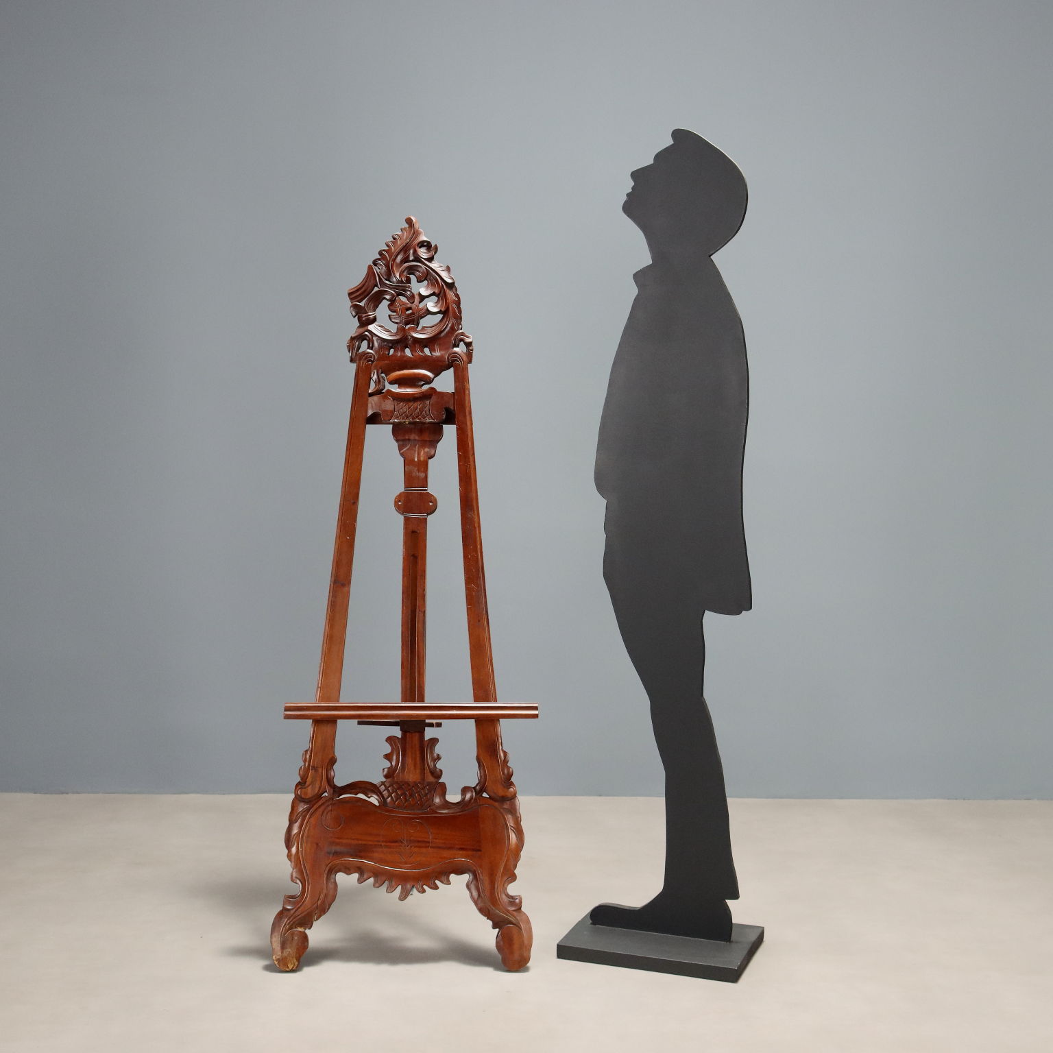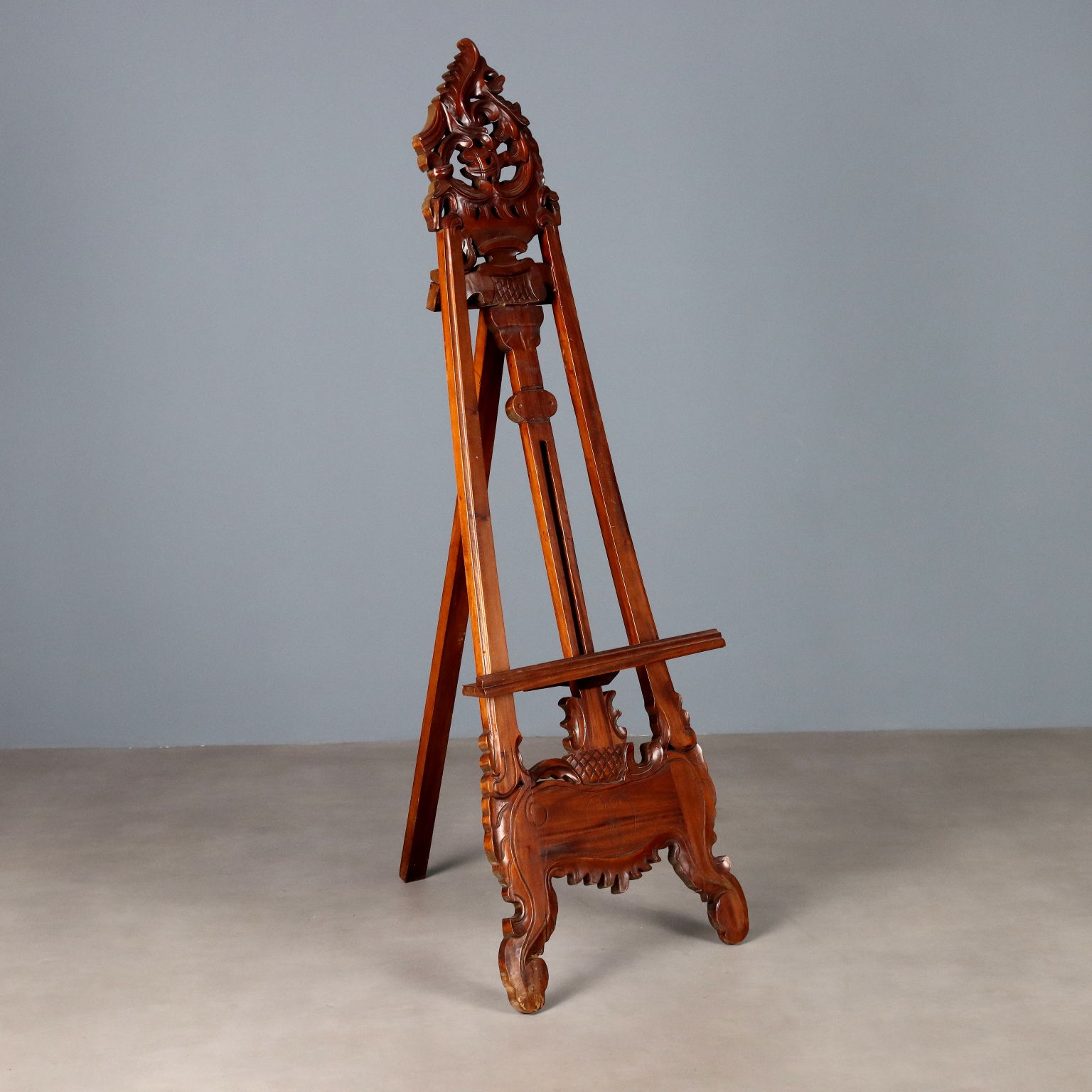 Louis Philippe mahogany easel. The fretworked top is carved with scrolls and leaves, as are the feet and the crosspiece. Italy, mid-19th century.
