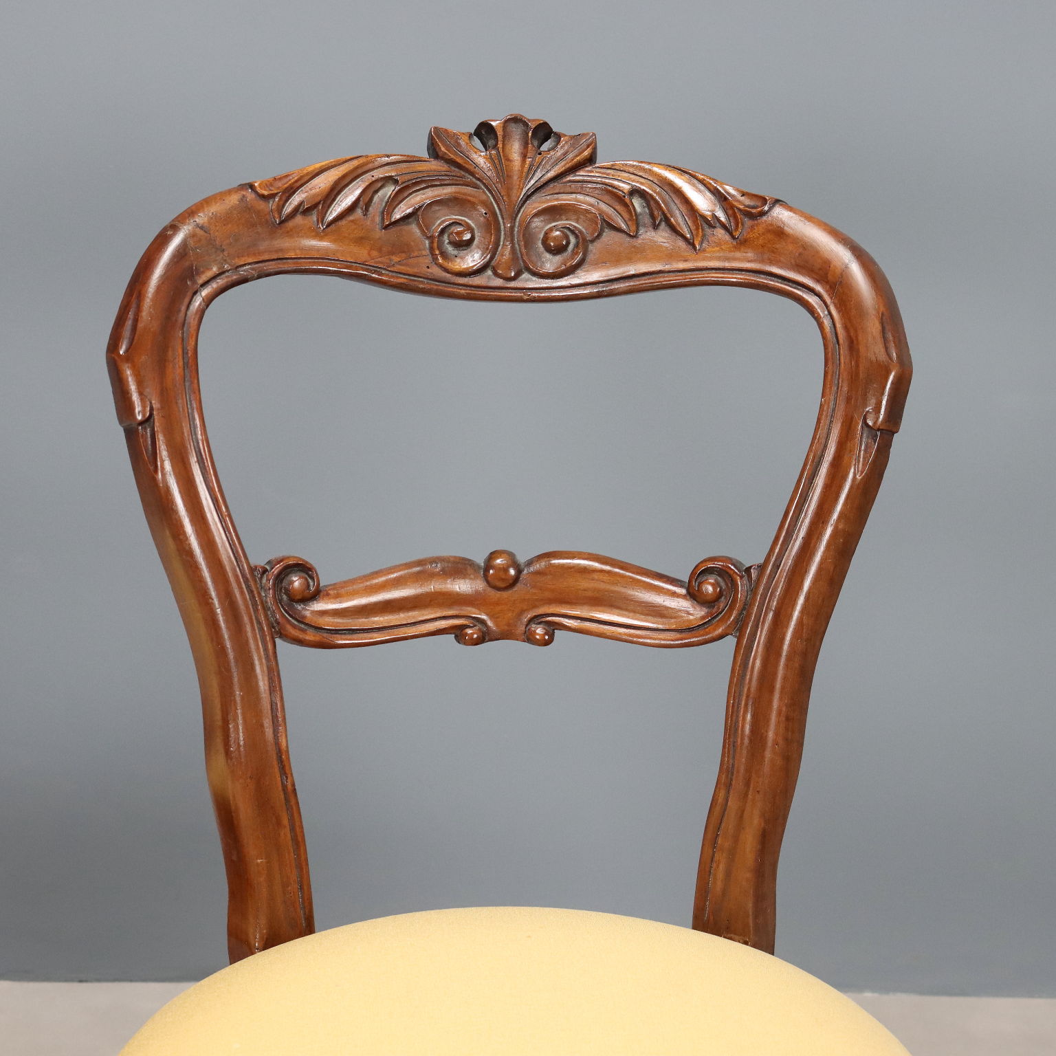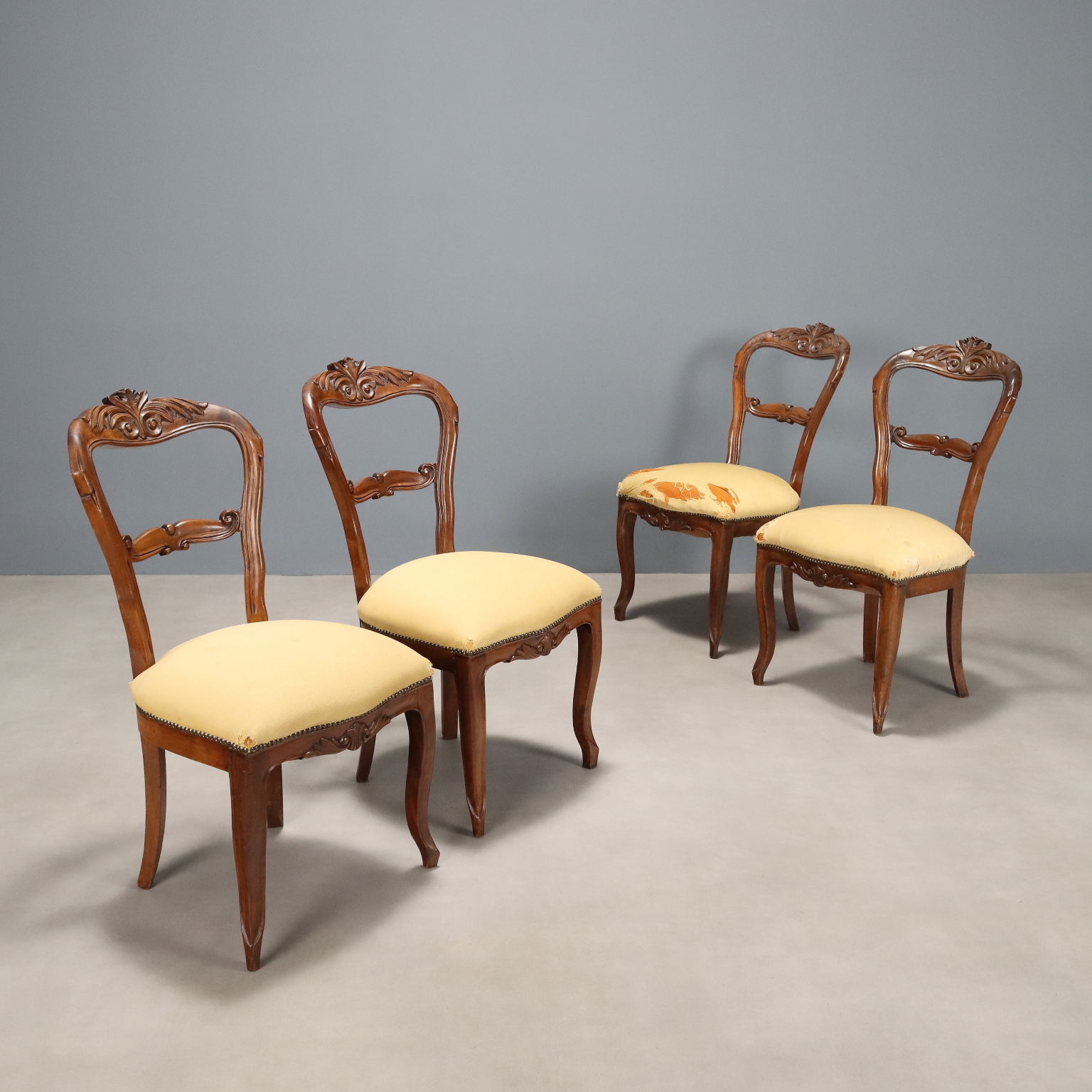 Set of four Louis Philippe walnut chairs. Open backrest carved with scrolls, as does the seat crosspiece. Sculpted legs, upholstered seat. Italy, second quarter of the 19th century.