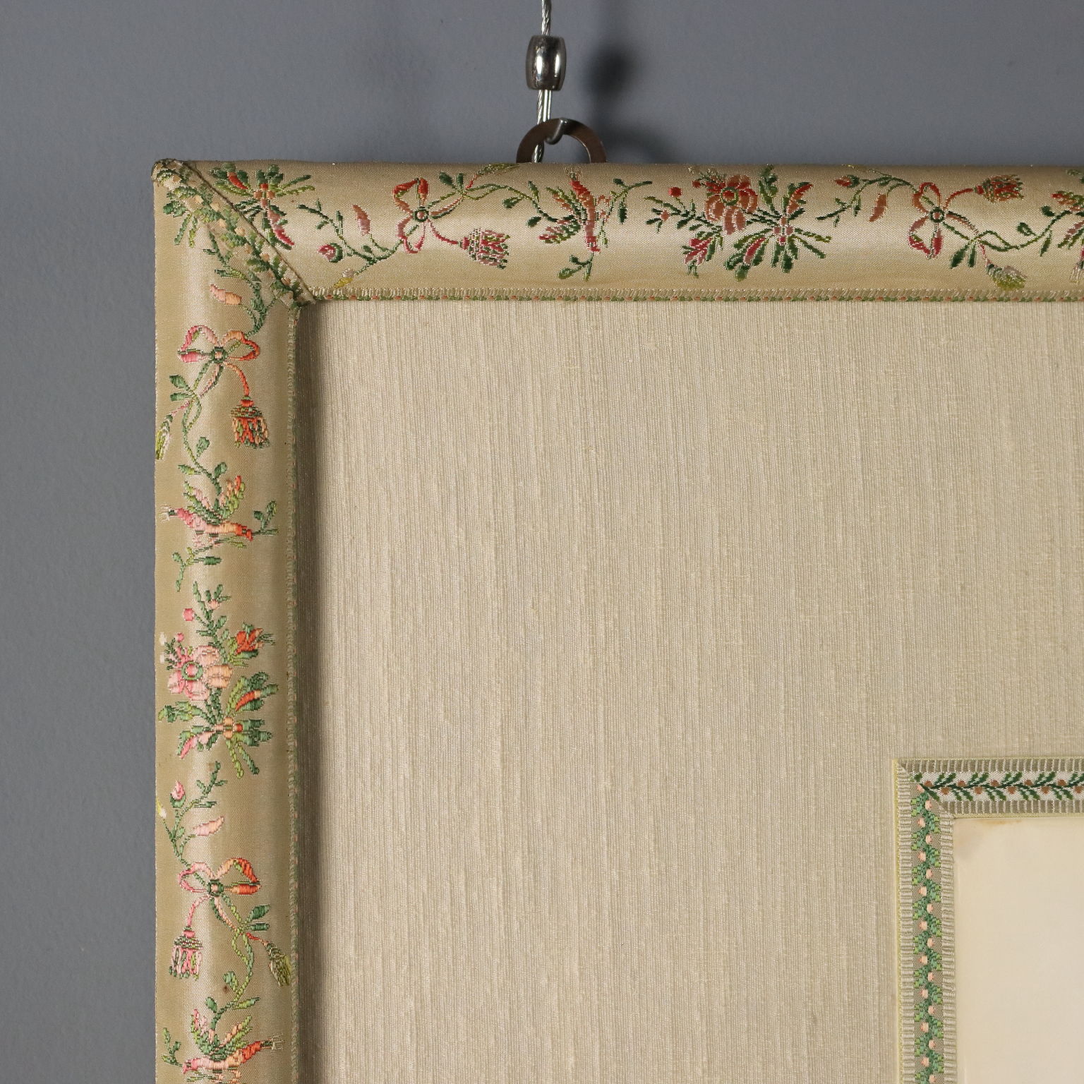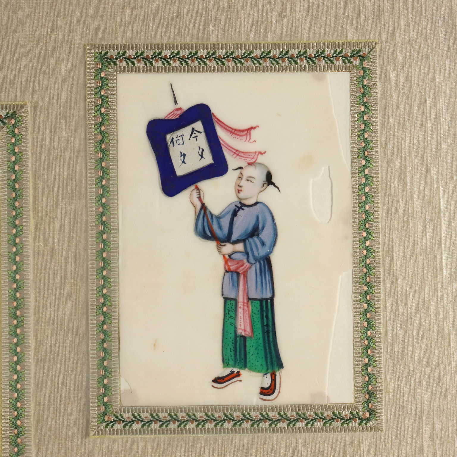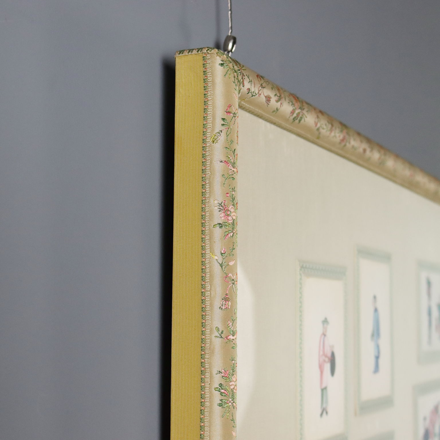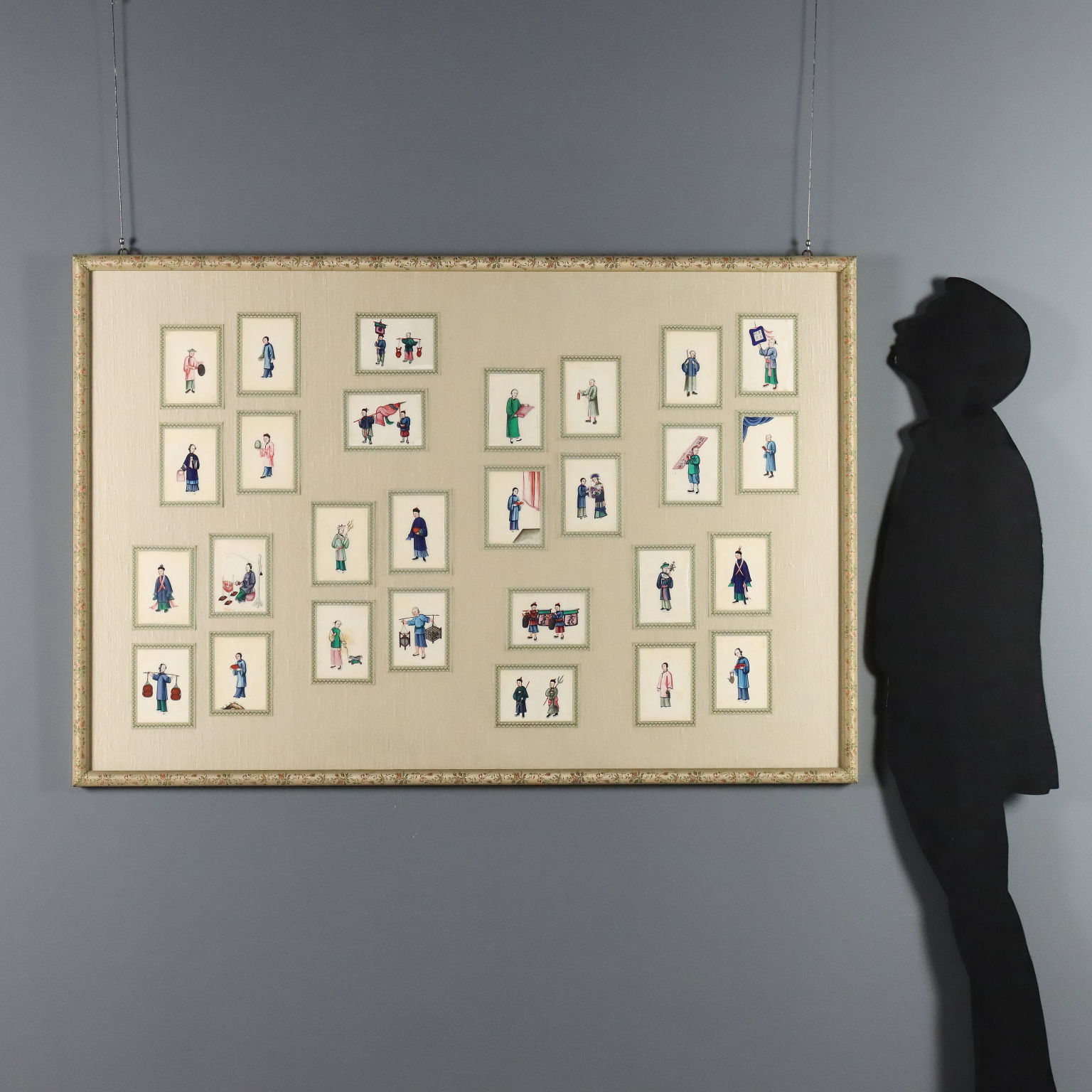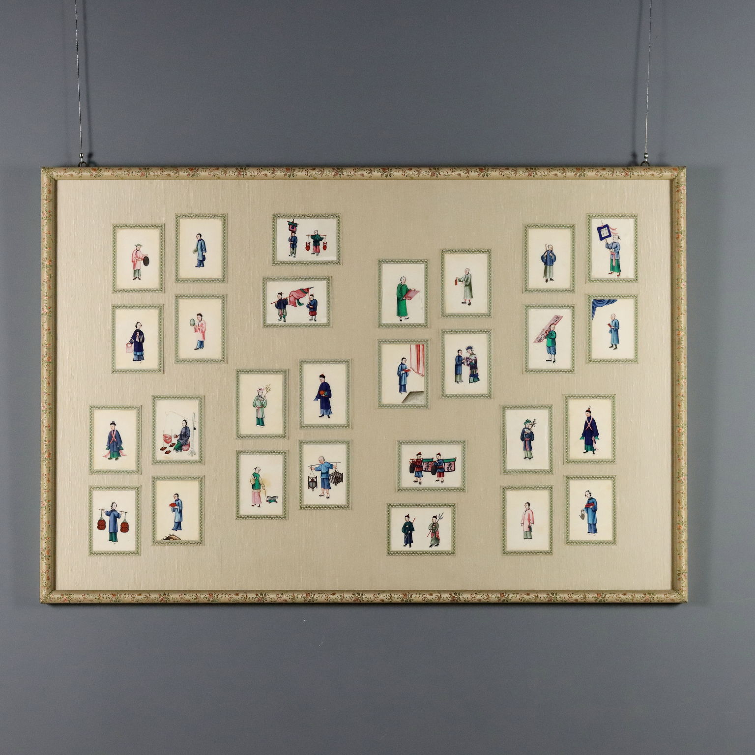 Tempera on pith paper. Chinese, Canton, Qing dynasty, ca. 1860. A collection of twenty-eight paintings depicting Chinese courtiers, scholars, and merchants. Originally kept in an album, they are presented here in a beautiful frame decorated with embroidered floral fabrics. Pith paper is a thin, translucent material derived from the pith of the Tetrapanax papyrifer tree, or "pith plant," native to China and Taiwan. Pith paper entered painting to meet the growing demand for small, inexpensive, and easily transportable souvenirs following the massive growth of trade with China in the first quarter of the 19th century. Because many were sold in albums and thus protected from light, they retain their vibrant colors even today.