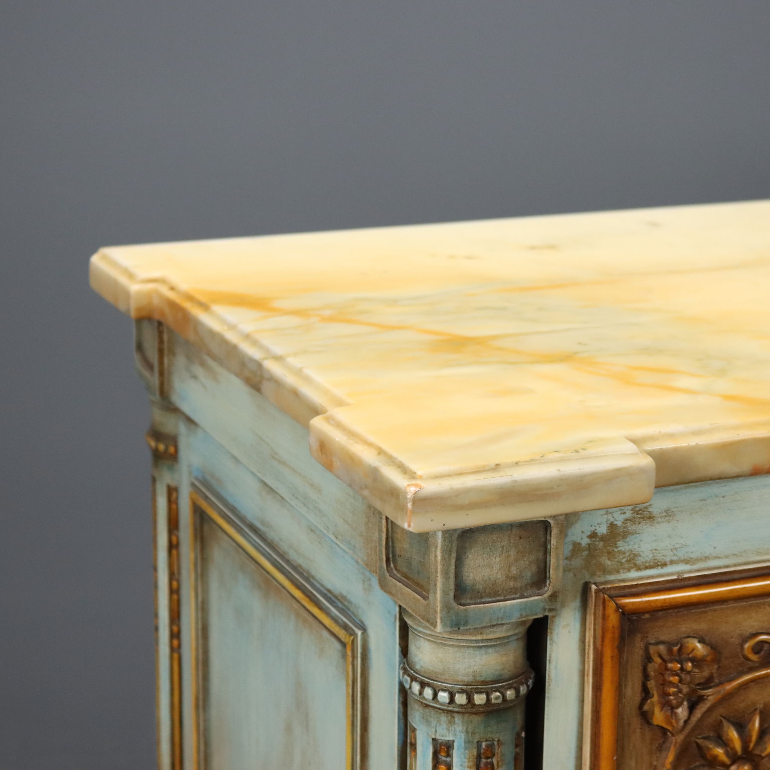Neoclassical chest of drawers. The front of the two drawers is richly carved with grape vines, the sides are turned, and the feet are carved in a truncated cone shape. The handles are wrought bronze, the top is white marble. Italy, 20th century.