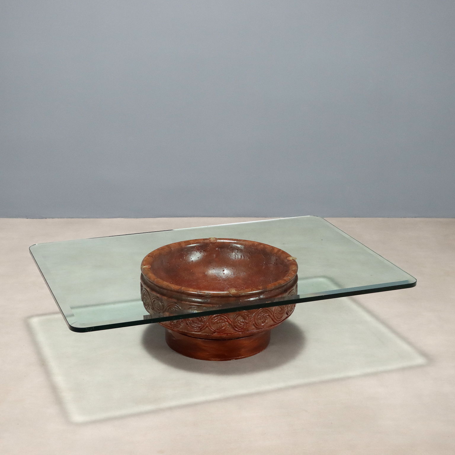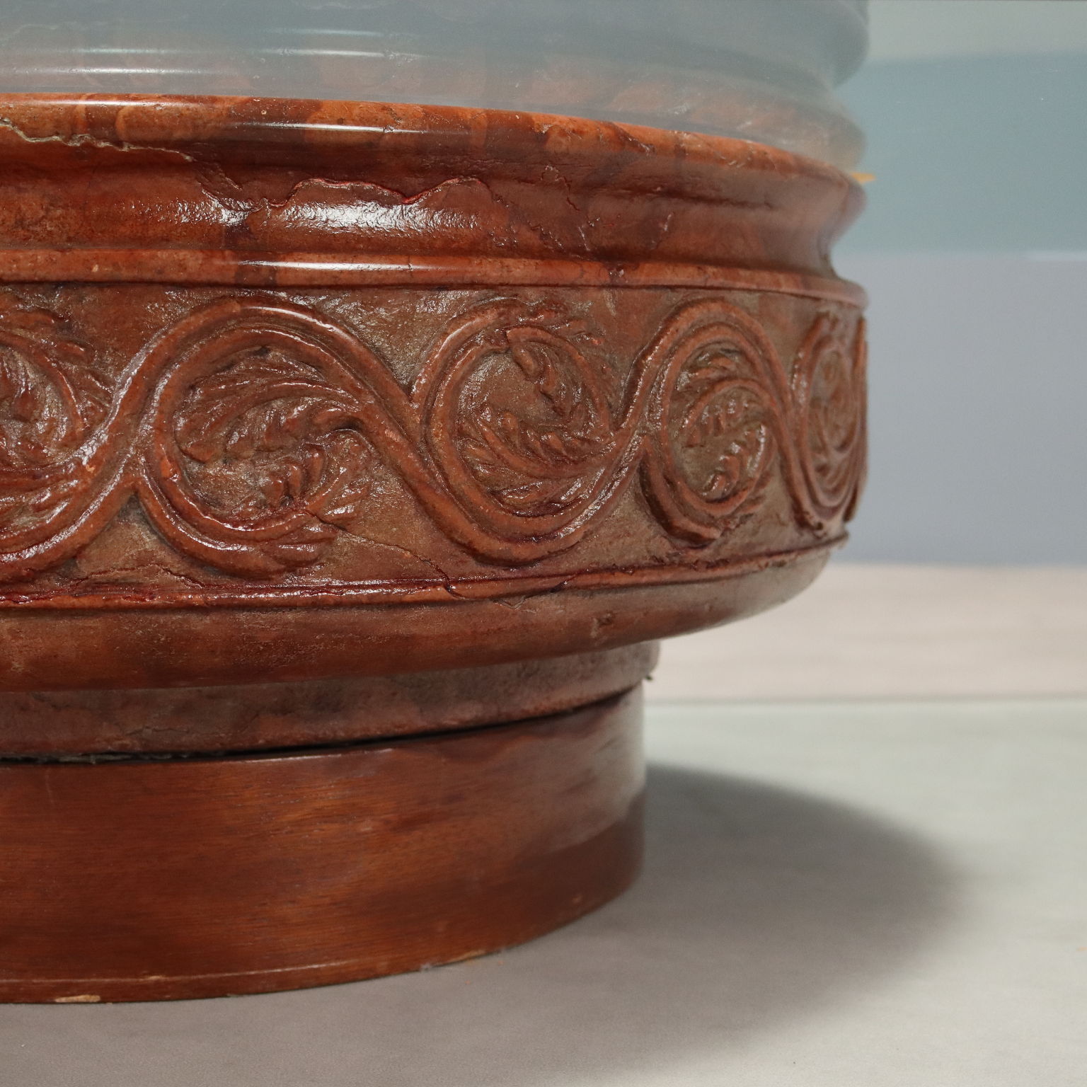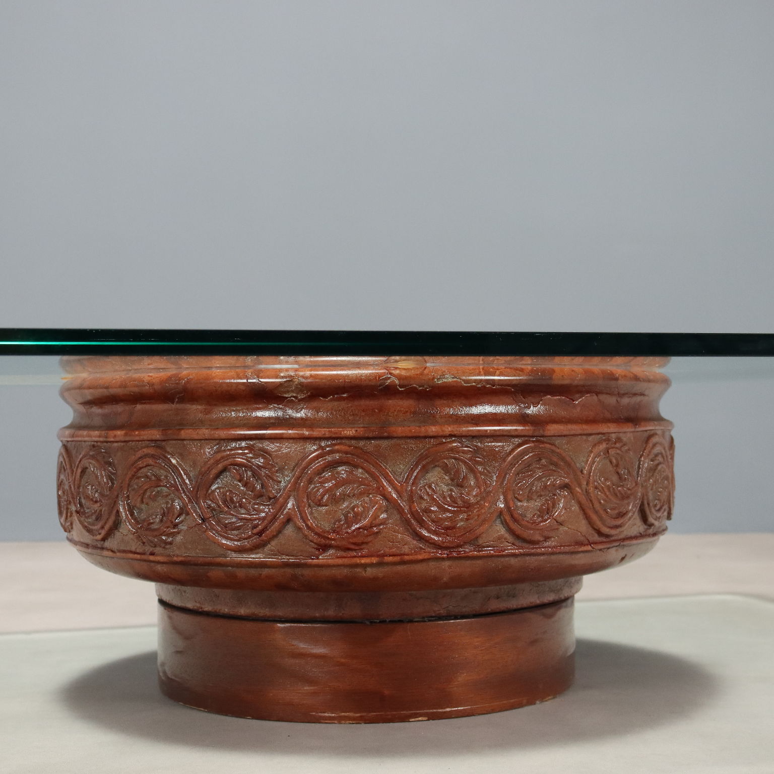 Coffee table with a tempered, beveled glass top. The base is a marble-finished terracotta vase, embellished on the outside with a sculpted band of circular leaves. Italy, 20th century.