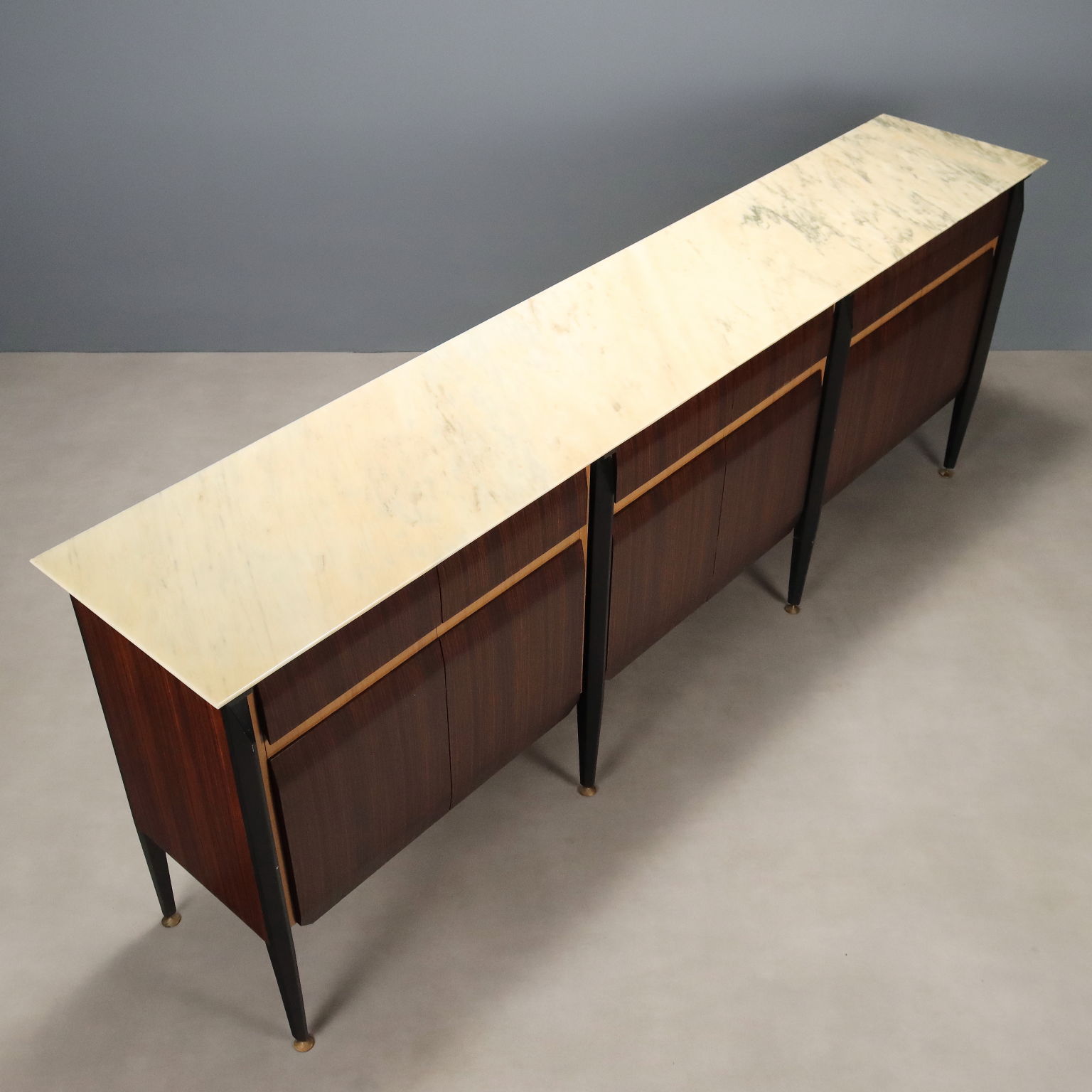 Elegant vintage sideboard with exotic wood veneer and laminate inserts, featuring a white marble top, hinged doors that conceal shelves and drawers, eight stained wooden legs with brass feet.