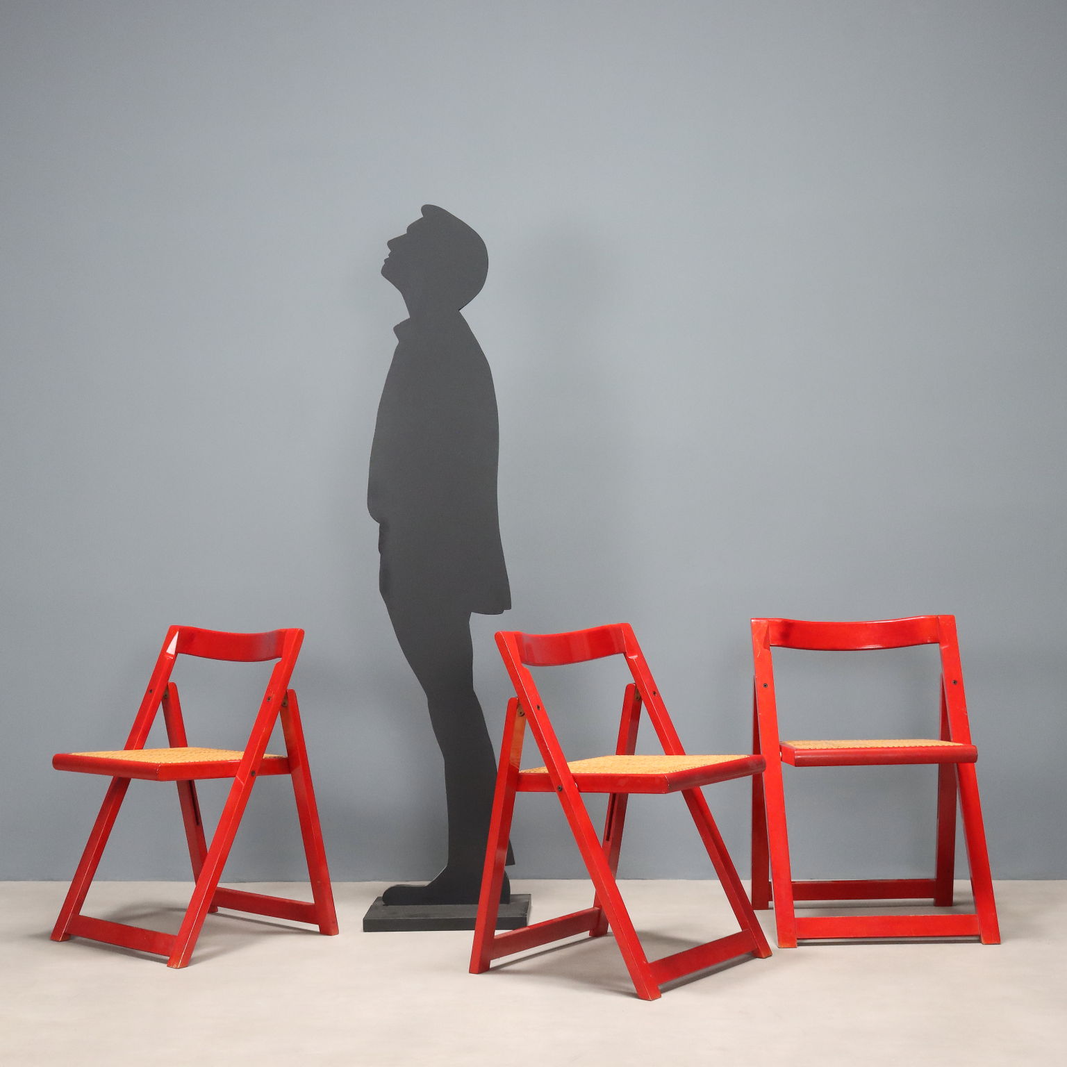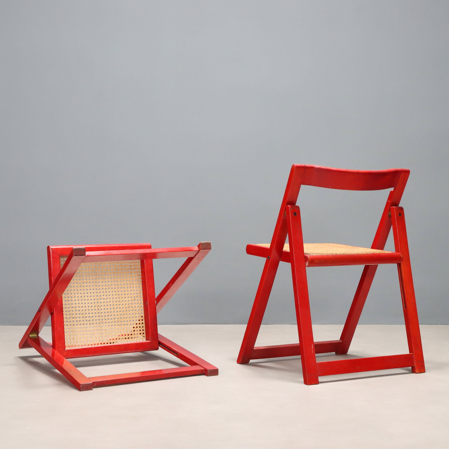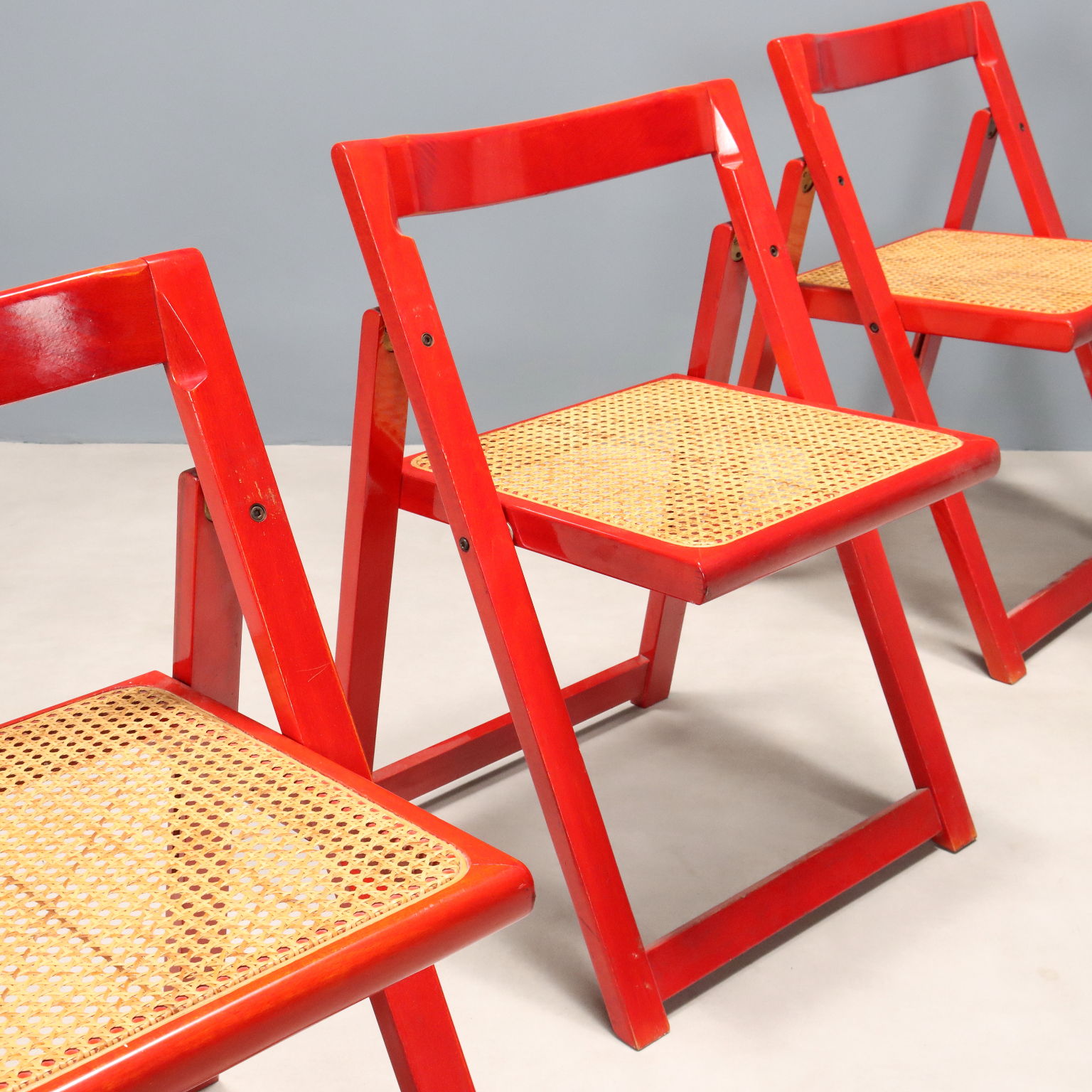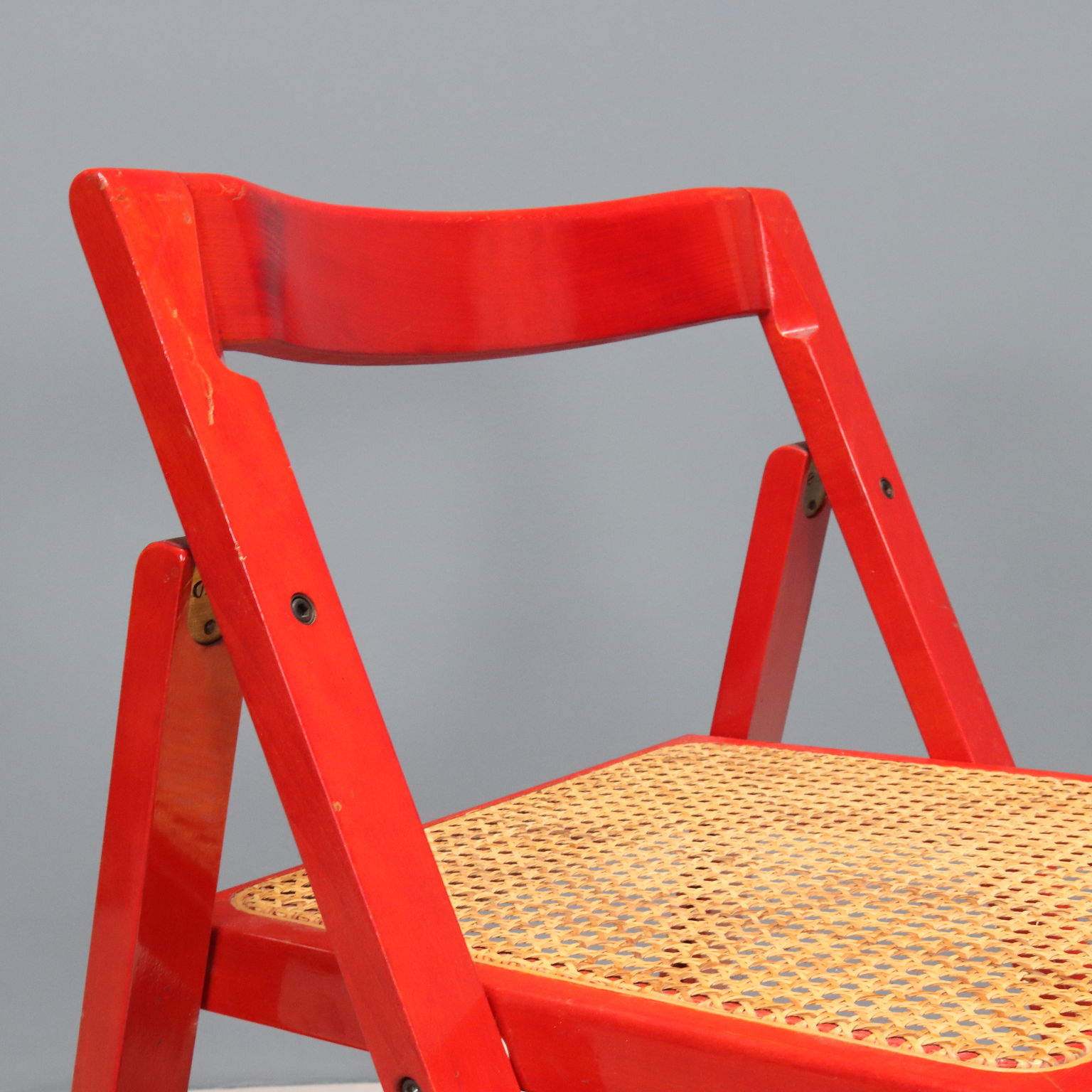 Folding chairs with red lacquered wooden frame and Vienna straw seat.