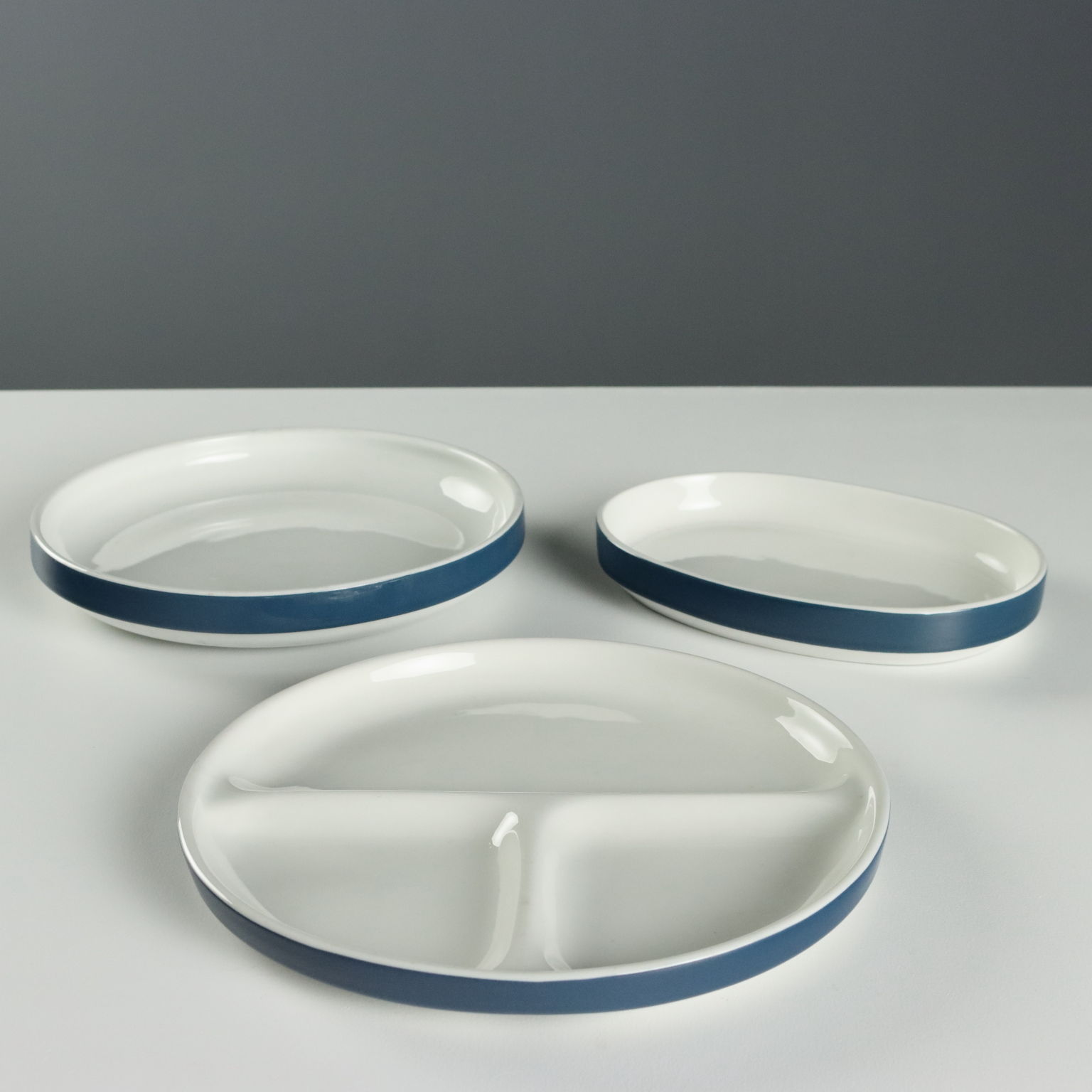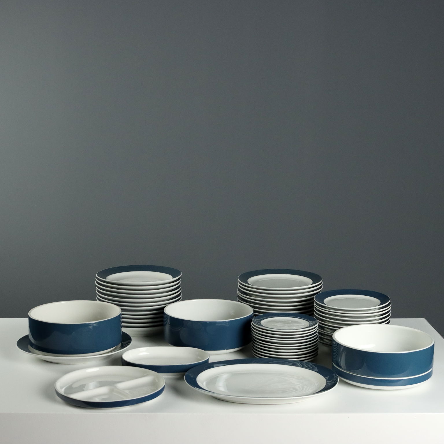 Giovanni Gariboldi "Colonna" dinnerware set for Richard Ginori. The fine blue and white porcelain set includes: 12 dinner plates, 12 soup plates, 12 dessert plates, 12 side plates, 3 bowls, and 5 serving plates.