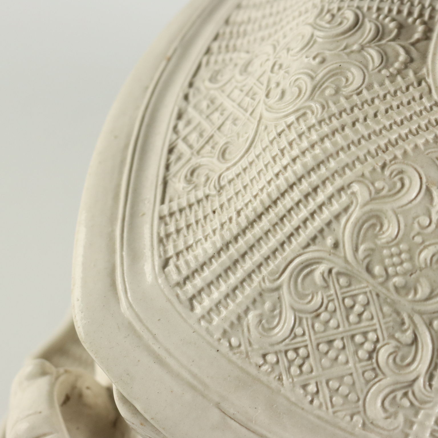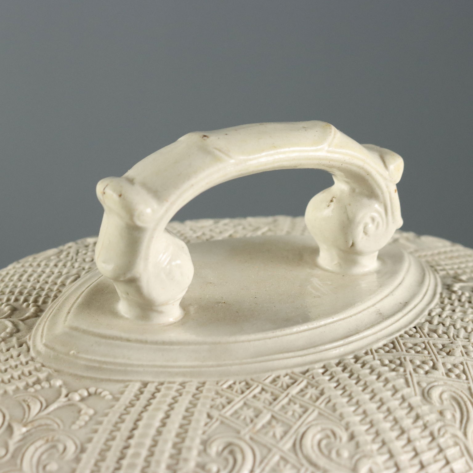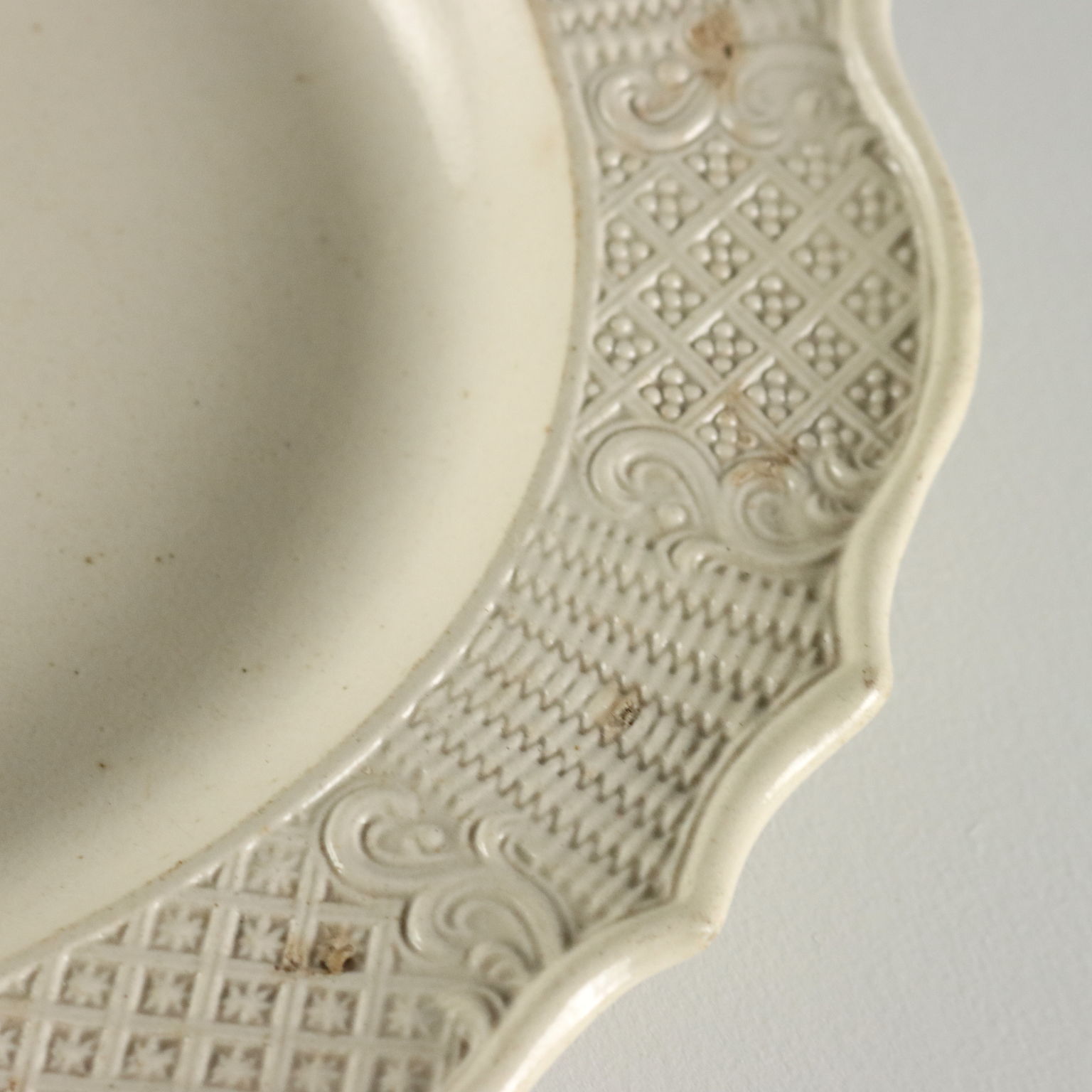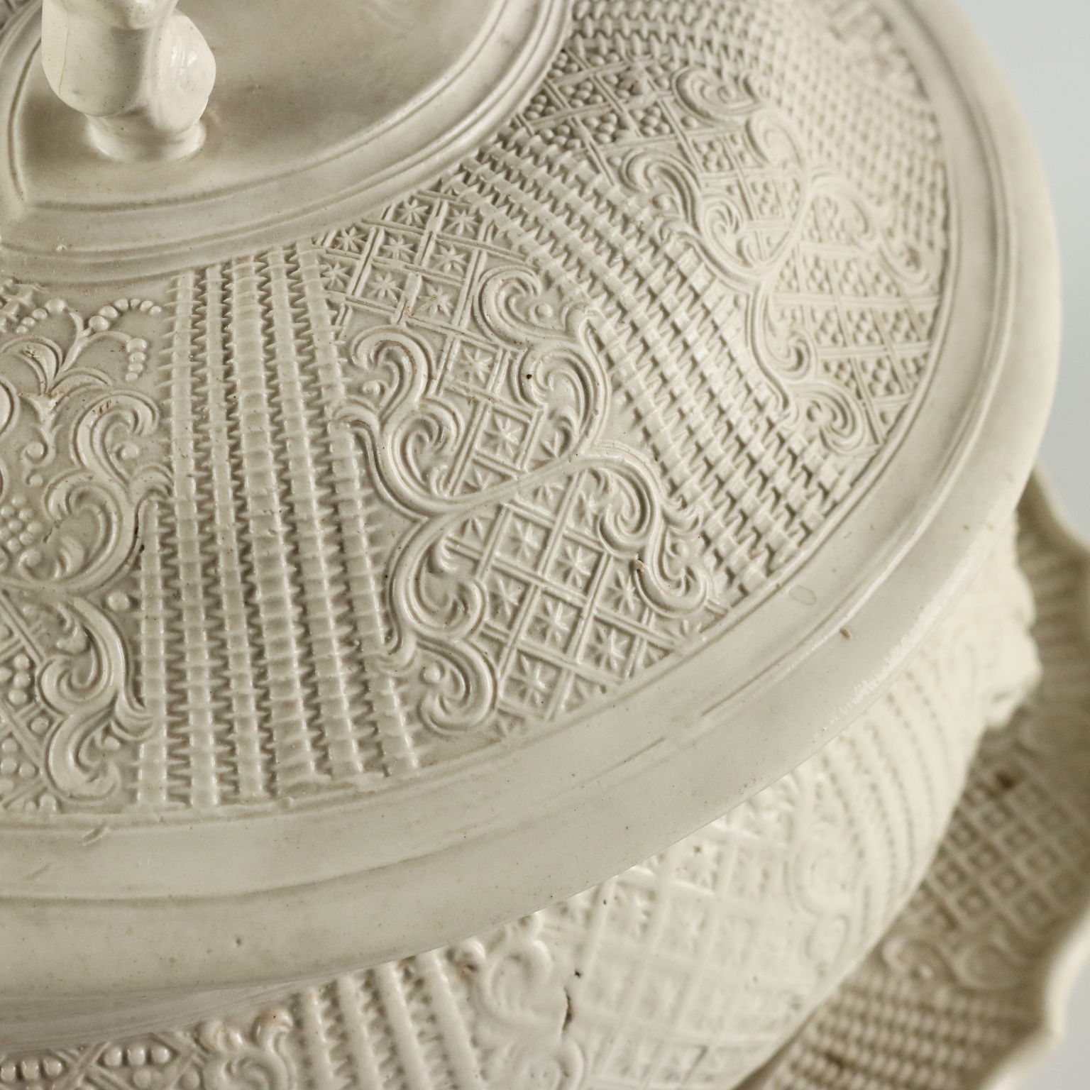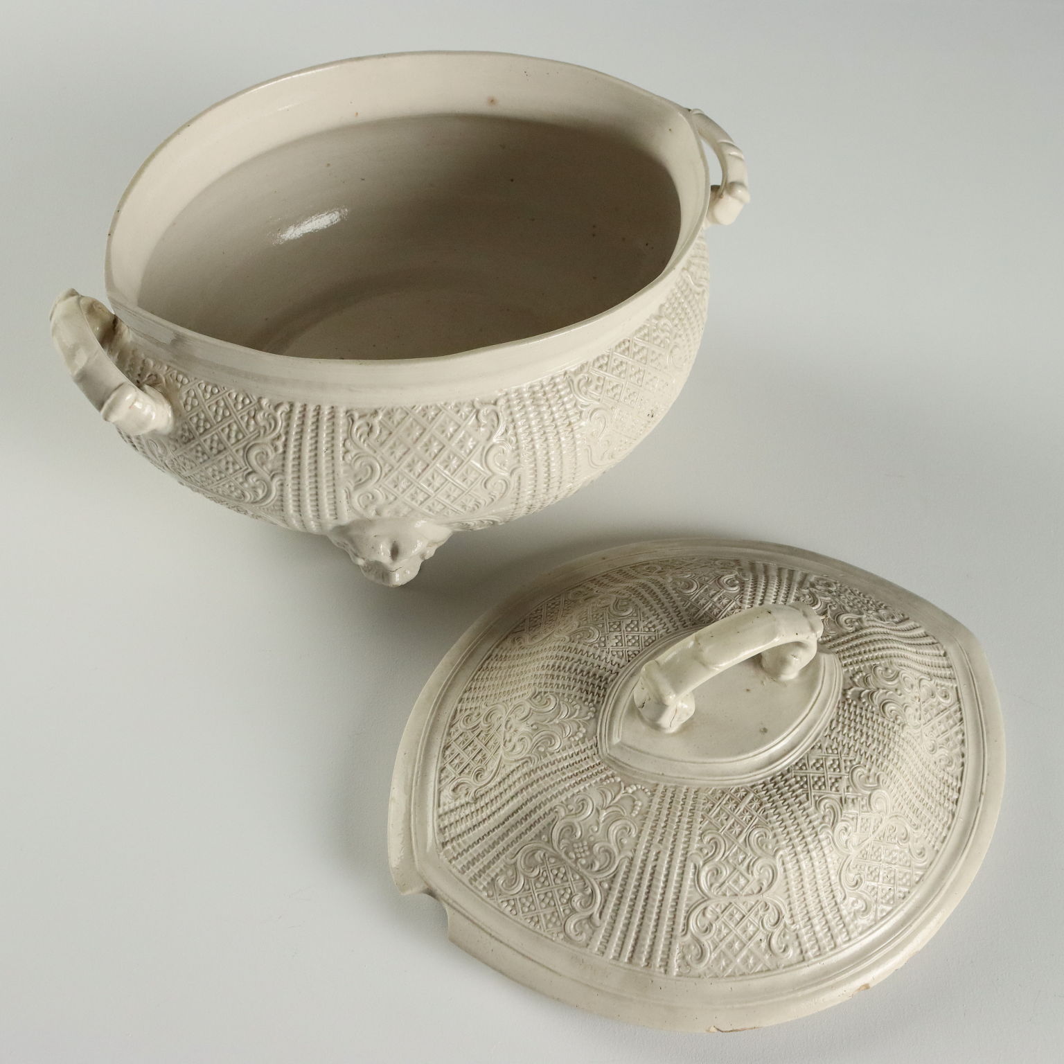 Oval earthenware tureen and plate with a strong vitreous component, engraved with basket motifs and plant racemes.
