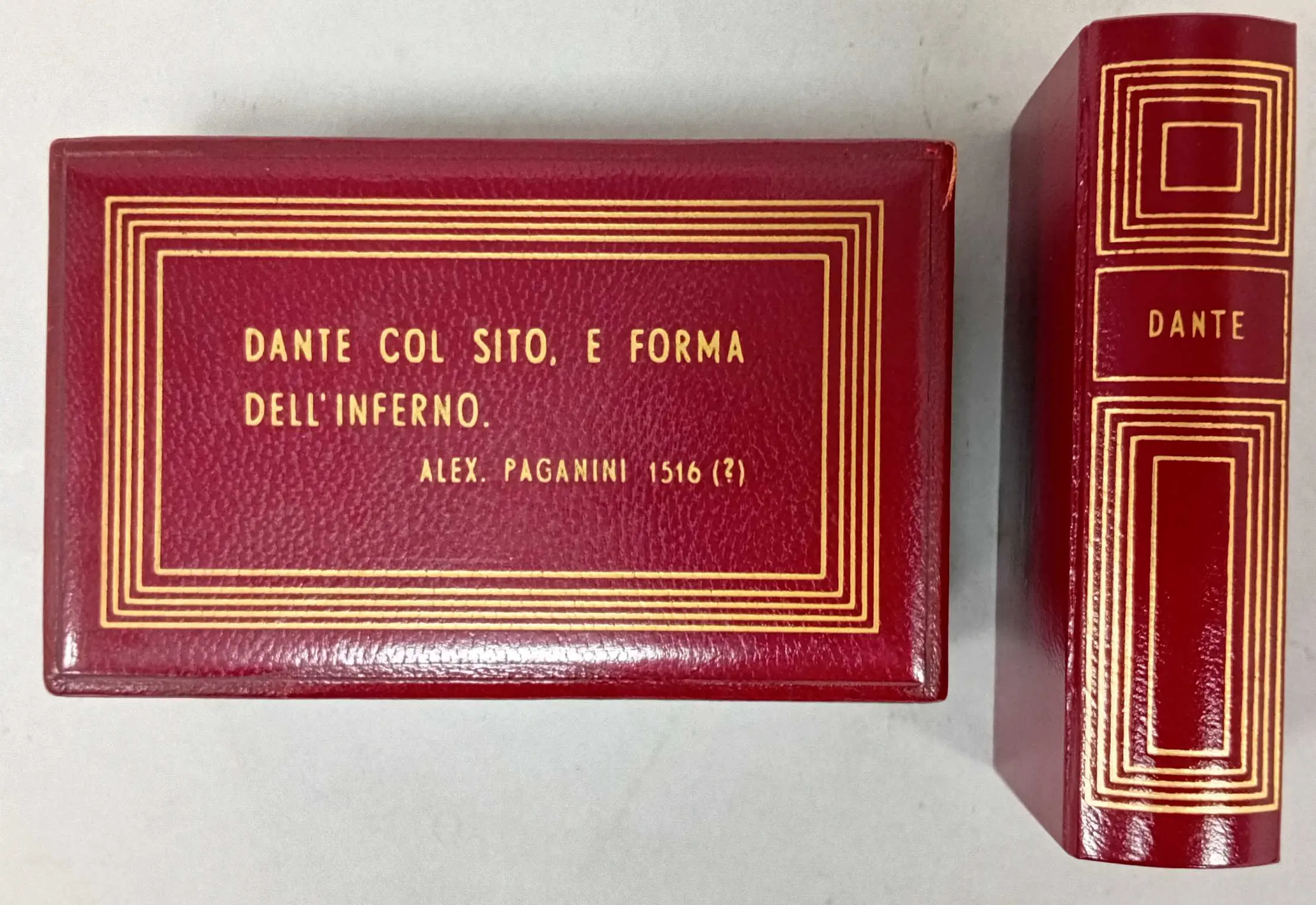 Edition edited by Roberto Peliti. Facsimile reproduction of the first edition of the Divine Comedy in a very small format (twenty-fourth), printed in Venice in 1516 by Alessandro Paganini. The copies are numbered; ours is number 678. Illustrated with four plates (one of which is a double-page spread) at the end of the volume, created by the famous Venetian cartographer and engraver Giovanni Andrea Vavassore.